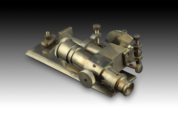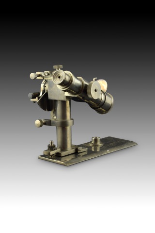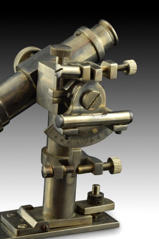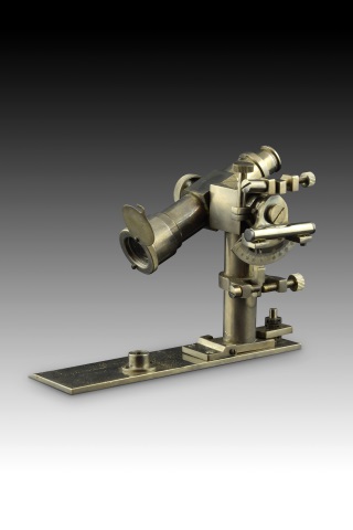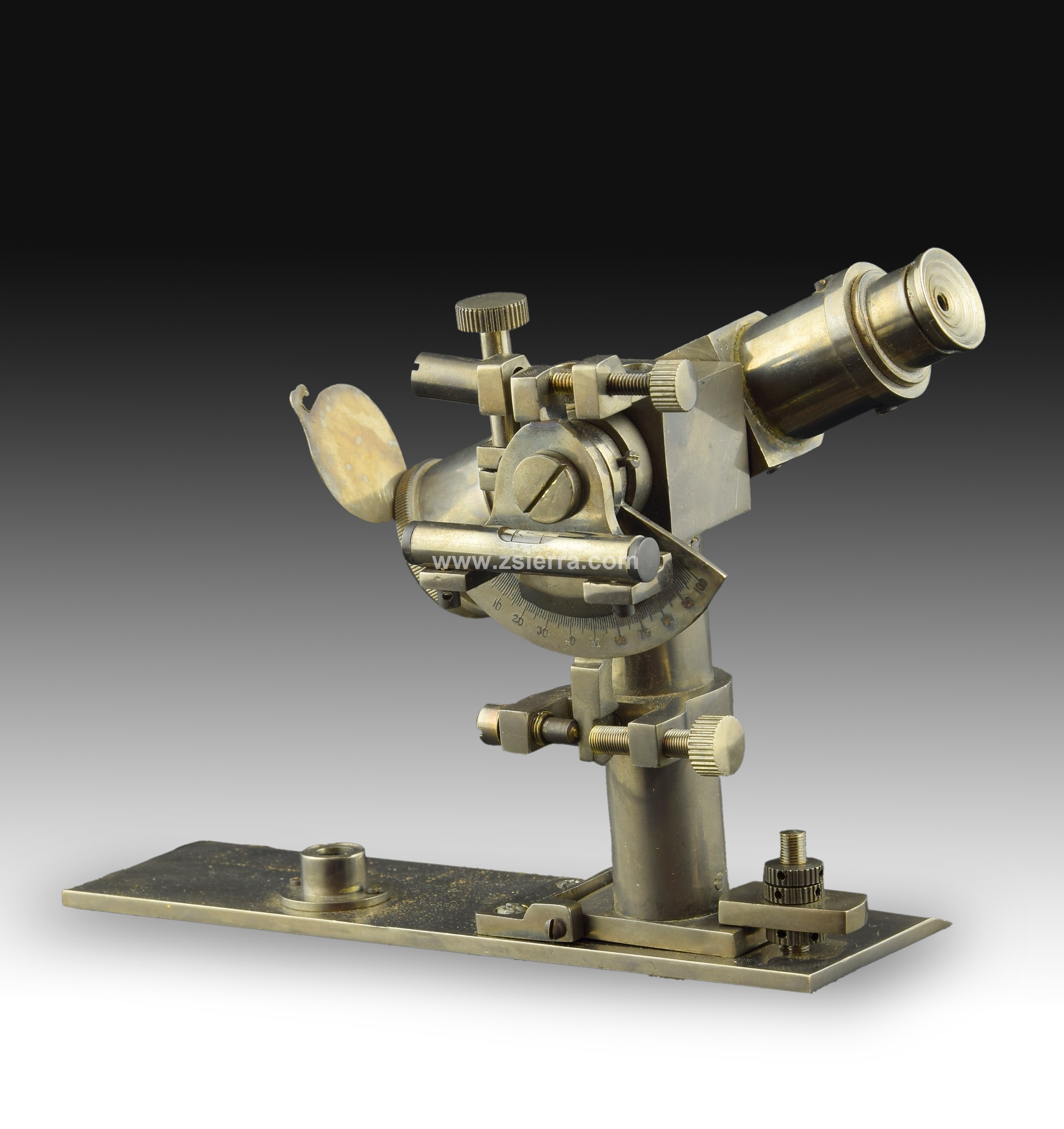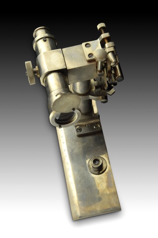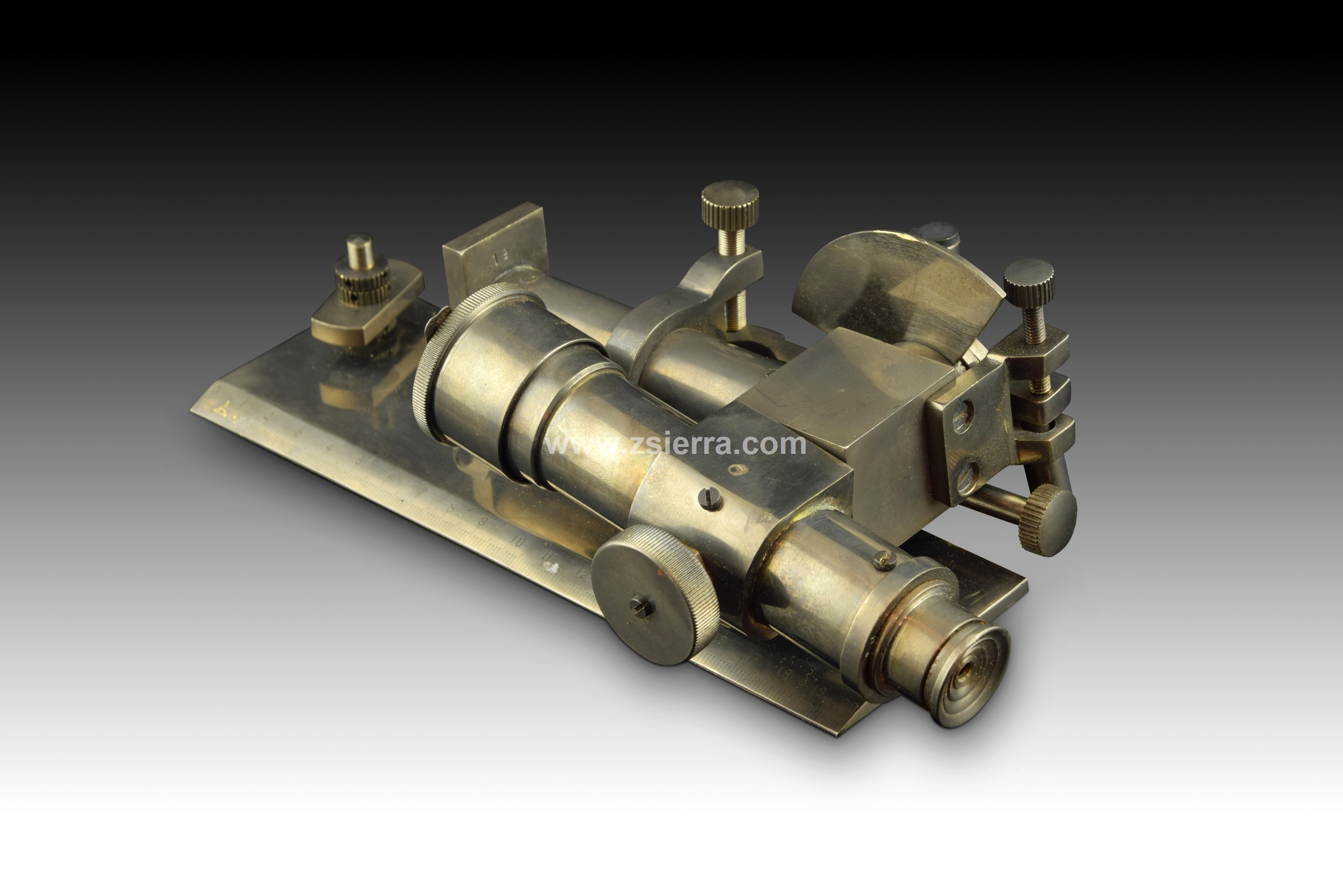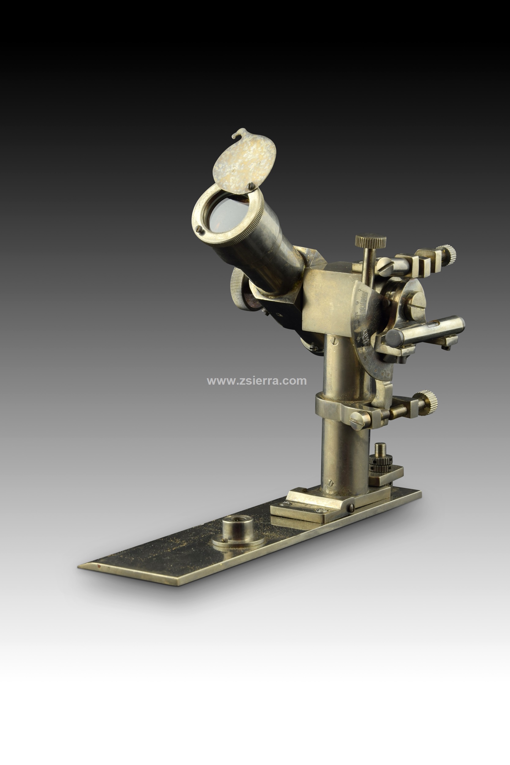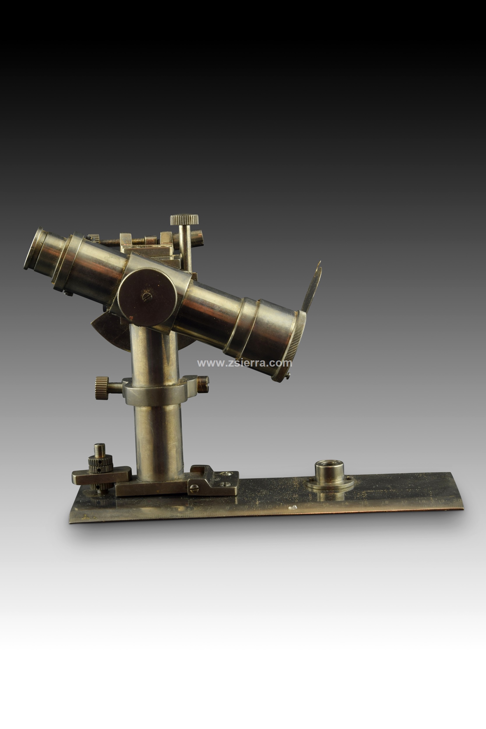 Visor on a rectangular base in silver metal. A viewfinder mounted on an axis with a scale for calculating vertical angles, supported by a rectangular plate made of silver-plated metal. A rotating plate protects the lower lens, and several screws allow the telescope to be moved. Weight 1710 grs. Inspired by 19th century models