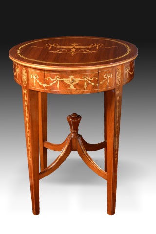 Circular table with Adam-type marquetry. The four legs supporting the piece of furniture are joined by lower jambs that converge in a central oval topped by a vase shape. The fronts of the legs, the jambs, the waist (where the drawer is located) and the top are decorated with Adam-type marquetry (Robert Adam), of classical inspiration and with motifs of vases, garlands and bows.