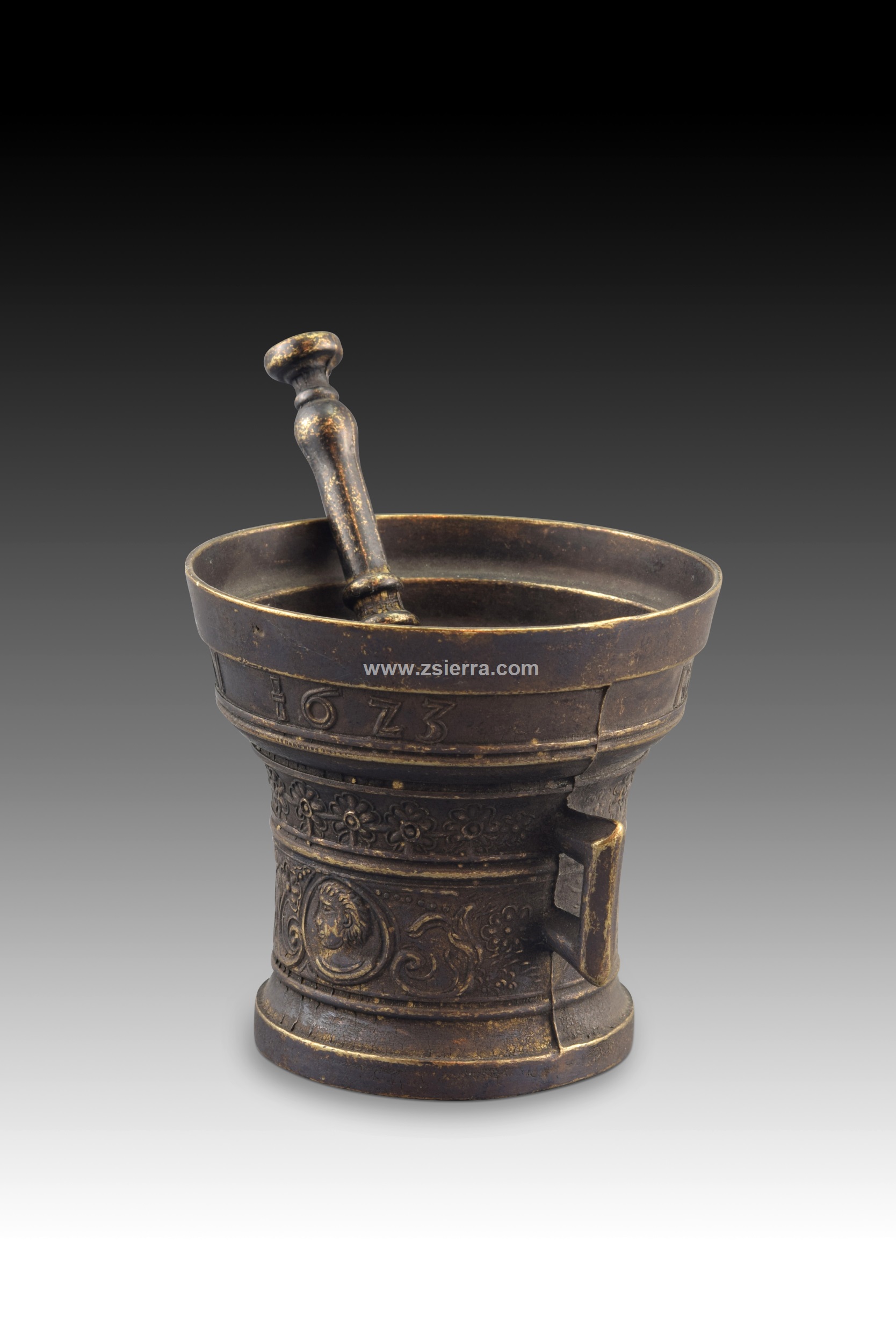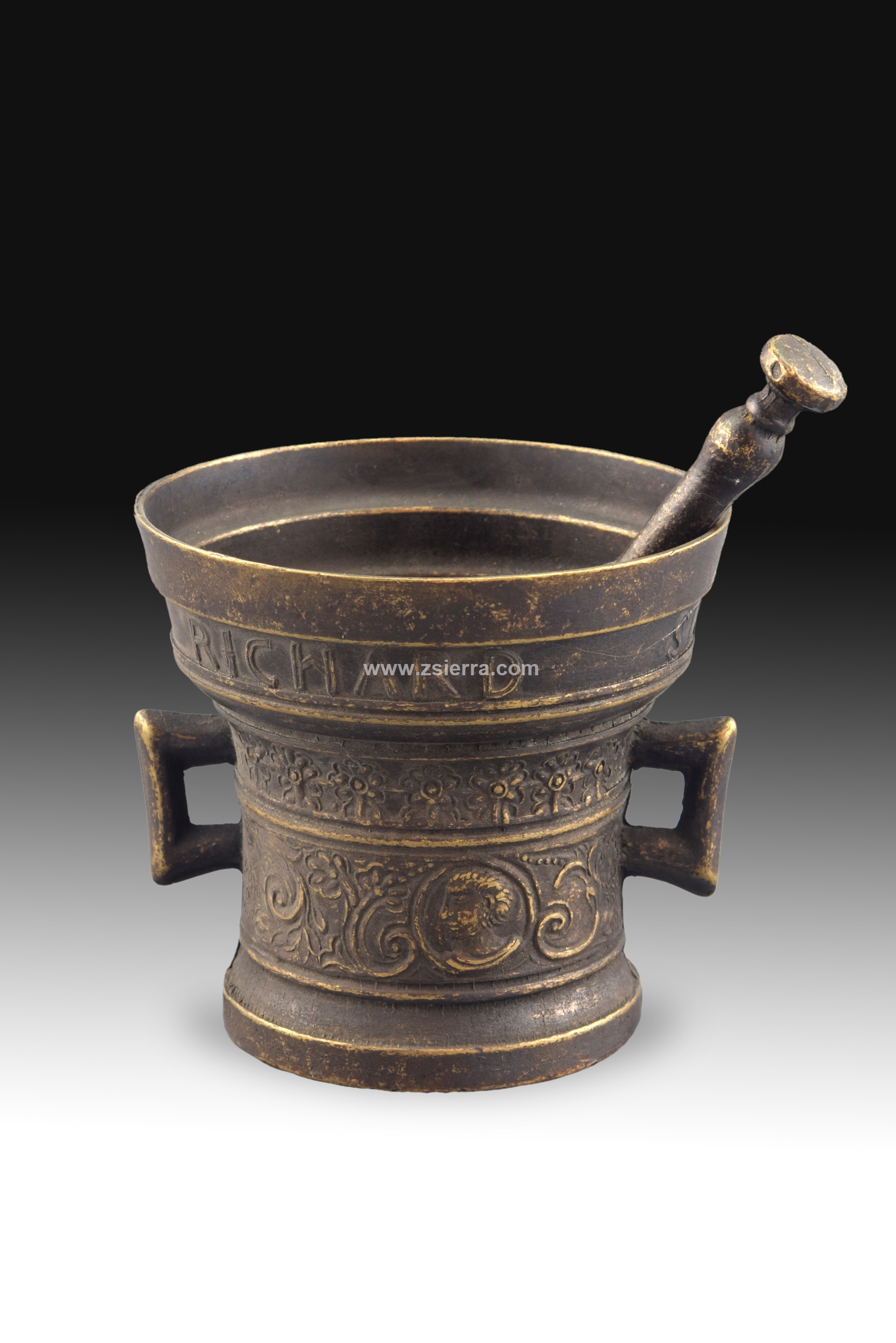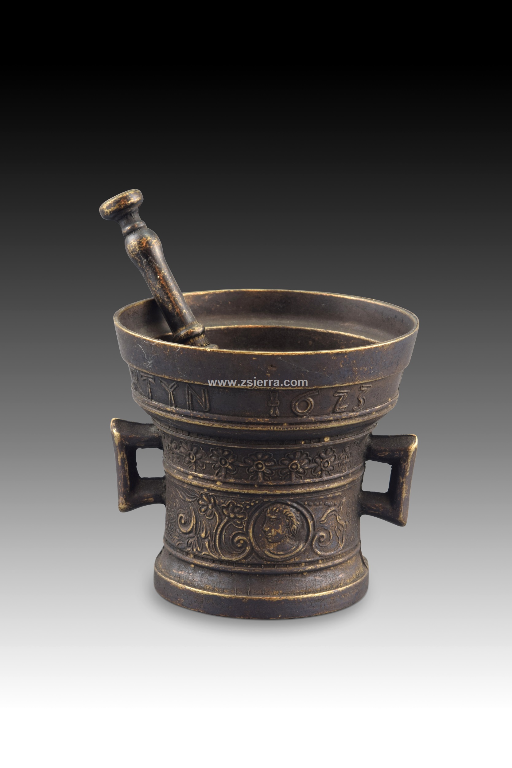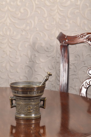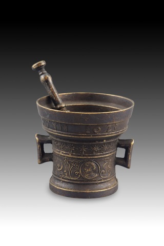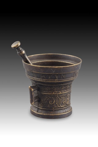 Decorative mortar with pestle. Metal. Mortar with two handles, tubular shape, and flared top, decorated with a series of bands (inscription, plant elements reminiscent of 19th-century Neoclassicism, frieze with scrolls and profiles suggesting Neo-Renaissance influences). The shape and workmanship are reminiscent of earlier works, mortars being objects with a long tradition and similar lines. Weight: 1100 gr