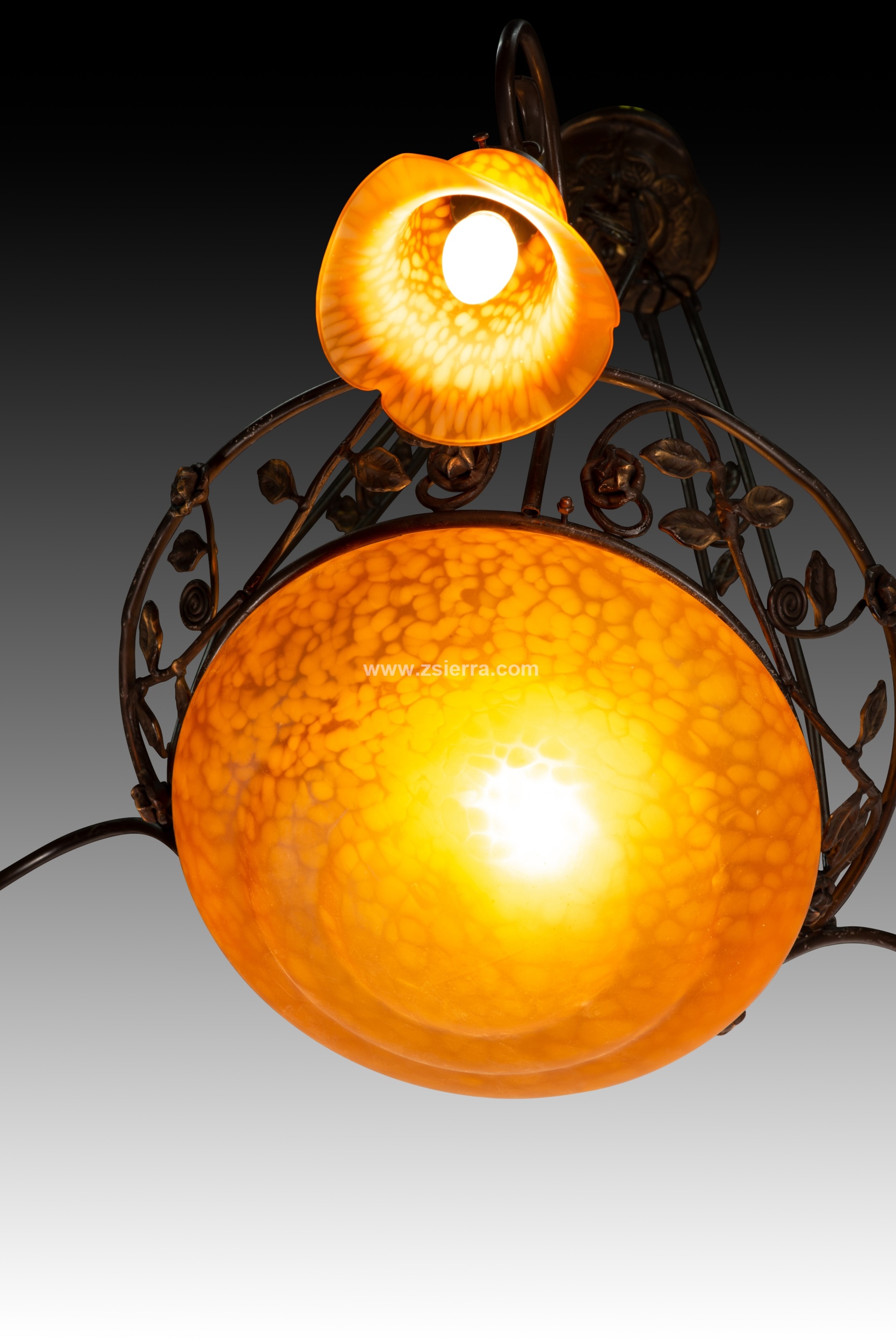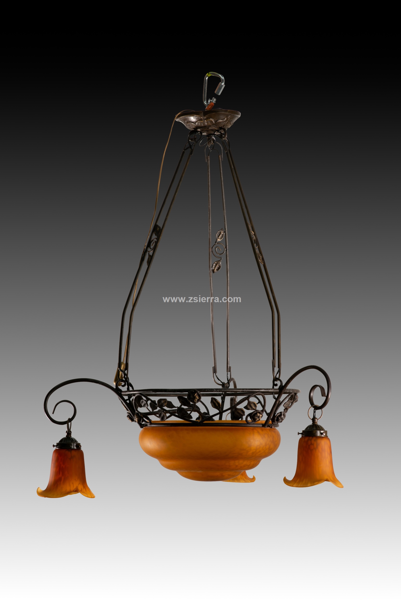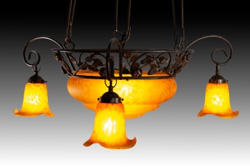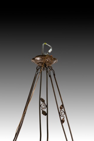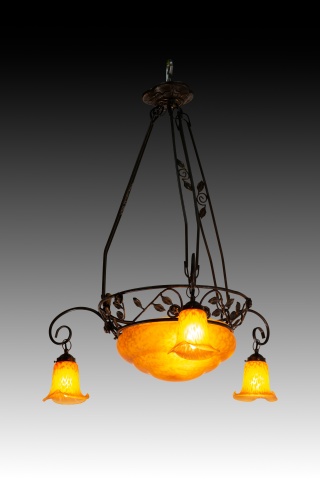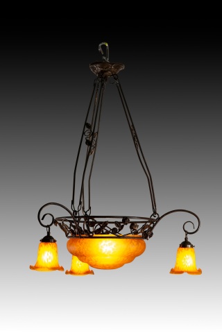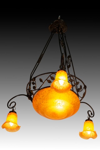 Ceiling lamp. Glass, metal. Ceiling lamp with four lights consisting of a top piece, three openwork bars connecting it to the main body (also openwork, decorated with plant motifs) which features a central circular shade and three simple curved arms ending in three more orange, flower-shaped shades. Certain details are reminiscent of early 20th-century works.