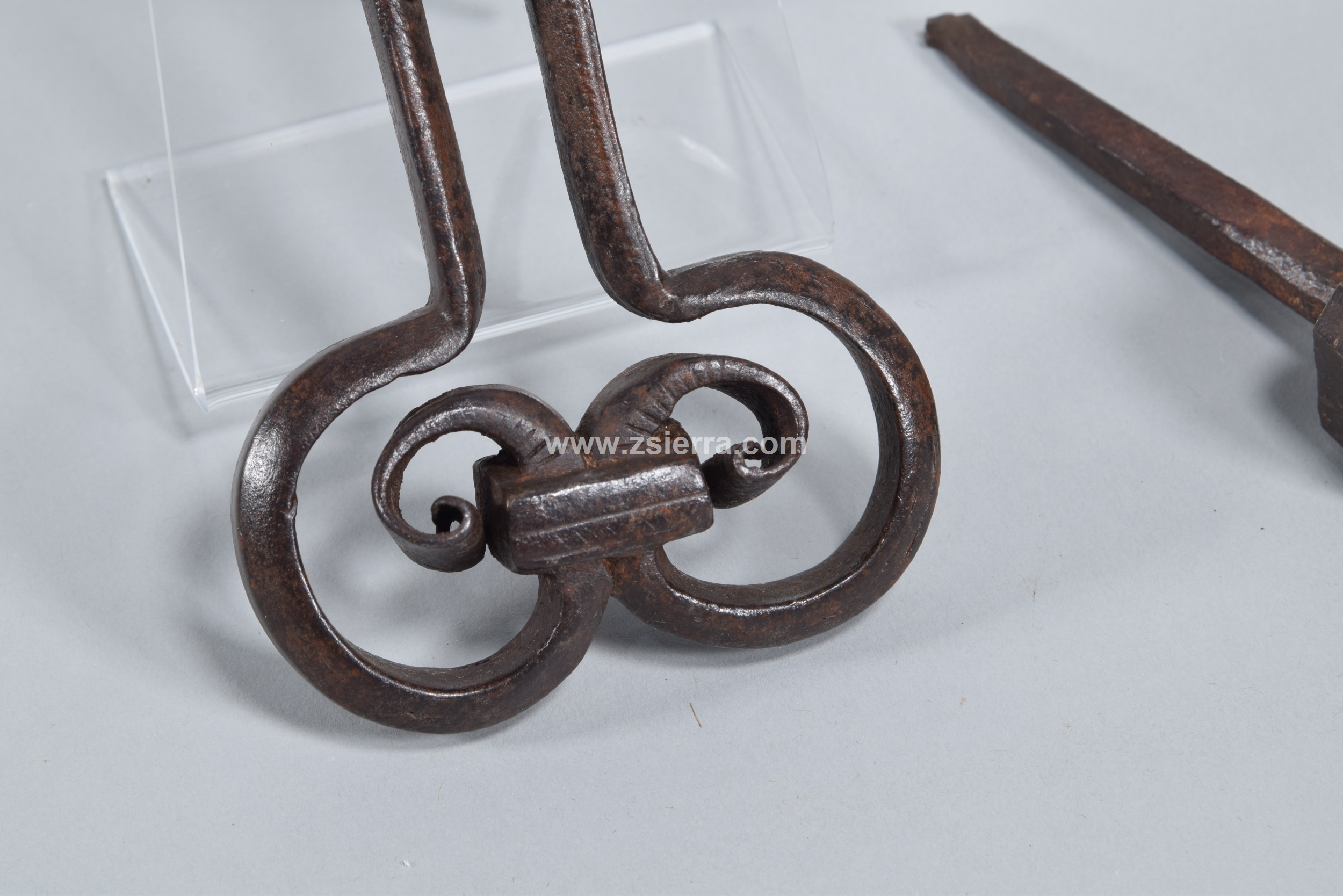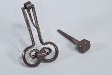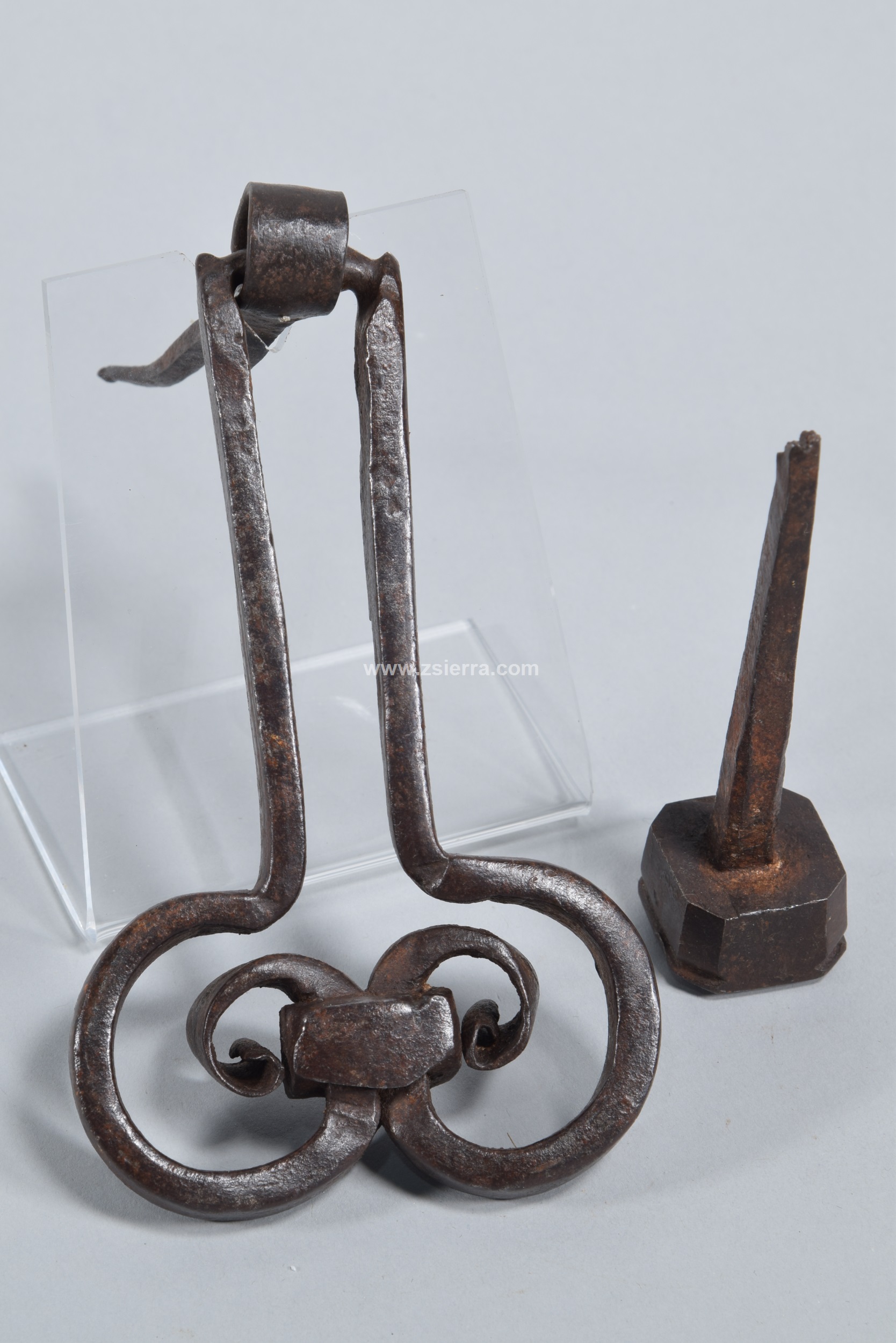 Door knocker. Wrought iron. 16th century. Door knocker made of wrought iron and made up of several pieces, among which the main one stands out. It has two bands that start in parallel and then separate to form two facing volutes joined in this area by a rectangular piece, also showing several engraved lines that highlight these elements. The use of wrought iron volutes was common since Romanesque times, and we can speak of an evolution in this element over time. The present example belongs, due to its shape, to a type of handle or knocker known as “scissor”.