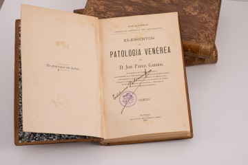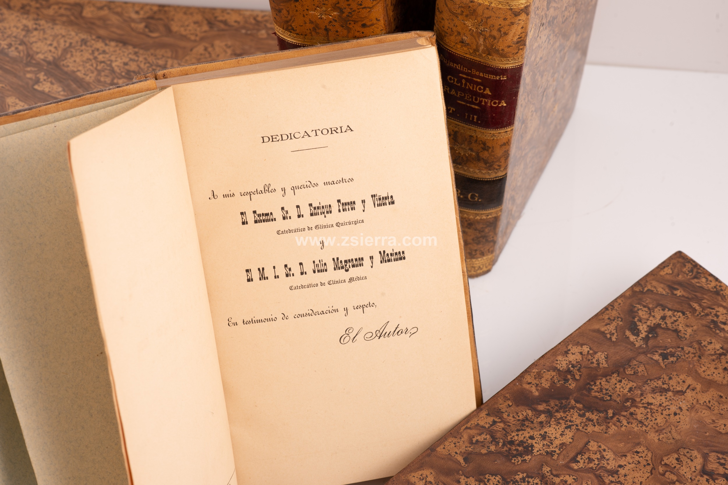 Lot of eight medical books. Spain, 1889-1890. Lot of books, with handwritten inscription, consisting of: -Three volumes, Lectures on therapeutic clinic by Dr. Dujardin-Beaumetz…”. Second Spanish edition, fourth printing. Madrid, Editorial bookstore of D. Carlos Bailly-Bailliere, 1890. -Medical clinic. Clinical lectures given at the Faculty of Medicine of Valencia during the course of 1888 to 1889 by D. Francisco Moliner…”. Valencia, Pascual Aguilar Bookstore, 1889. -Two volumes, Manual of internal pathology by G. Dieulafoy…”. Library of the Journal of Practical Medicine and Surgery. Second corrected and expanded edition. Madrid, Administration of the Journal of Practical Medicine and Surgery, 1889. -Elements of venereal pathology by D. José Pareja Garrido (…). Granada, Imp. of the Widow and Children of Paulino V. Sabatel, 1889. -Diseases of the digestive system by doctors D. Bartolomé Robert (…) and D. Emerenciano Roig y Bofill (…). Library of the journal of practical medicine and surgery. Madrid, Administration of the Journal of Practical Medicine and Surgery, 1889.