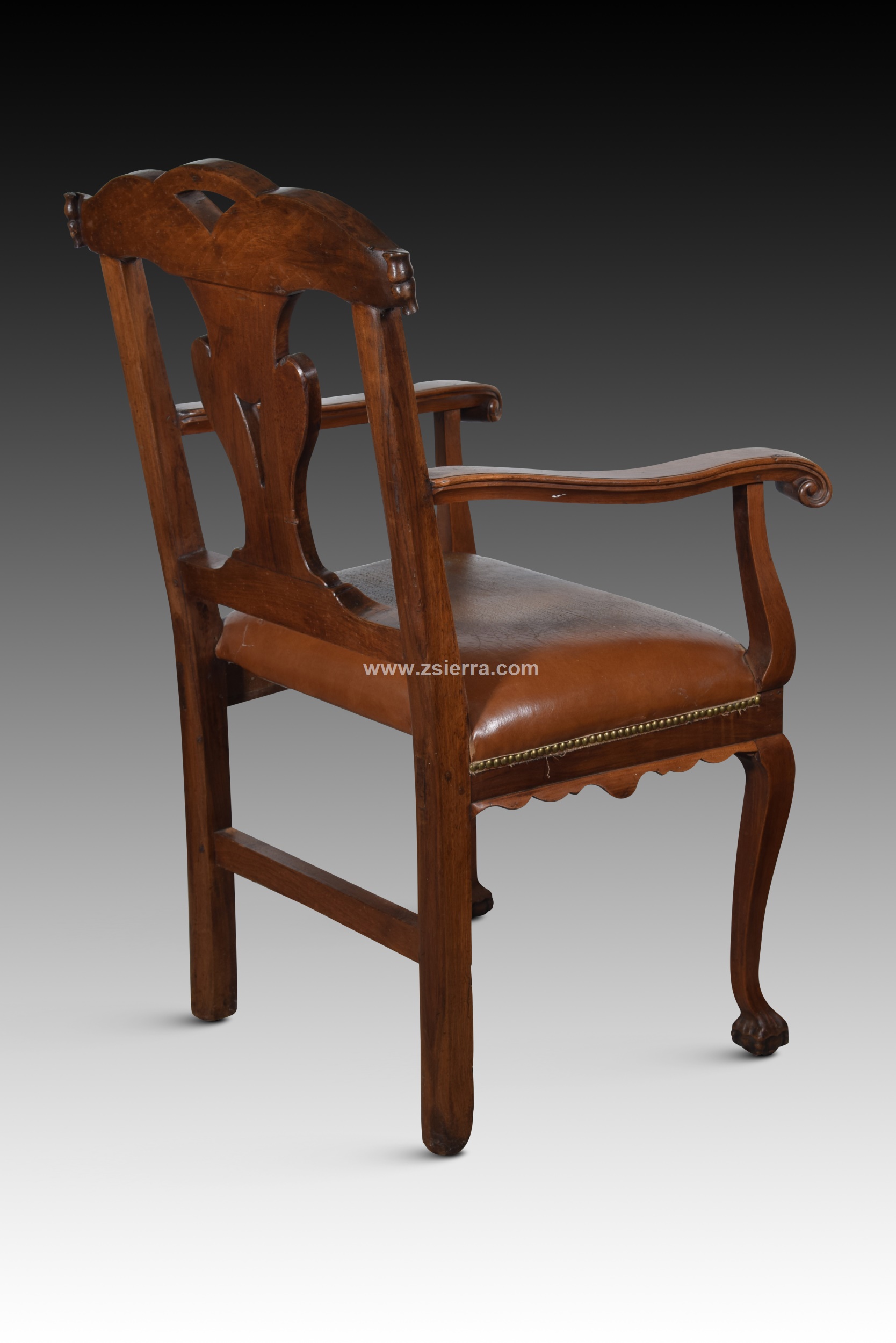 Armchair. Walnut wood, upholstery. Spanish school, 18th century. A carved walnut armchair or chair with an upholstered seat featuring a high, openwork backrest decorated with simplified architectural and plant elements, wavy arms finished in a scroll and joined to the backrest and seat, cabriolet-shaped front legs finished in claws with spheres, and straight rear legs secured with a smooth chamfer. The seat has a cut-out decoration in its lower area. Aesthetically, it is reminiscent in certain details of furniture from the English school, but, as is usual in 18th-century Spanish cabinetmaking, it also shows French influence.