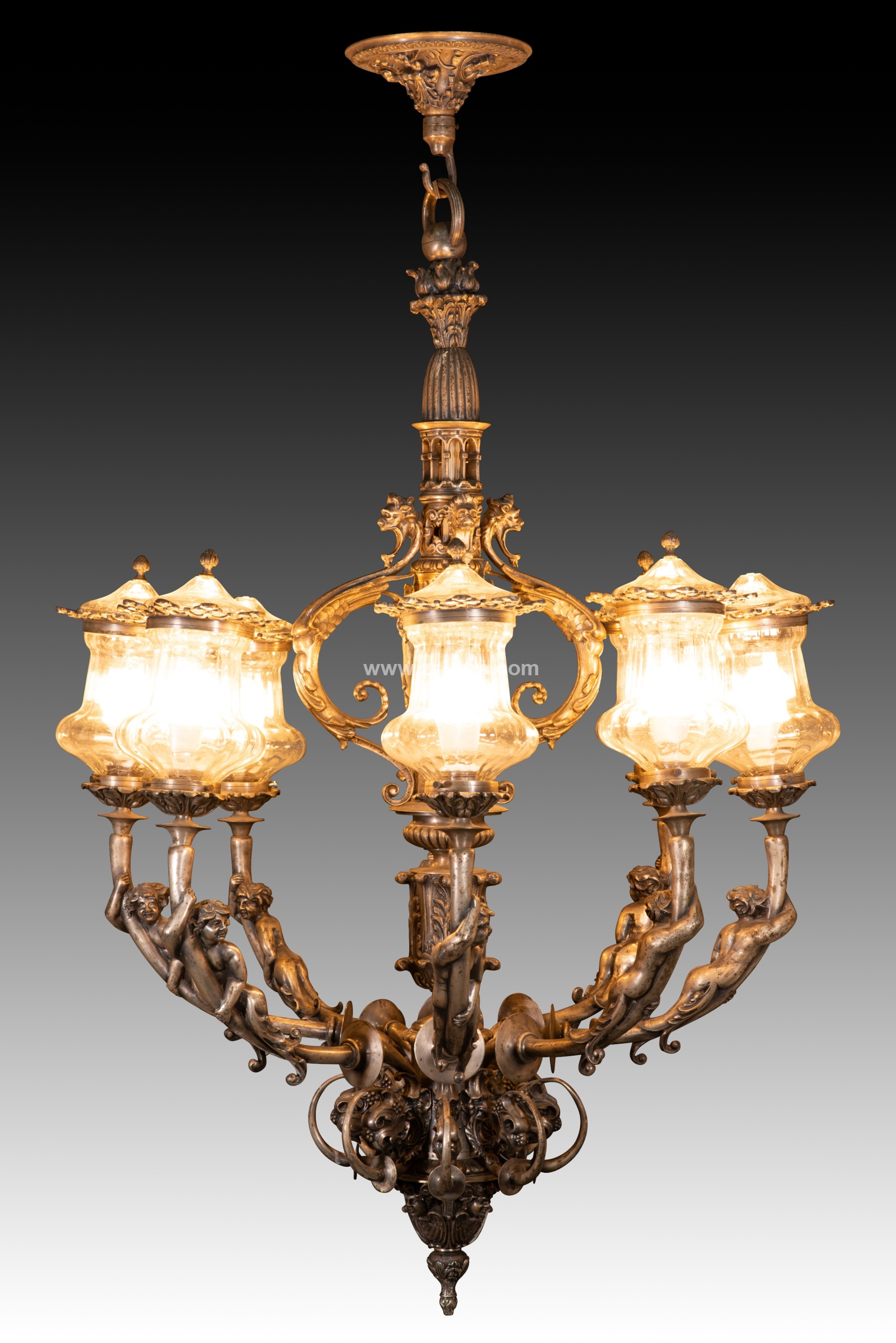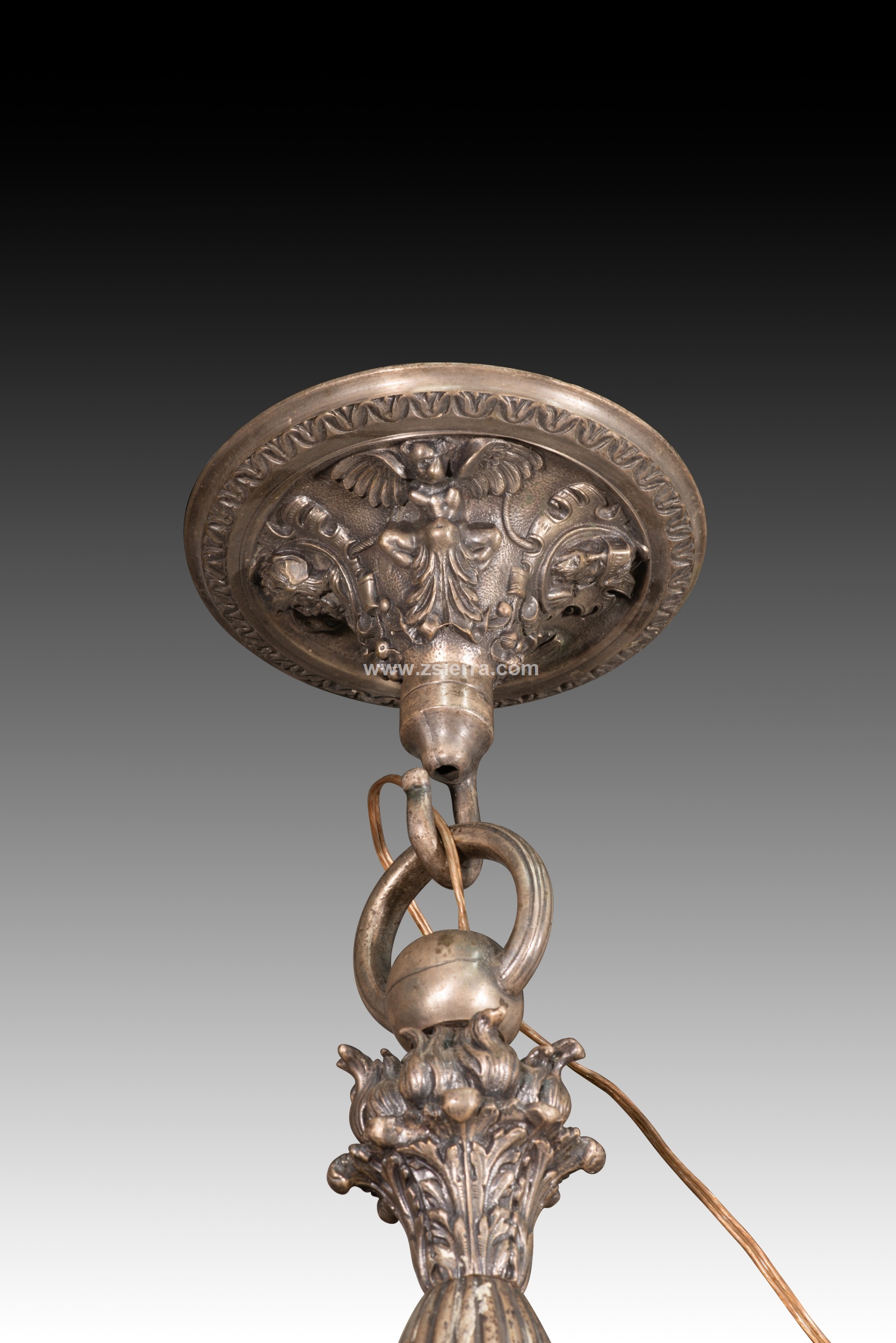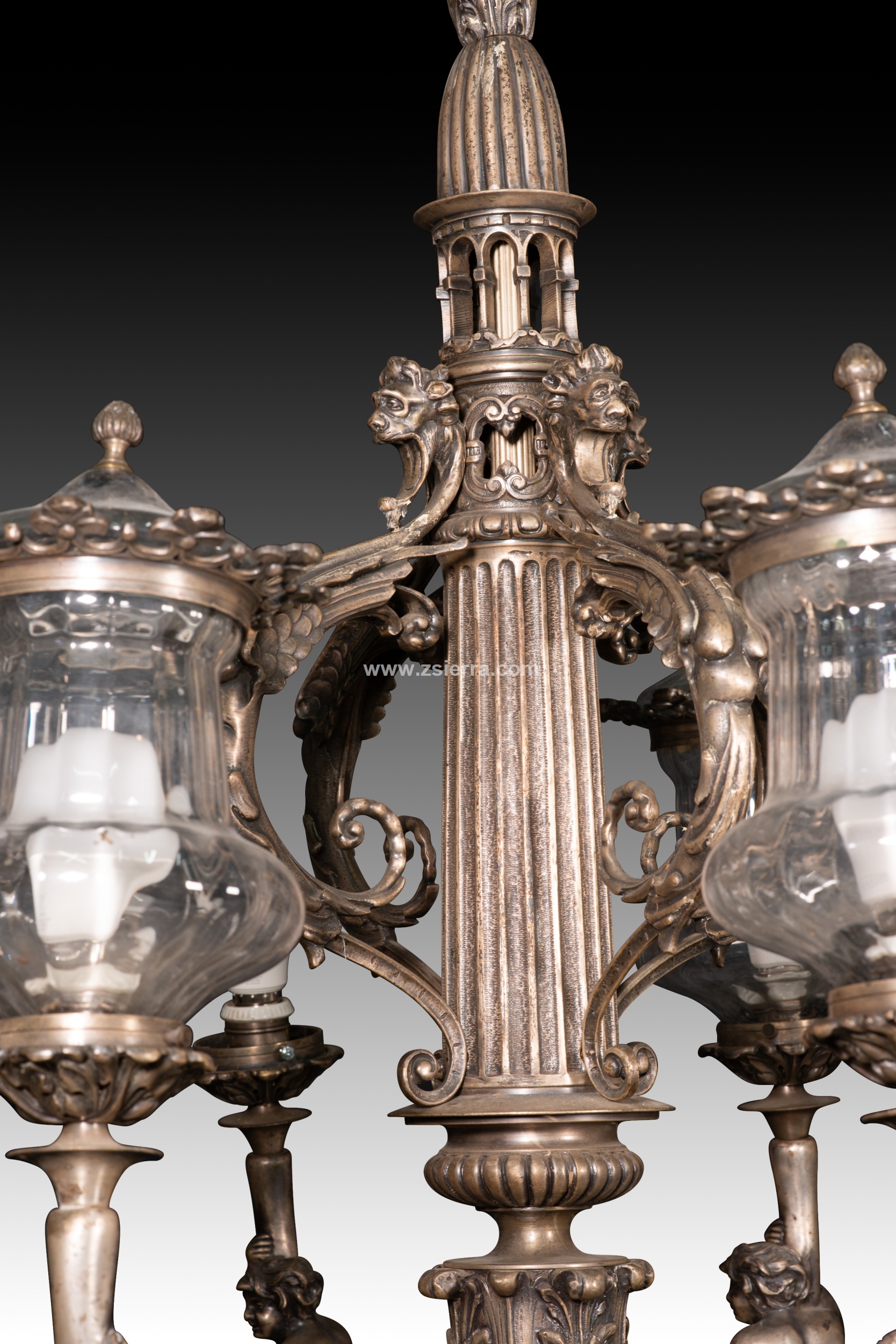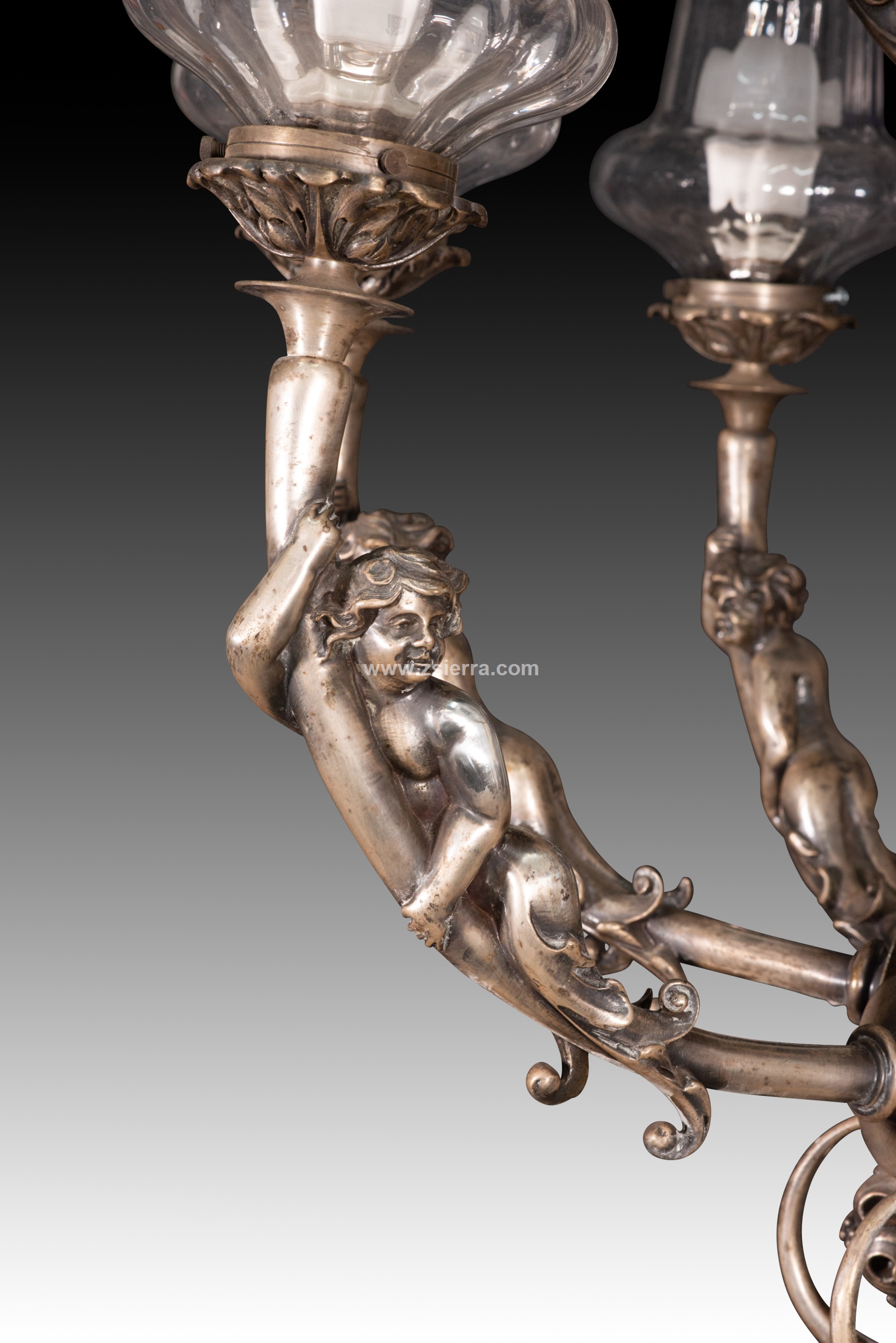 Ceiling lamp. Metal, glass. Circa early 20th century. Bronze chandelier with glass shades decorated with elements of marked classical influence: children's figures with plant forms instead of legs on their arms, scrolls, volutes, grotesques, architectural elements, heraldic elements, etc. Both in its composition and in certain details of these decorative motifs it is reminiscent of works linked to Neoclassicism of the 19th century and later works. 1 tulip is missing
