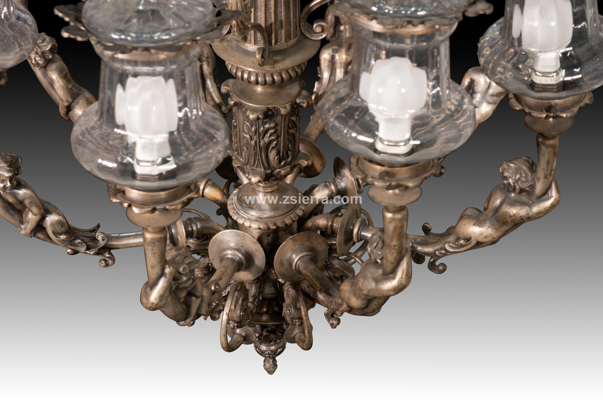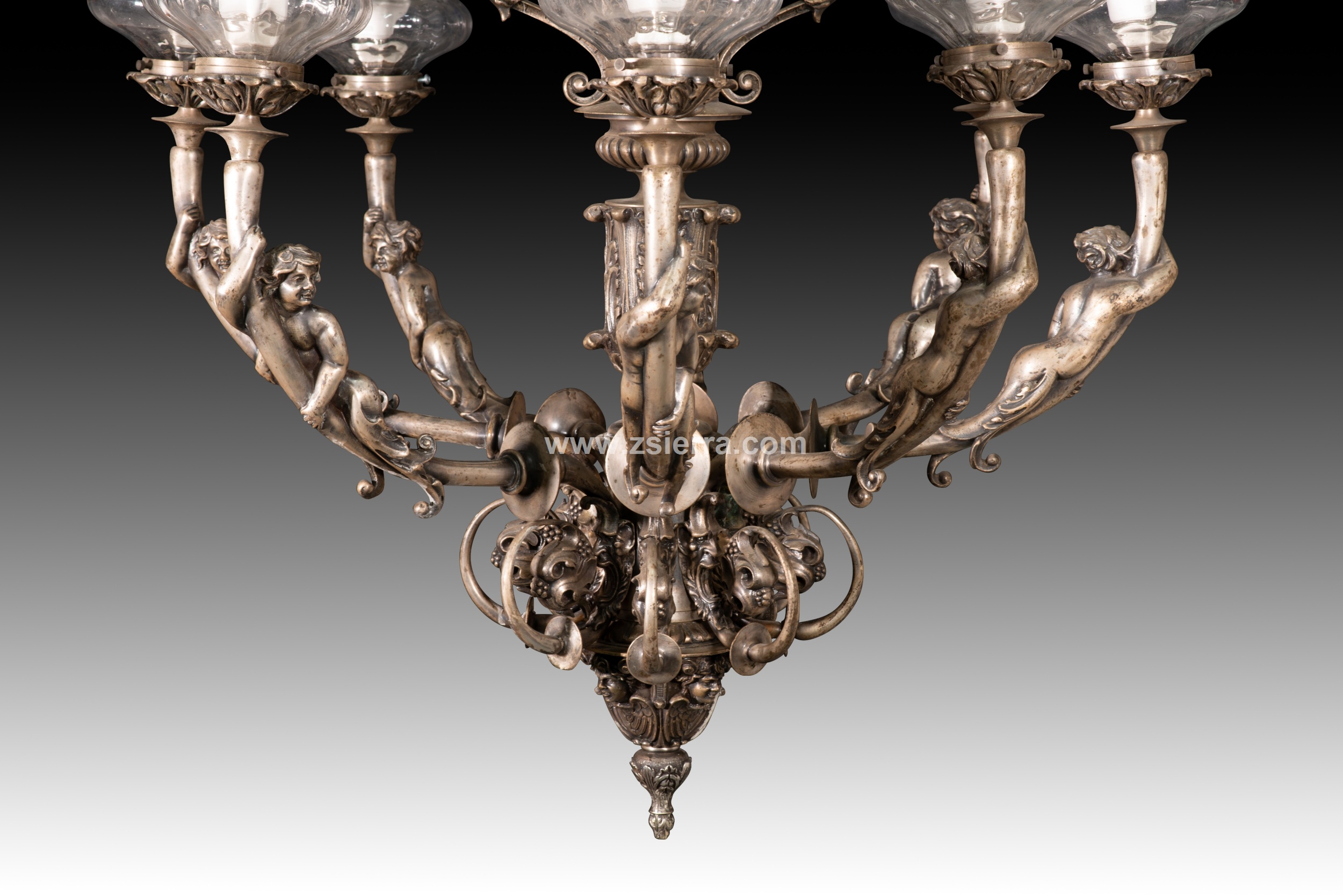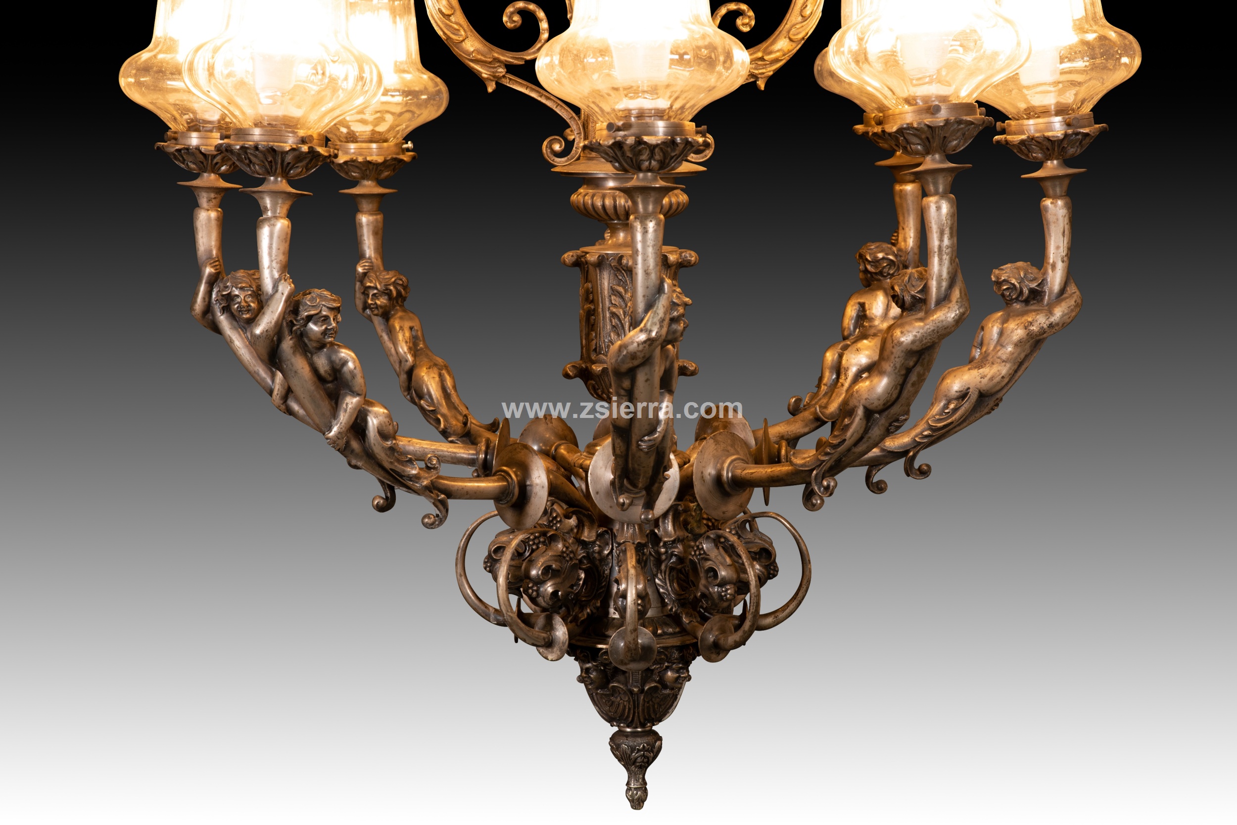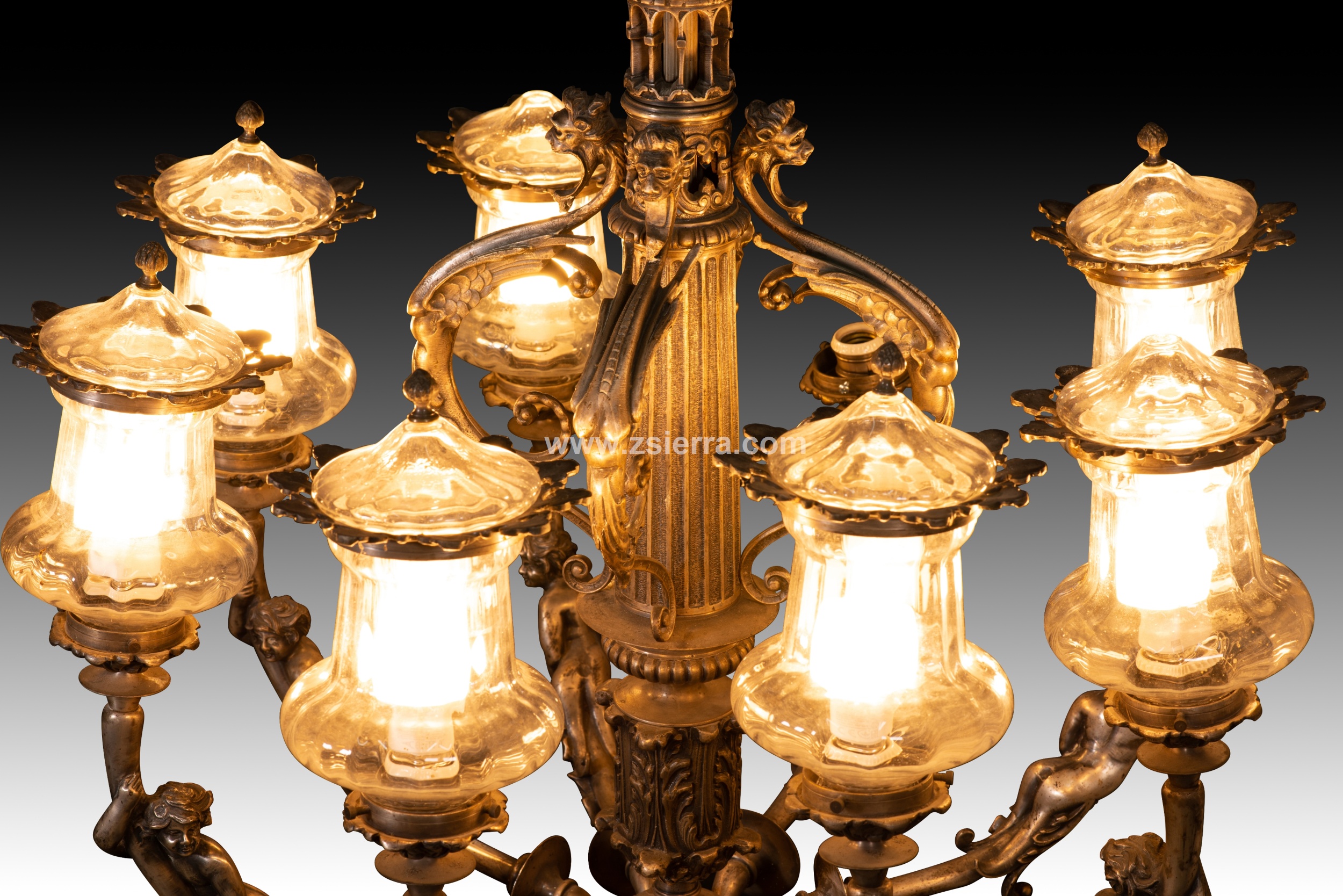 Ceiling lamp. Metal, glass. Circa early 20th century. Bronze chandelier with glass shades decorated with elements of marked classical influence: children's figures with plant forms instead of legs on their arms, scrolls, volutes, grotesques, architectural elements, heraldic elements, etc. Both in its composition and in certain details of these decorative motifs it is reminiscent of works linked to Neoclassicism of the 19th century and later works. 1 tulip is missing