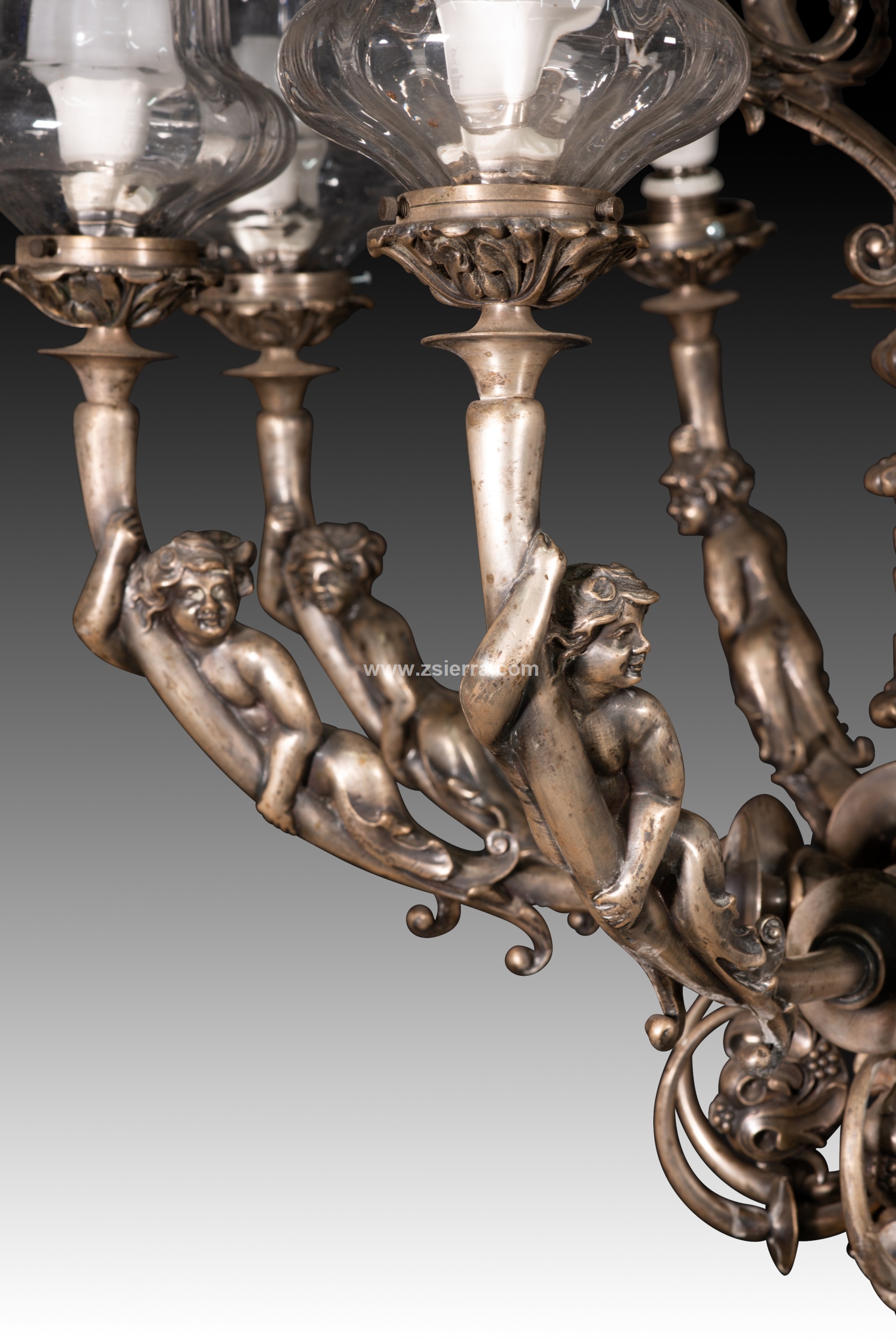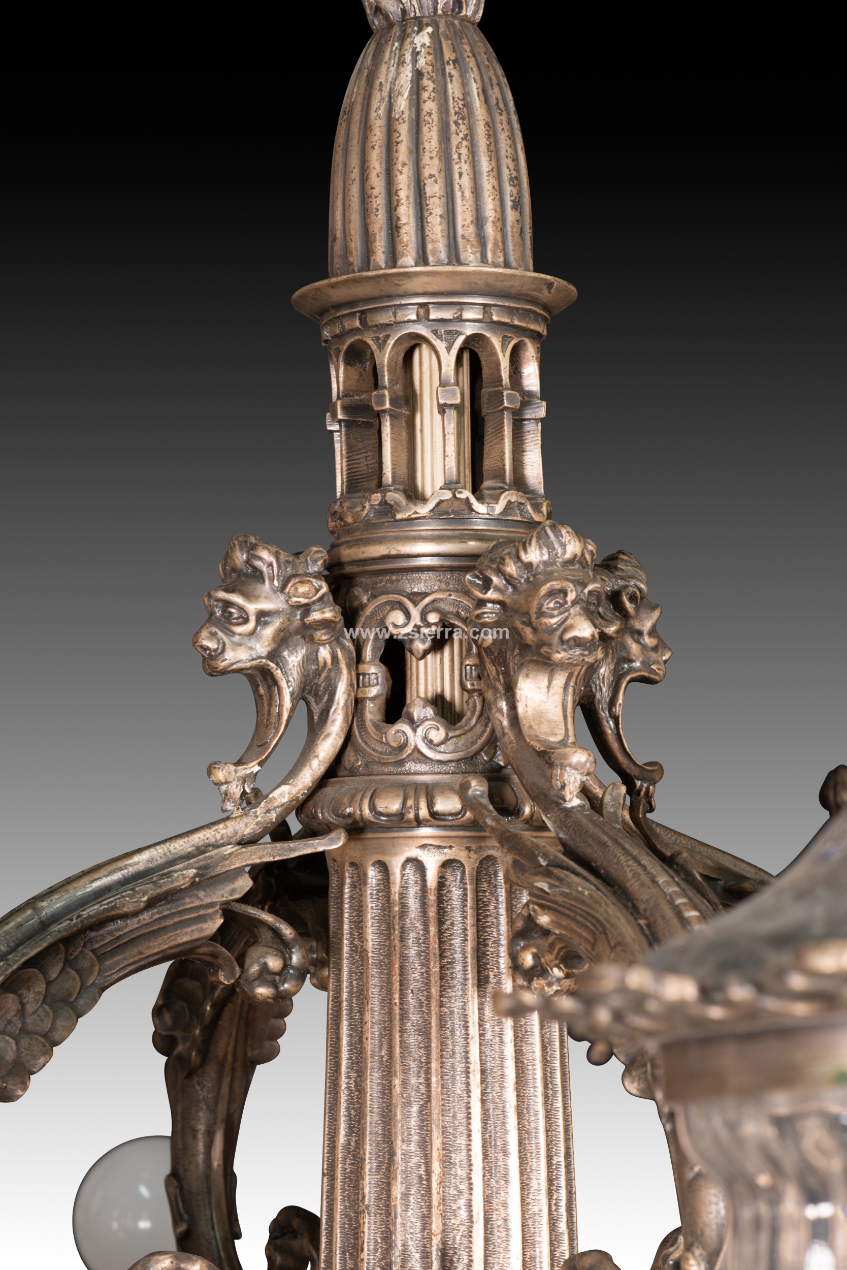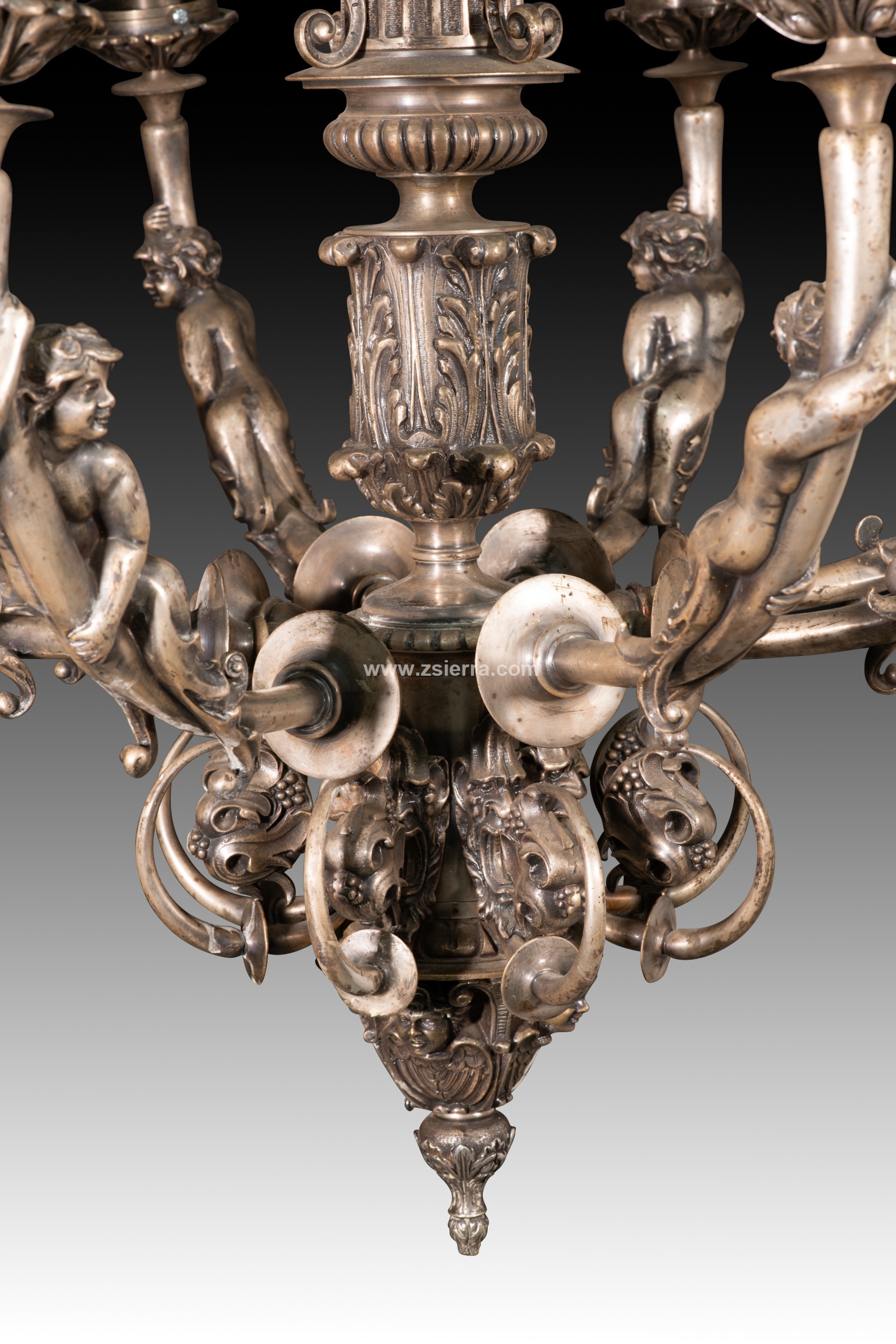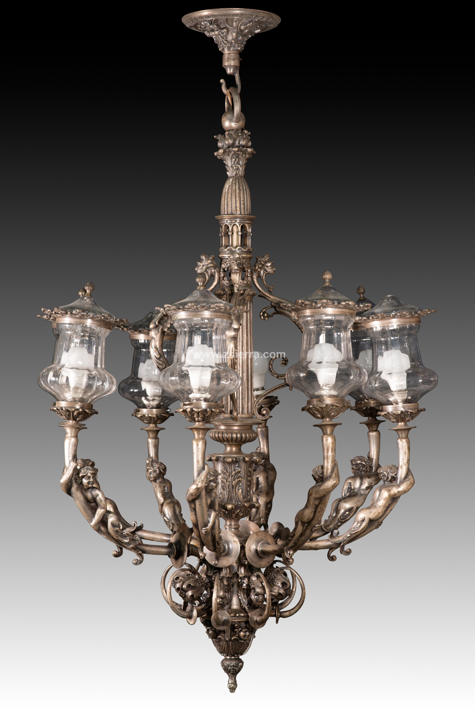 Ceiling lamp. Metal, glass. Circa early 20th century. Bronze chandelier with glass shades decorated with elements of marked classical influence: children's figures with plant forms instead of legs on their arms, scrolls, volutes, grotesques, architectural elements, heraldic elements, etc. Both in its composition and in certain details of these decorative motifs it is reminiscent of works linked to Neoclassicism of the 19th century and later works. 1 tulip is missing