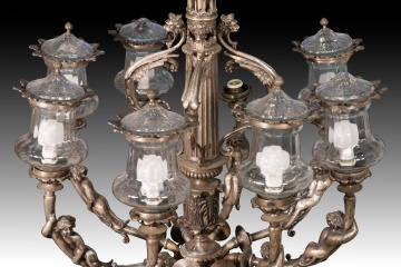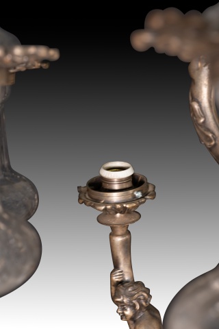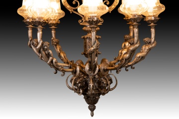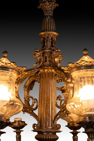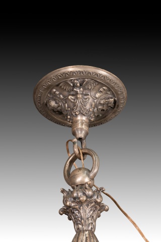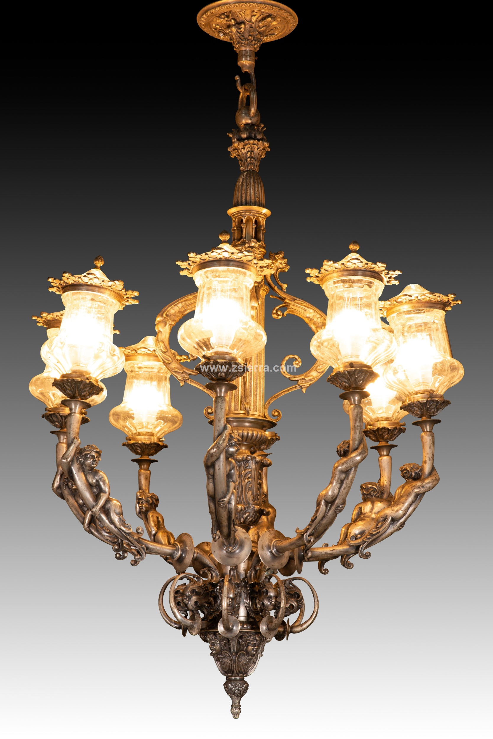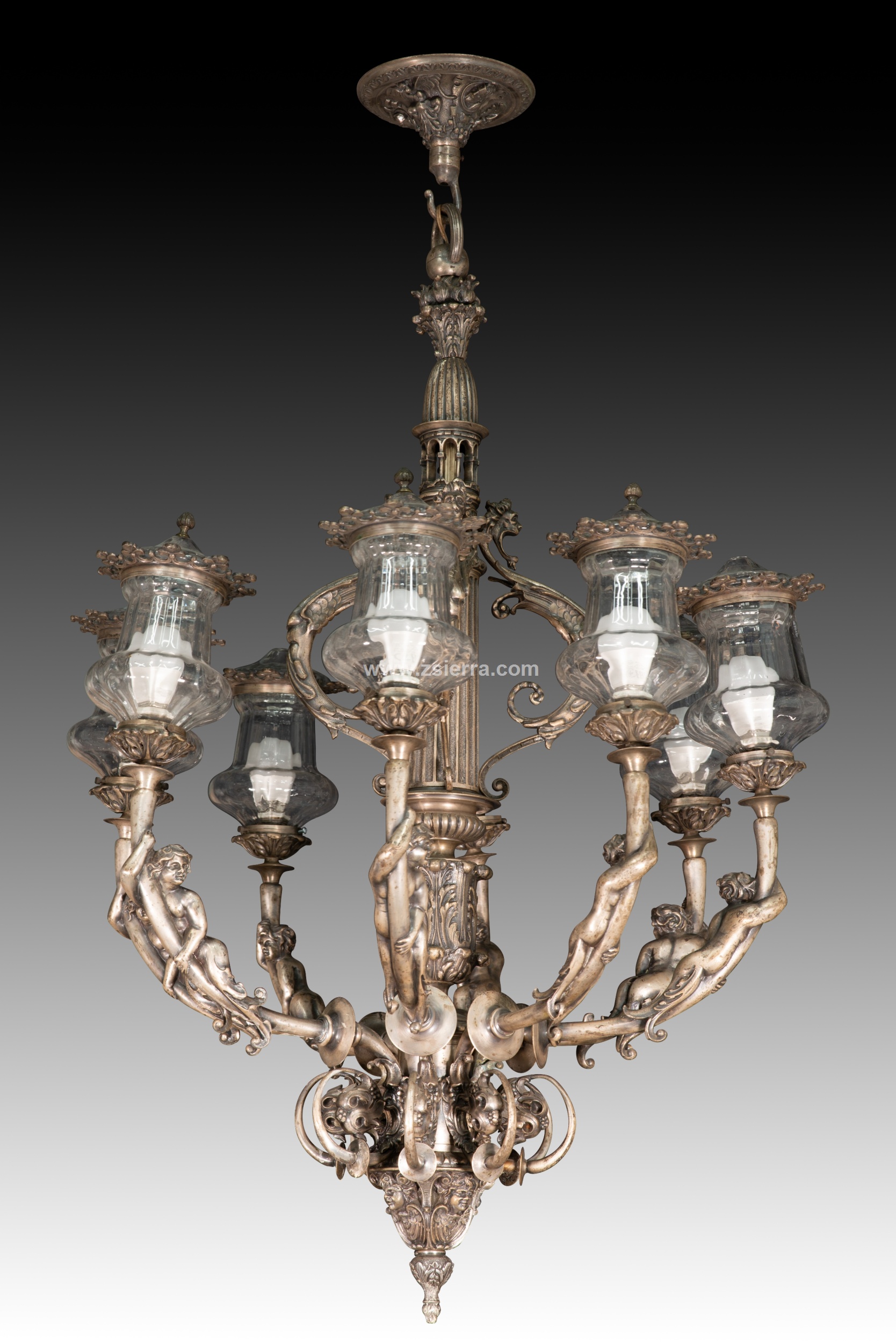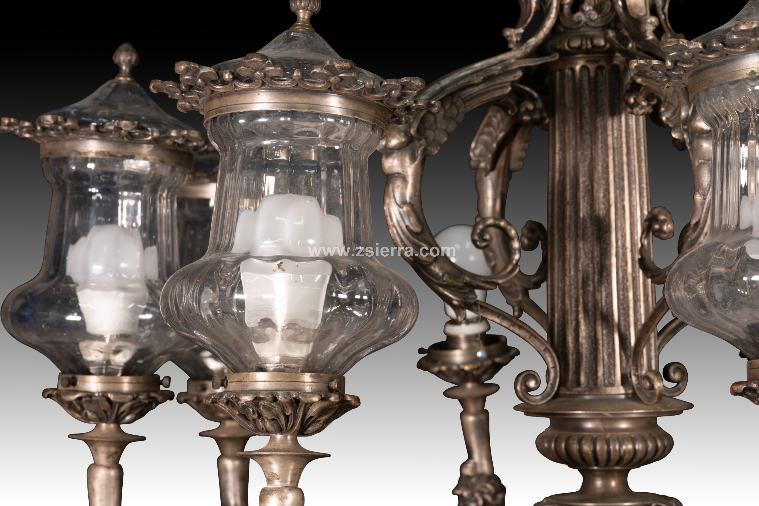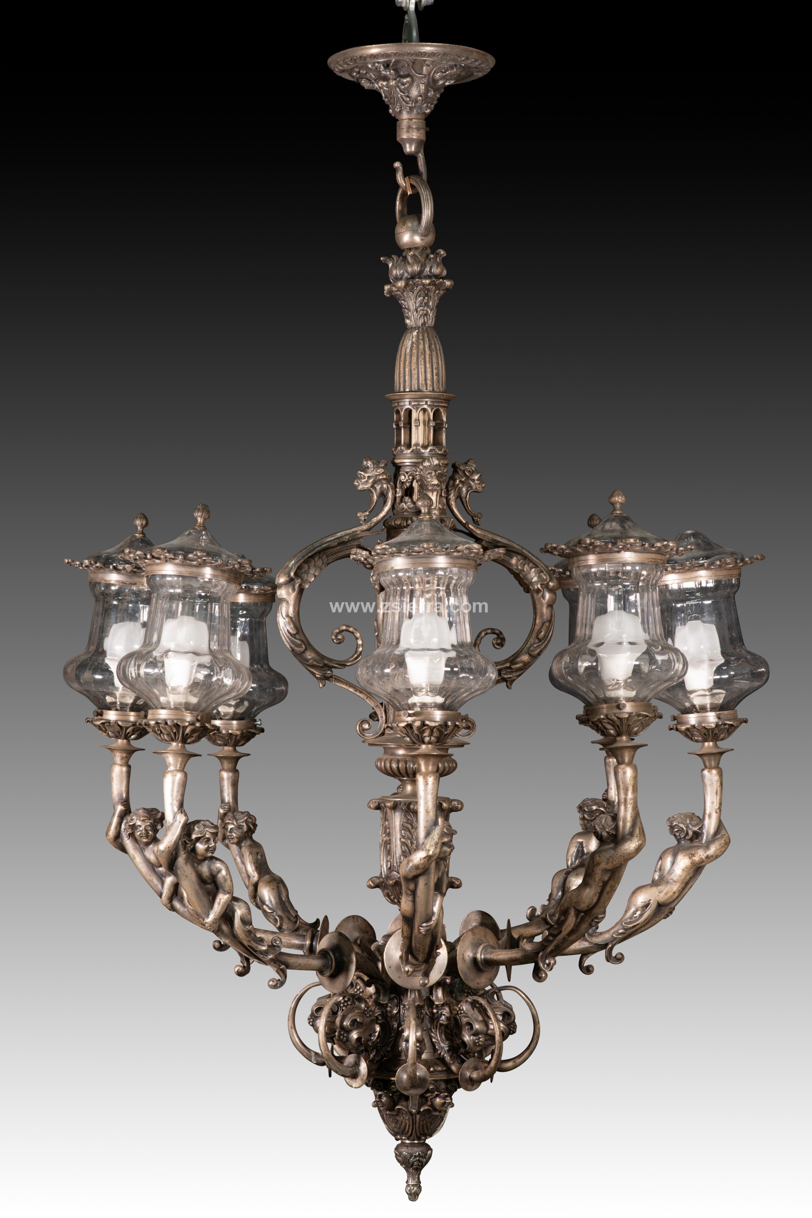 Ceiling lamp. Metal, glass. Circa early 20th century. Bronze chandelier with glass shades decorated with elements of marked classical influence: children's figures with plant forms instead of legs on their arms, scrolls, volutes, grotesques, architectural elements, heraldic elements, etc. Both in its composition and in certain details of these decorative motifs it is reminiscent of works linked to Neoclassicism of the 19th century and later works. 1 tulip is missing