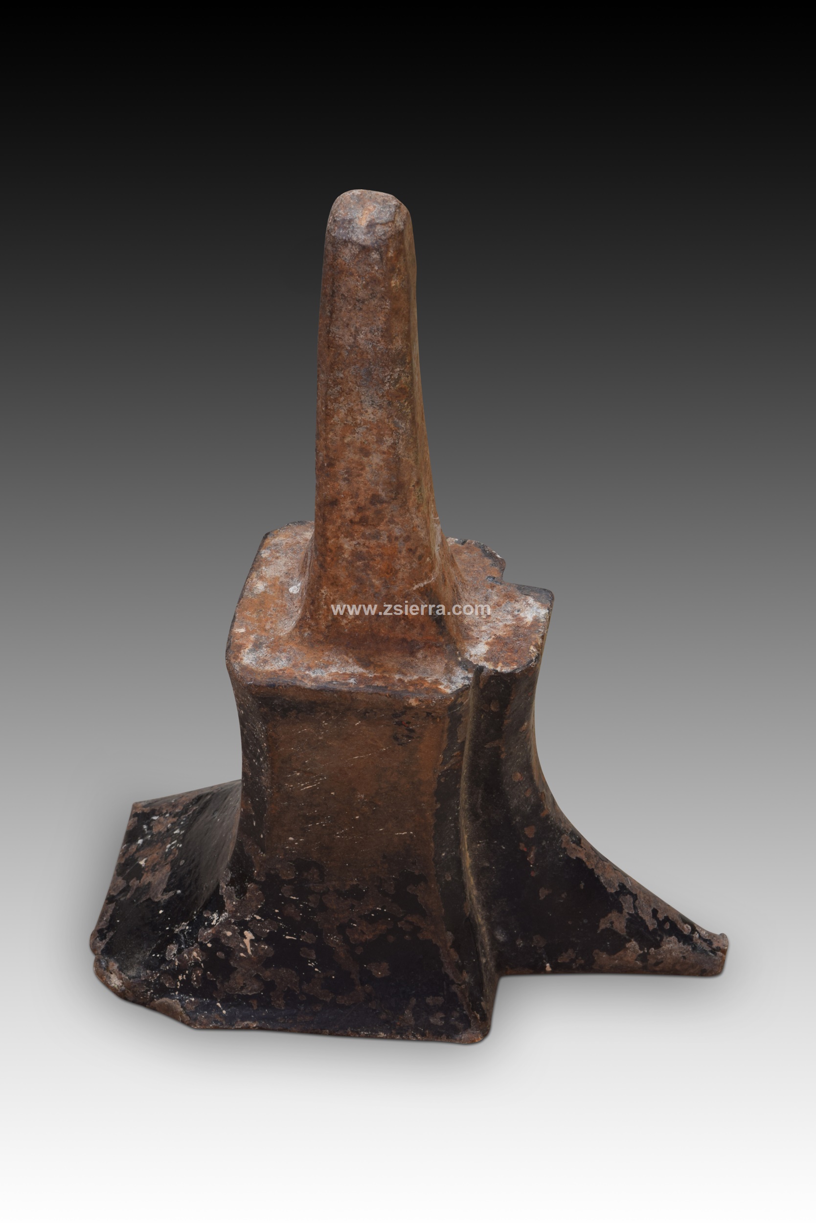 Forge anvil with stand. Wrought iron, wood. Spain, 18th century. Wrought iron anvil used for forging dating from the 18th century, placed on a later carved wooden stand consisting of three legs and a tubular shape, with a hollow at the top to place the anvil. Weight: 21 kg.