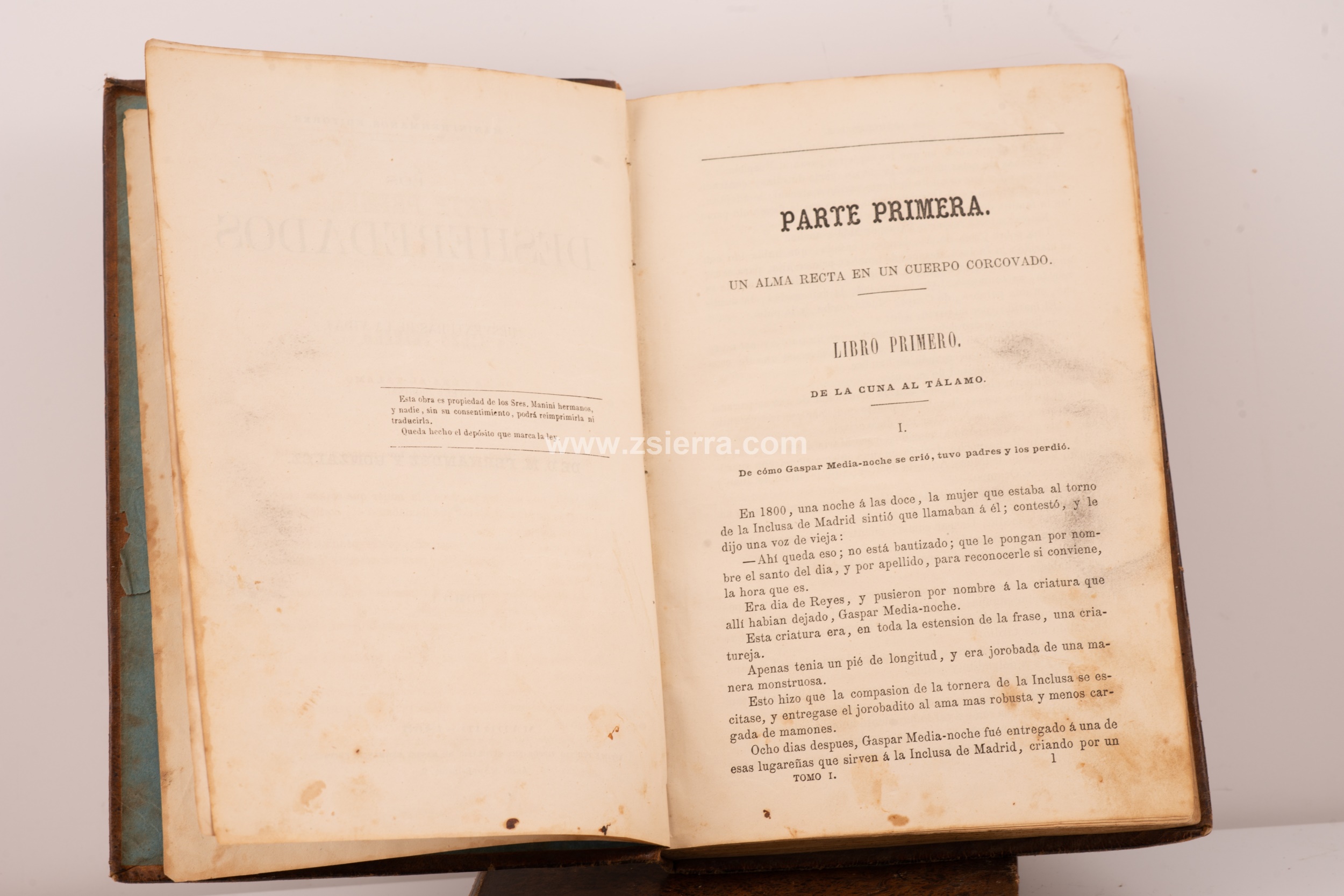 In two volumes, The Disinherited. Misadventures of Life. FERNÁNDEZ Y GONZÁLEZ, Manuel. Manini Brothers, Publishing House, Madrid, 1865 (vol. 1) and 1866 (vol. 2). They present damage. A two-volume novel by Manuel Fernández y González (Seville, 1821-Madrid, 1888), a Spanish writer known and appreciated above all for his serial novels, although he also worked as a theatre critic. Experts attribute to him between one hundred and seventy and two hundred novel titles, around thirty plays, theatre criticism, poems in the style of José Zorrilla and some dramas. With this novel he paid tribute to costumbrismo.