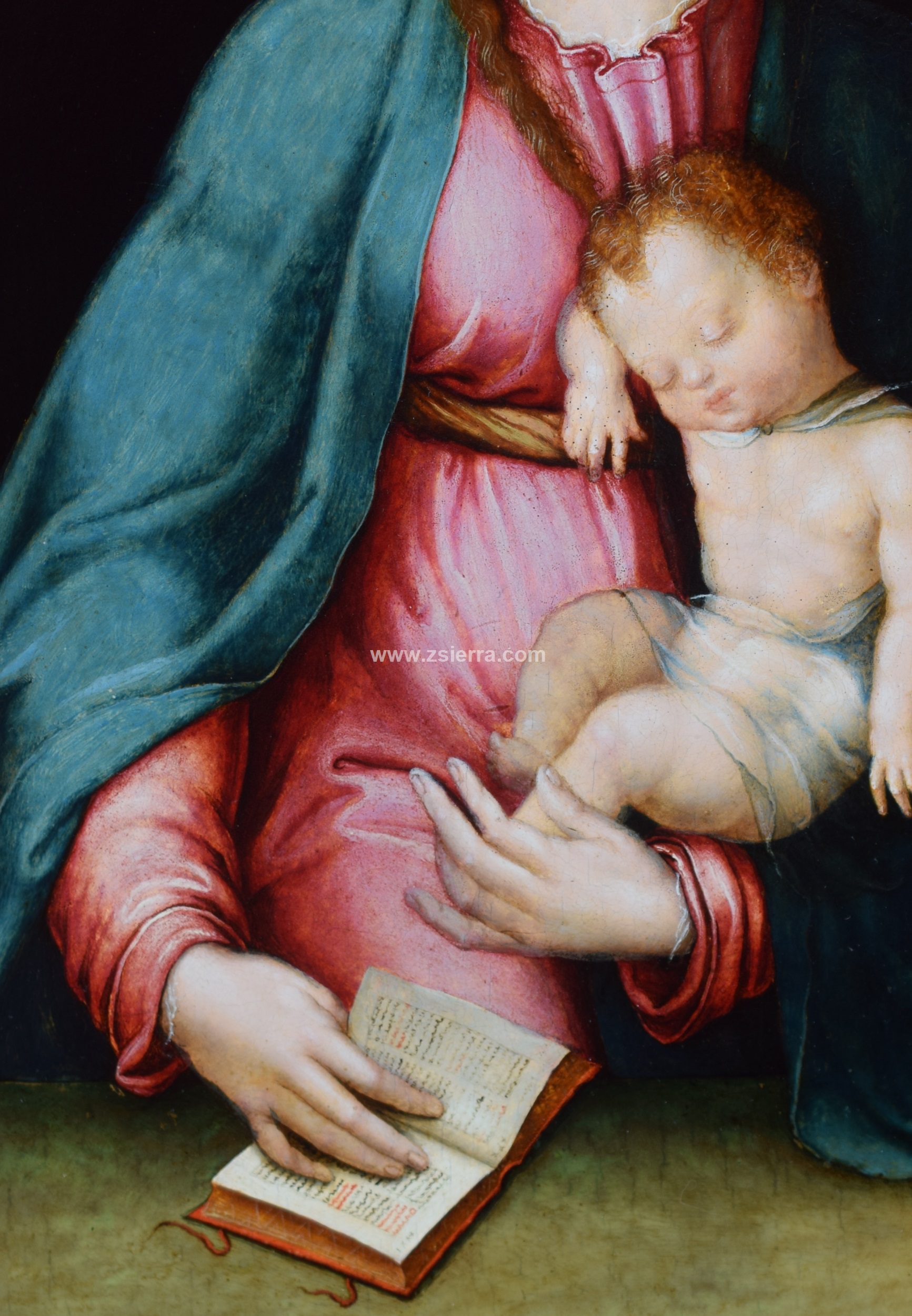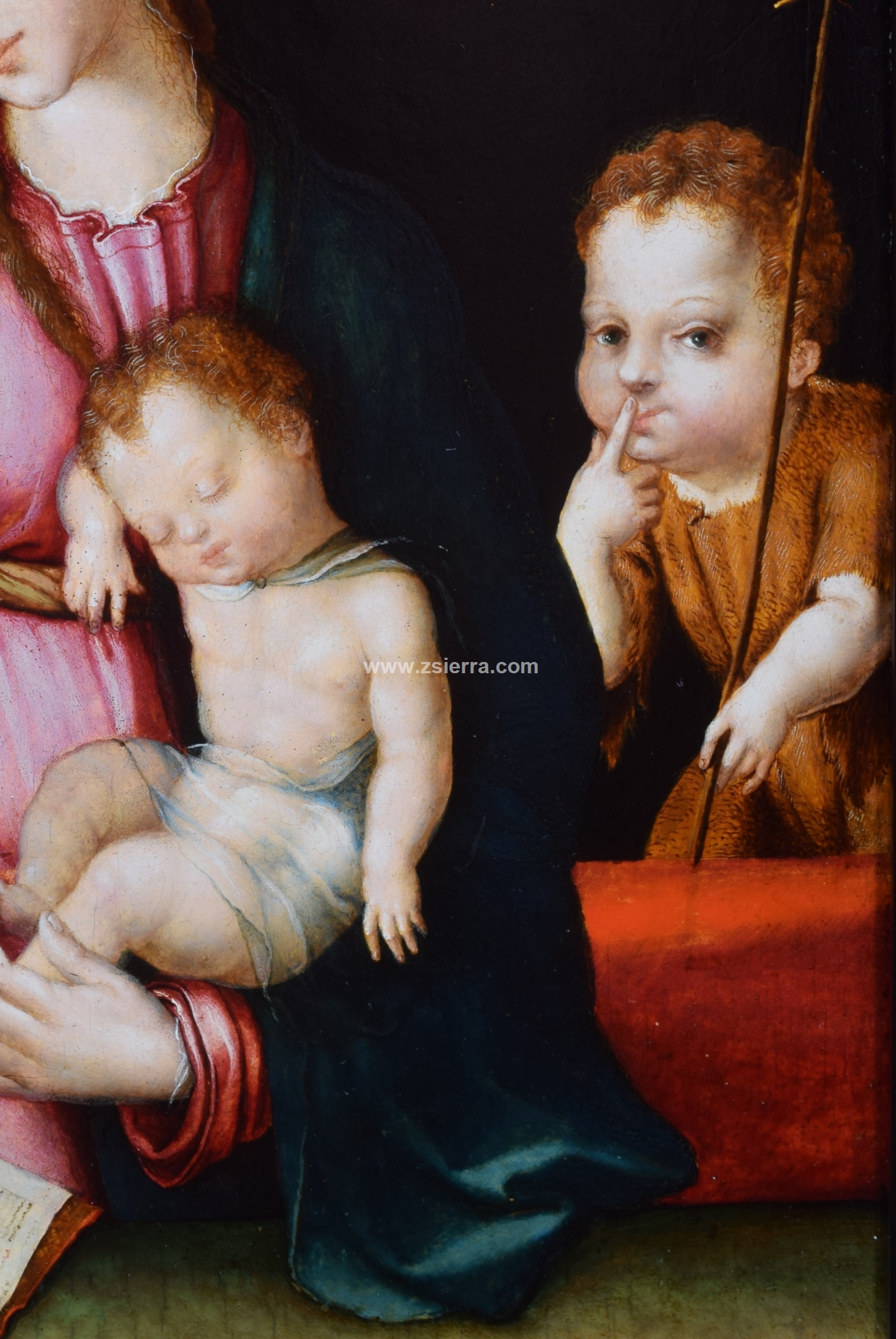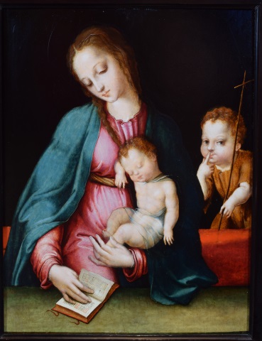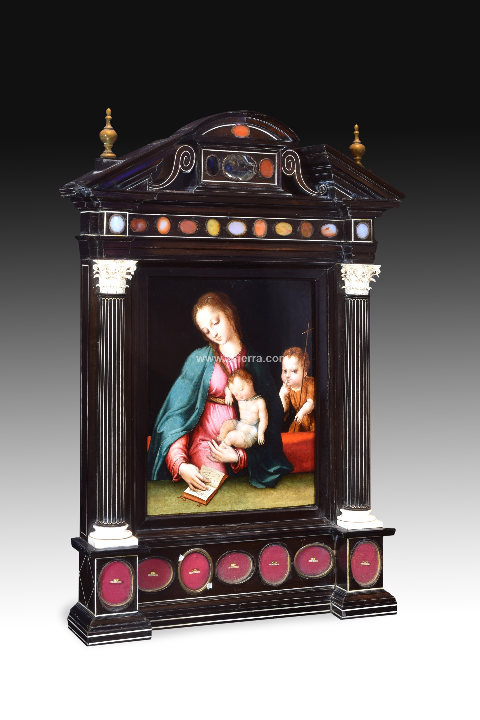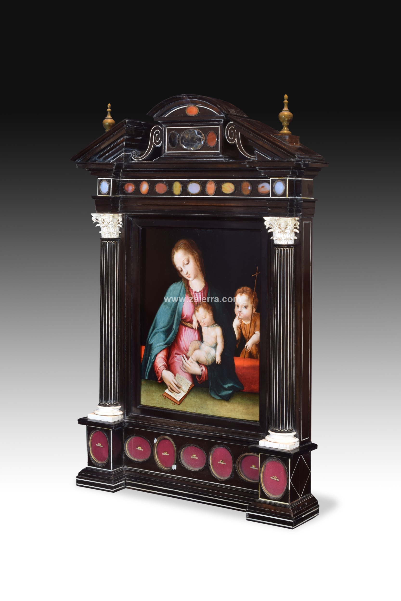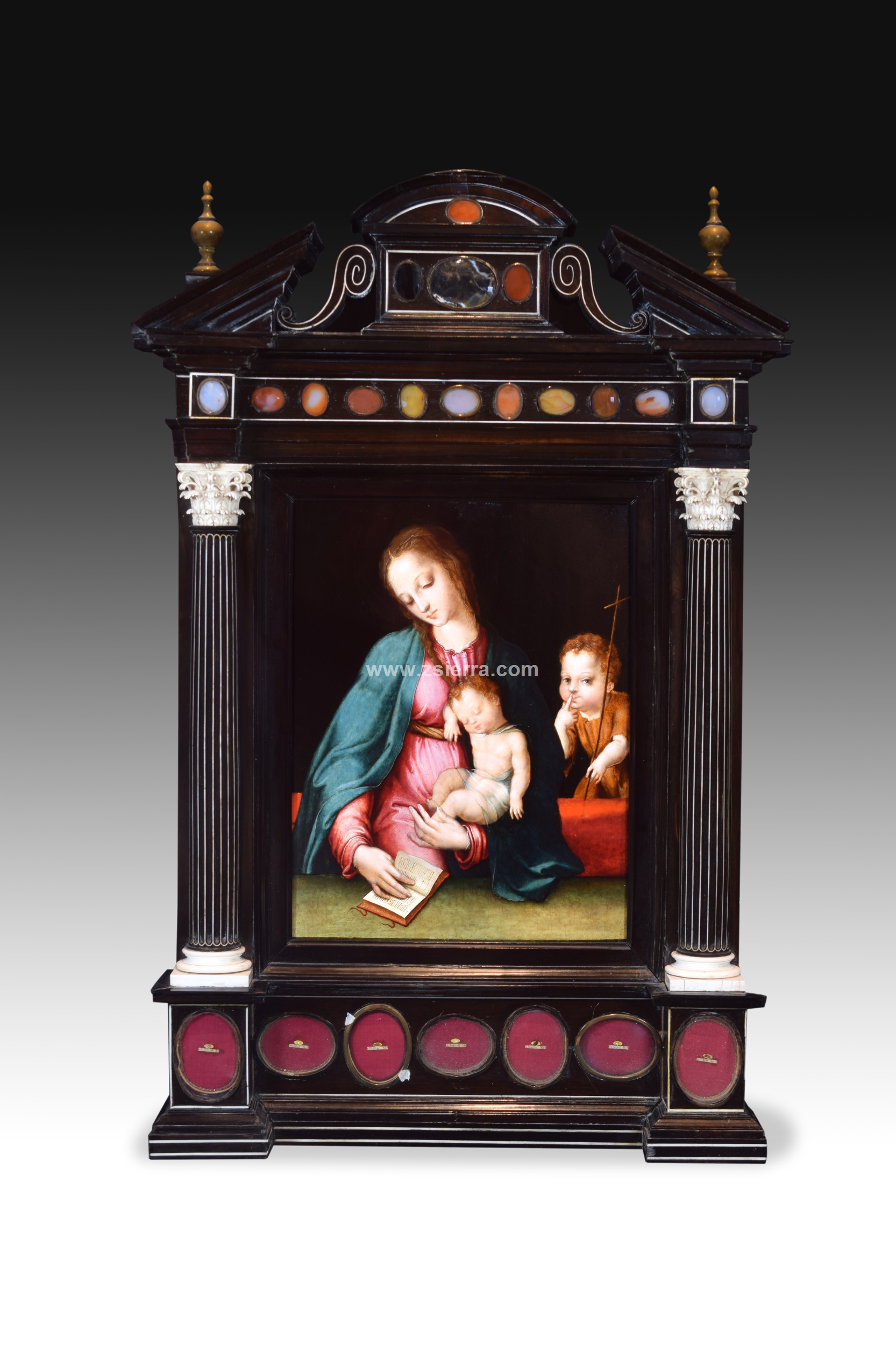 LUIS DE MORALES The Virgin with a book, the sleeping Child and Saint John the Baptist. Oil on panel. Published in the Journal of Extremadura Studies. Provincial Council of Badajoz. 2018 The panel depicts the Virgin Mary, shown slightly more than half-length, seated on a bench and leaning against a table, reading with the sleeping Child on her lap. To the right, a young Saint John the Baptist appears from behind the bench, placing a finger to his mouth, asking for silence so as not to disturb Jesus' sleep. The oil painting is framed by an ebony reliquary altar: flanked by two fluted columns with Corinthian capitals and ivory bases, situated on a plinth containing relics (their cartouches, read from left to right, house those of Saint Sylvester, Saint Philip the Apostle, Saint Philip Neri, Saint Anthony Abbot, Saint Mary Magdalene, the Holy Sepulchre of Our Lord, and Saint Clare) on cloth and framed by ovals with silver rings. The upper section is adorned, in the frieze and tympanum, with silver ovals set with colored agates, and topped by pinnacles with bronze spheres. Isabel Mateo has analyzed both elements. She attributes the panel without a doubt to Luis de Morales, nicknamed “the Divine” (Badajoz, c. 1510-1586), and places it in the painter's final period, created for private devotion. In her analysis, she highlights the similarities with other works by the painter: “Virgin and Child with Saints John” from the parish church of Valencia de Alcántara (Cáceres), dated between 1550 and 1560; the “Virgins with Hats” from the Abelló Collection and the Prado Museum in Madrid; etc. Furthermore, she refers to the Flemish iconographic influences and those of Raphael in Morales's work, among others, and admits to having seen the panel before, but dirty and with overpainting. Regarding the reliquary, added after the painting was completed, he links it to El Escorial and Philip II, finding clear similarities with works made by cabinetmakers active at the Monastery around 1590 that do not feature stones in their decoration. He adds that the presence of agates would place the work around 1600 and that it is either Italian-made or Spanish, with Italian influence. The work has been studied by Dr. Isabel Mateo Gómez