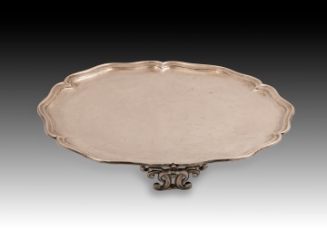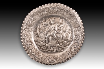 Altar top. Embossed silver in its colour, wood, mirrors. LLORENTE, José (1760-1799); SOTIL, Juan Antonio (1754-1768). Vitoria, Spain, 18th century. With contrast marks. Altar top made of embossed silver in its colour on a wooden core with seven oval-shaped mirrors and profiles cut in curves and counter-curves. The upper part has a canopy imitating textiles from which hang a series of small bells and shelters a dove with outstretched wings, situated in front of a ventral figure and a cloud with winged angel heads. Approximately the upper three quarters of the work show a decoration in light relief with sun rays, scrolls, rocailles, oval mirrors, circular tears resembling rain, flowers, leaves, a bunch of ears of wheat next to a vine with a bunch of grapes, etc. combined with five mirrors and following a symmetrical arrangement; the remaining part does not have reliefs but does have two mirrors. This type of liturgical goldsmith's work was relatively common in churches, cathedrals, etc. with significant purchasing power and influence, although not many of those made have survived because they are valuable materials that can be melted down and looted at certain times. Let us mention, highlighting the differences, the silver Altar of the Cathedral of Seville (16th-17th centuries, several silversmiths), the set of the main chapel of the Cathedral of Santiago de Compostela (17th century), the Manifestador-Tabernacle of the Cathedral of Valencia from the 18th century, the silver altarpiece of the Diocesan Museum of Huesca (work of José Estrada and Juan and Jerónimo Carbonell y Gros made between the 17th and 19th centuries, which was placed in front of the Main Altarpiece of the Cathedral, and has a canopy and pendant bells), a display for the Blessed Sacrament made of gilded silver and in its colour dated in the 18th century and which is found in the Museum of the Cathedral of Segovia, etc. The presence of the Holy Spirit (a dove) and the bunch of wheat ears and the vine with the bunch of grapes would link the piece with the Eucharist, and it is possible that it is a fragment of an altar (permanent or not) of a monstrance. Stylistically, it is clear that the work belongs to a Rococo that was already somewhat advanced. The hallmarks present in various parts of the silver place the creation of the finial in Vitoria (Spain), also providing an approximate date (around the 18th century's 60s) and the names of two master silversmiths: Juan Antonio Sotil or de Sotil (possibly the hallmark) and José Llorente. Juan Sotil was a silversmith based in Vitoria who also worked as a hallmark for the city (the City Council appointed him appraiser of diamonds and precious stones in 1751, and hallmark for the city in 1769, a position he held until 1779, when he resigned and Mauricio Llorente was appointed). Works with his hallmark are preserved in prominent institutions such as the Museum of Sacred Art in Vitoria (Reliquary of Santa Lucía from the hermitage of Santa Lucía in Vitoria, 18th century). José Llorente was another silversmith from Logroño. He passed his master's exam in Burgos, and is documented between 1760 and 1799. Works with his punch are preserved in the Church of Santiago de Logroño (portaviático), the Old Cathedral of Vitoria (four candlesticks), etc.