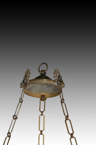 Lamp. Bronze. 19th century. Lamp with a circular vase decorated with a series of classicist decorative mouldings at the bottom and an oval shape from which a ring hangs, and another moulding at the top joining three winged angel heads. From the back of these emerge three chains of polygonal links that go to a piece through a decoration of palms and scrolls, which ends in a ring to go to the ceiling. Also sometimes known as votive lamps due to their frequent presence in churches, these types of lamps were outstanding pieces. Compare, for example, the one in San Antonio de la Florida (Madrid) by Domingo Urquiza dated 1799.