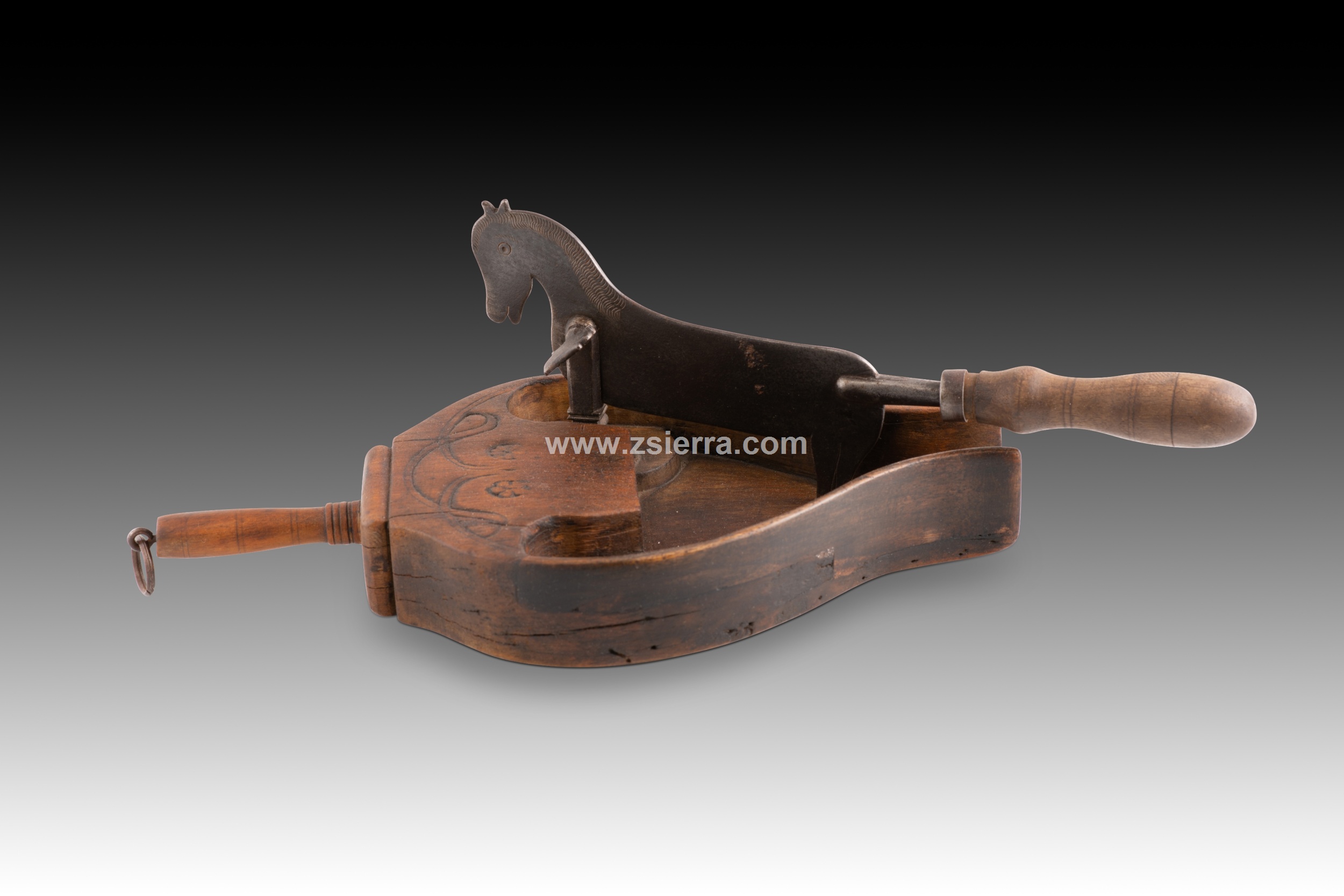 Chocolate cutter. Wood, metal. 19th century. Chocolate chopper made of carved wood decorated with engraved plant and floral motifs, featuring an iron blade in the shape of a small horse, which has a turned wooden handle. Compare with the one from Salamanca preserved in the CIPE Costume Museum in Madrid (inventory CE008848) dating from the 19th century.
