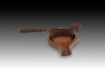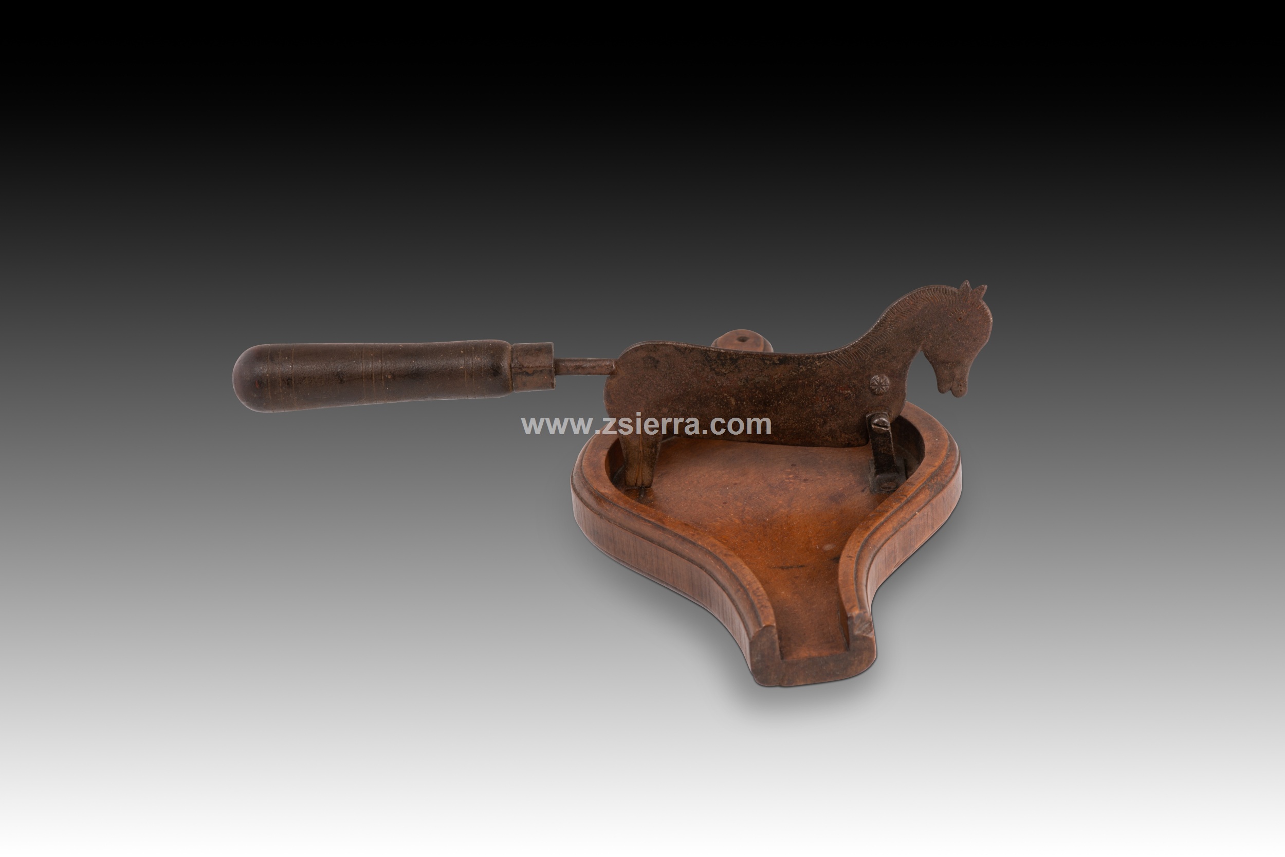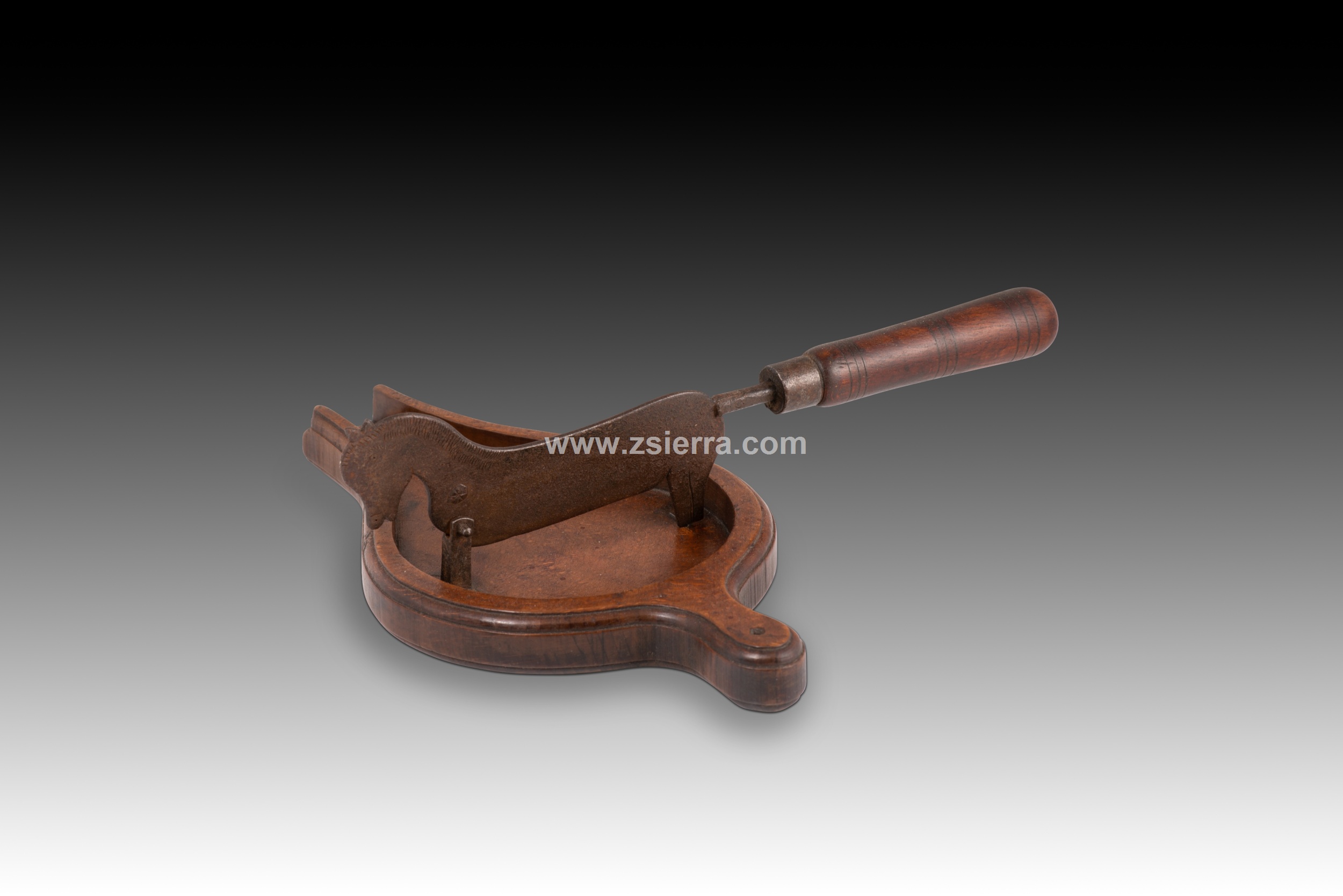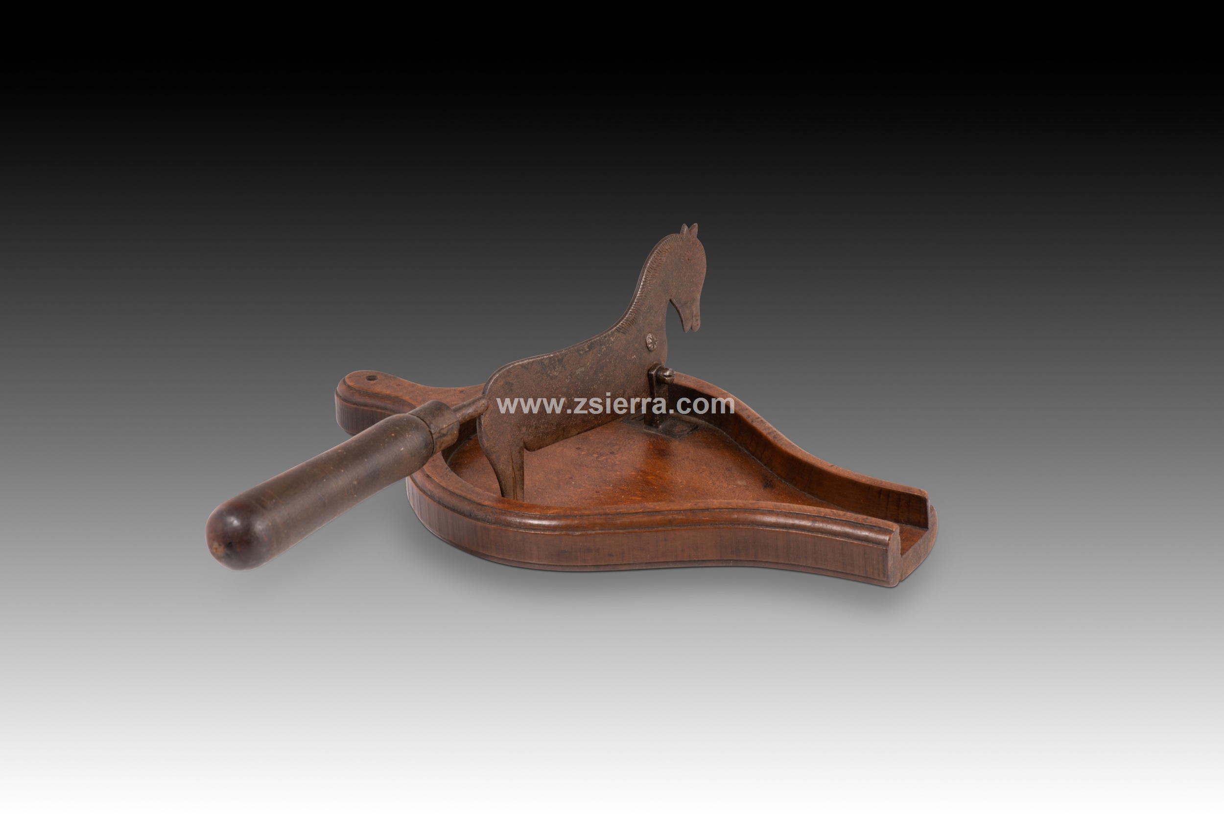 Chocolate cutter. Wood, metal. 19th century. Chocolate chopper made of carved wood with an iron blade in the shape of a horse, which has a turned wooden handle. Compare with the one from Salamanca preserved in the CIPE Costume Museum in Madrid (inventory CE008848) dating from the 19th century.
