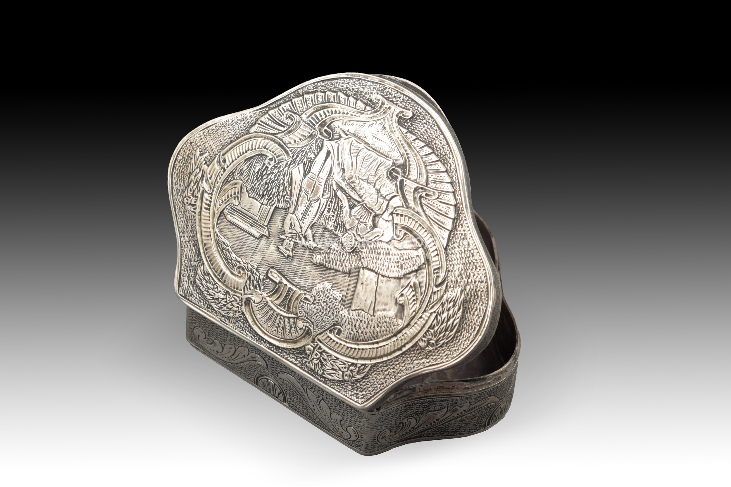 With marks. Trilobed box with a flat lid made of silver in its colour, decorated on the edge and lid with elements overcut with lustre. The upper part presents a scene framed by scallops and elements reminiscent of Rococo, featuring a couple in an idealised setting, recalling the gallant scenes of this artistic style of the 18th century. Weight: 77 grams.
