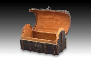 Rectangular chest with a semicircular lid made of carved wood and covered with worked leather that has been reinforced with a series of wrought iron fittings, a material that is also used to make the handle on the lid and a latch on the front with a lock shield decorated with simplified plant elements on the top. The interior has the fabric upholstery that was common in these pieces and that, as a general rule, has not been preserved in good condition, as in this piece. These types of chests were used both to store and transport precious objects, hence the lock, always seeking quality in materials and decoration that would demonstrate the economic power of its owner, as well as maintaining its usefulness. The shape is one of the most common for chests in Spanish Gothic, maintaining the way the fittings and a series of decorative elements are arranged in this style. The barred and rehearsed chests and small chests had very varied shapes and sizes, being so common in Spain during the 15th and 16th centuries that numerous examples are preserved today. Compare, for example, those in the Lope de Vega House Museum (Madrid), one dating from the beginning of the 16th century and with 19th century touches (CE00170) and another with a decoration (inventory CE00004), or the 15th century chest in the Museum of Decorative Arts in Madrid, for example, as well as several examples from private collections.