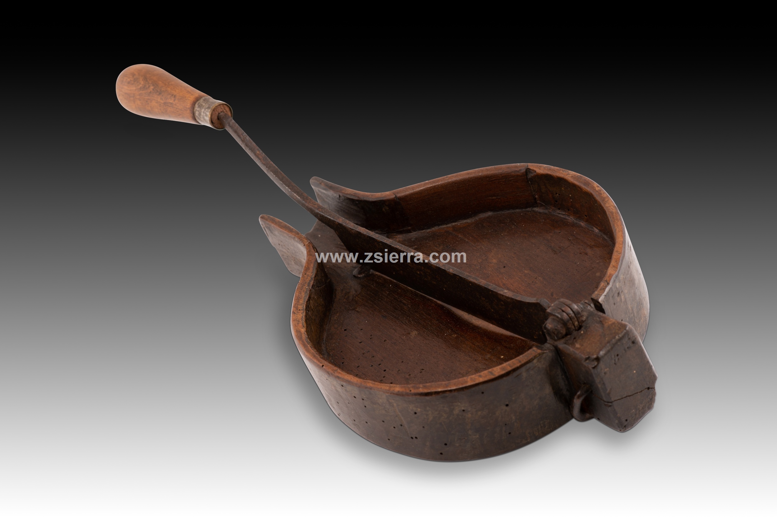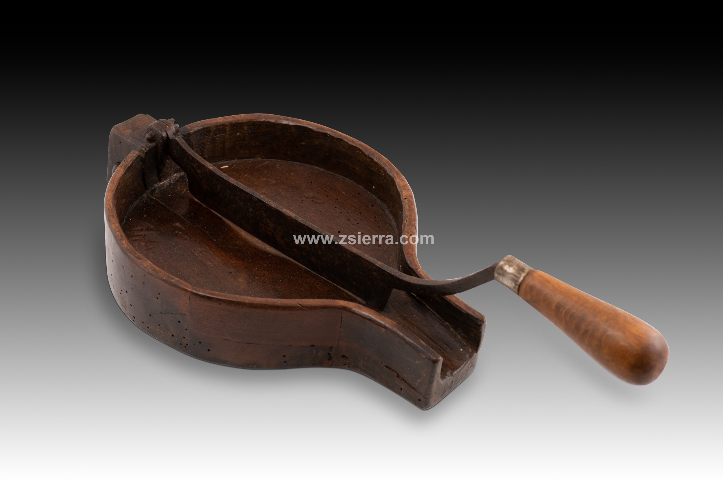 Chocolate cutter. Wood, metal. 19th century. A circular tray with an extension on one side for a metal piece that can be raised and lowered, attached to the other end of the tray. Chocolate bars or tablets would be cut with this movable piece. This type of kitchen utensil clearly lacks decorative elements, being purely utilitarian.