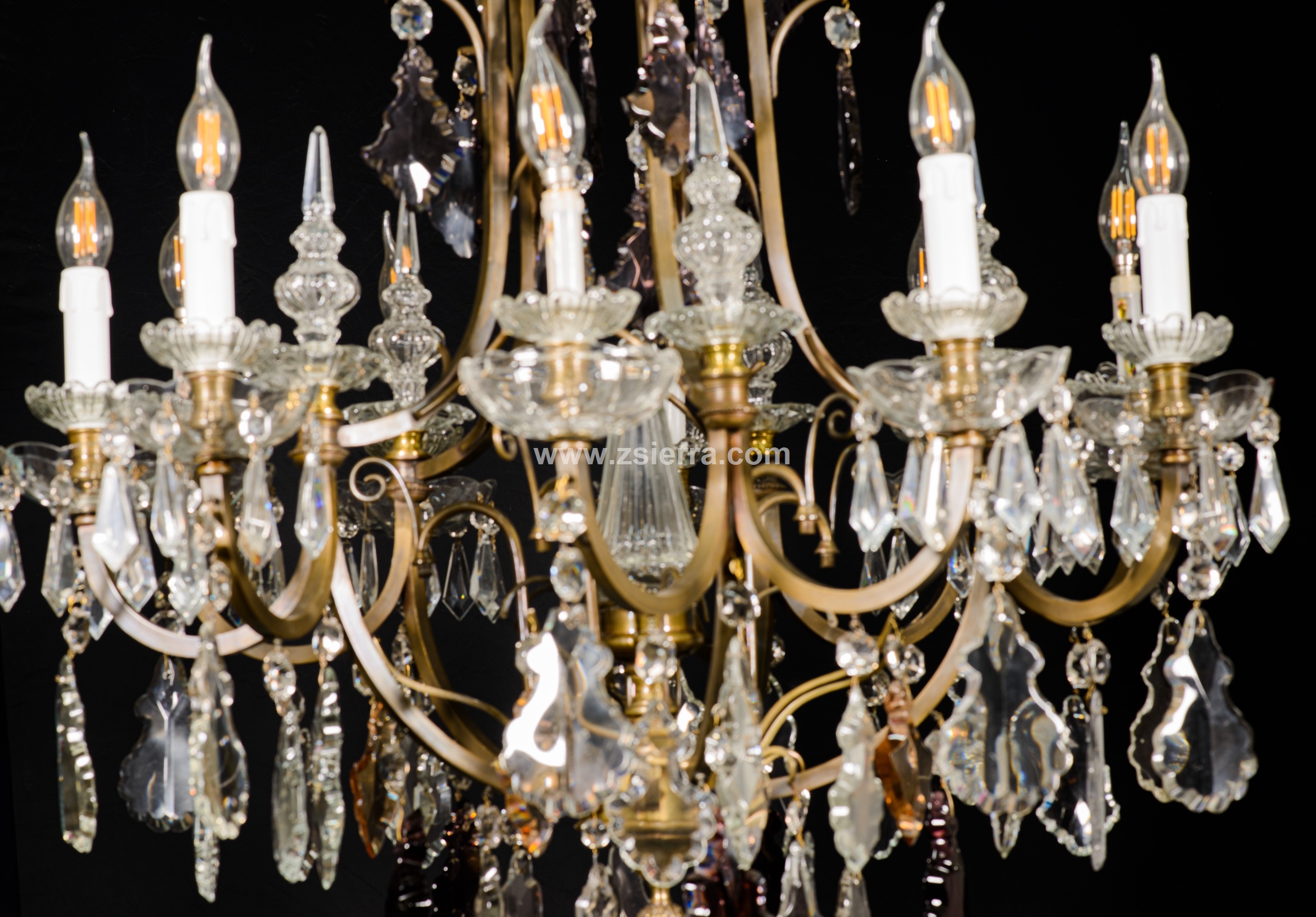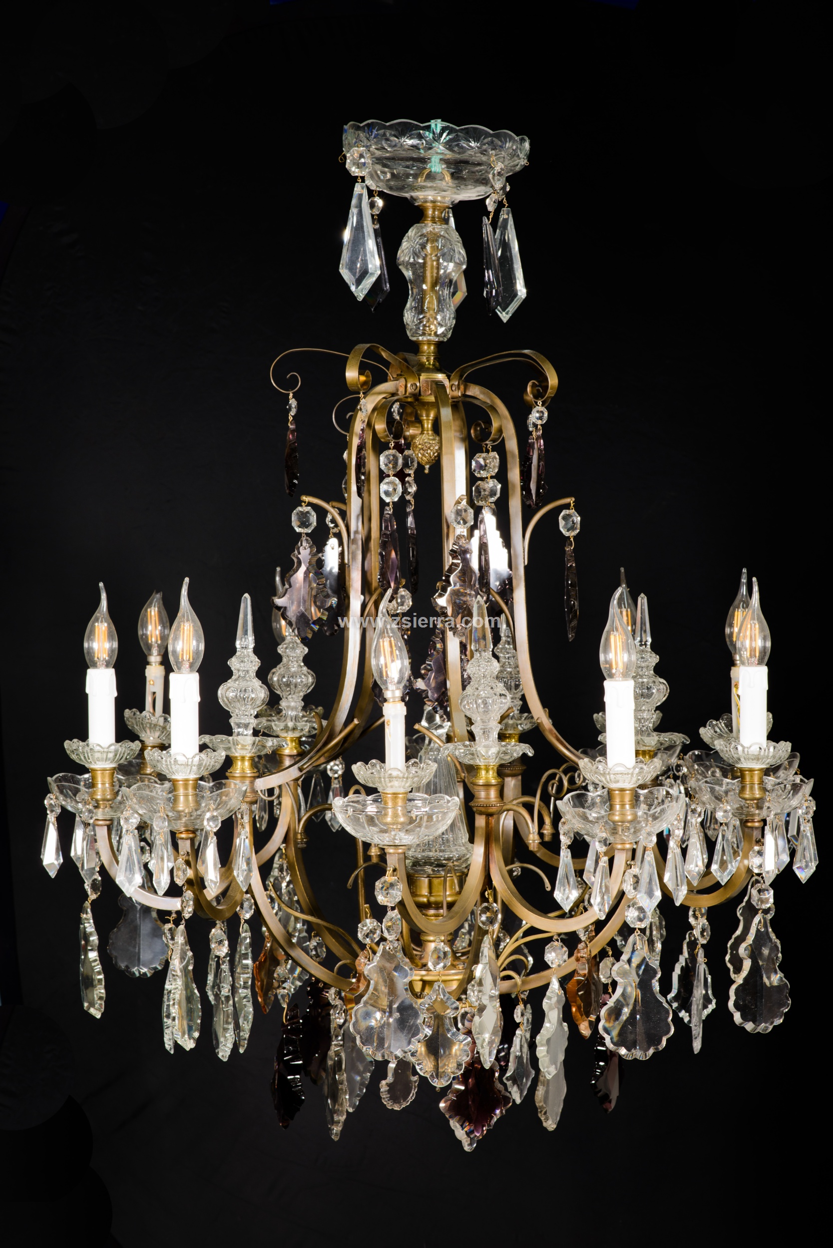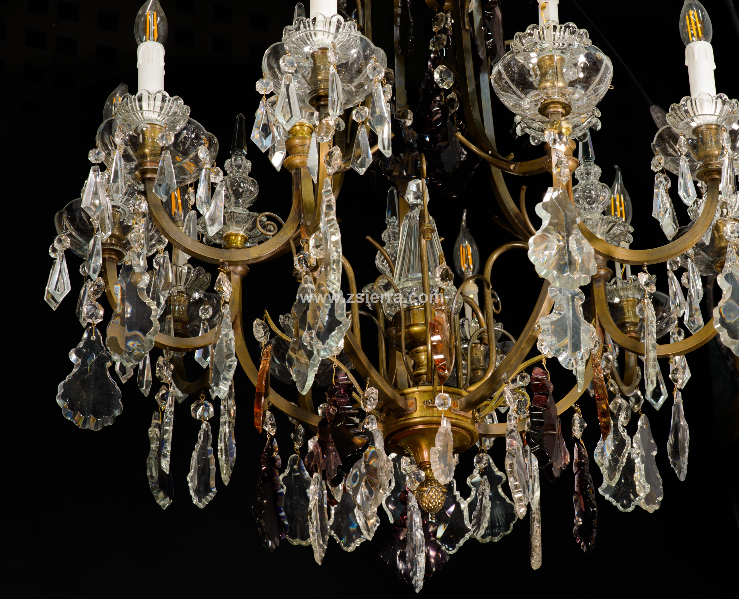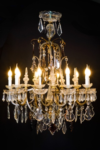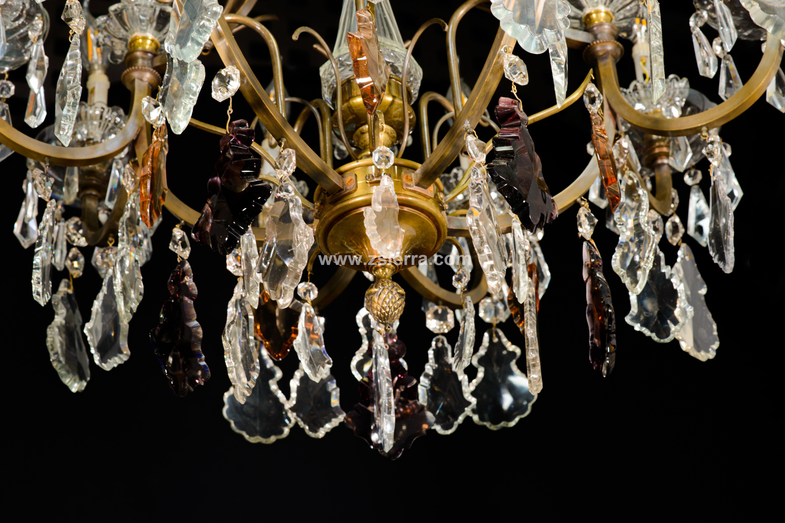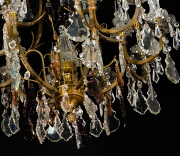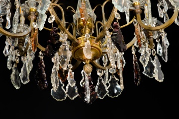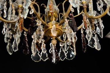 Ceiling lamp. Glass, bronze. Early 20th century. It has faults. Ceiling lamp adapted for electric use with the structure made of bronze and decorated with transparent and colored glass applications, combining simple beads (faceted polygonal beads, teardrops…) with more elaborate ones (balustraded finials, bowl-shaped ornaments, mixed profile beads, etc.), following common models in 19th-century French school works.