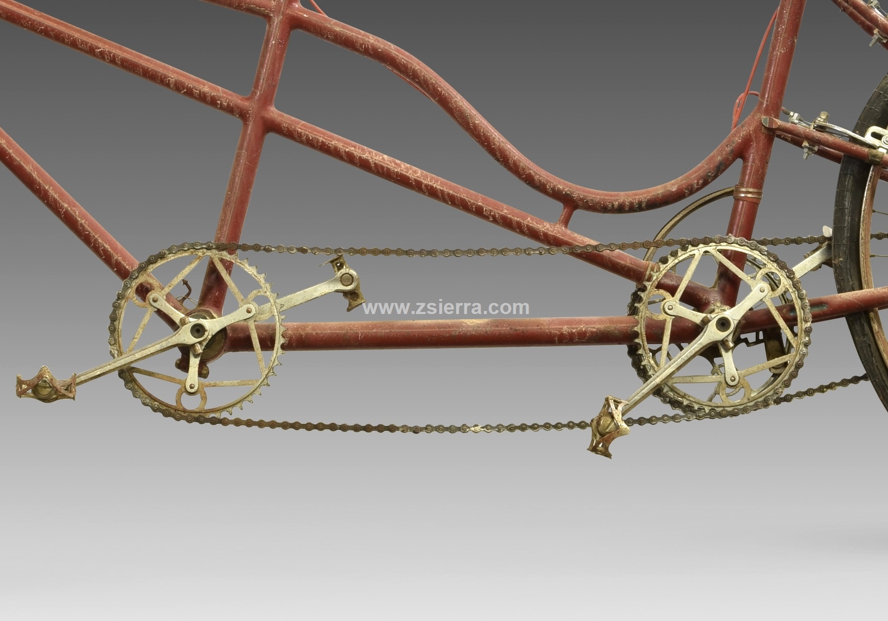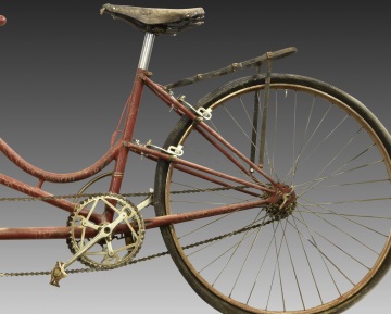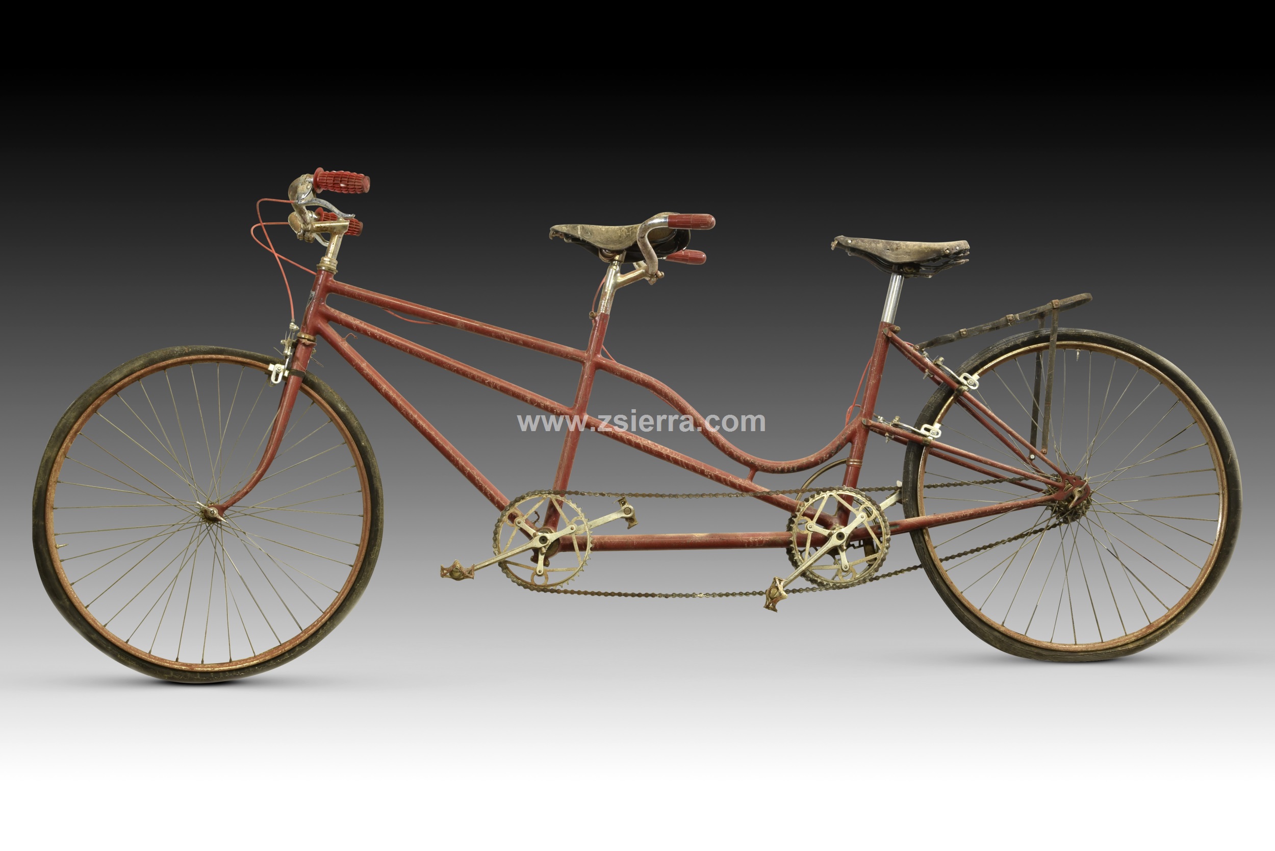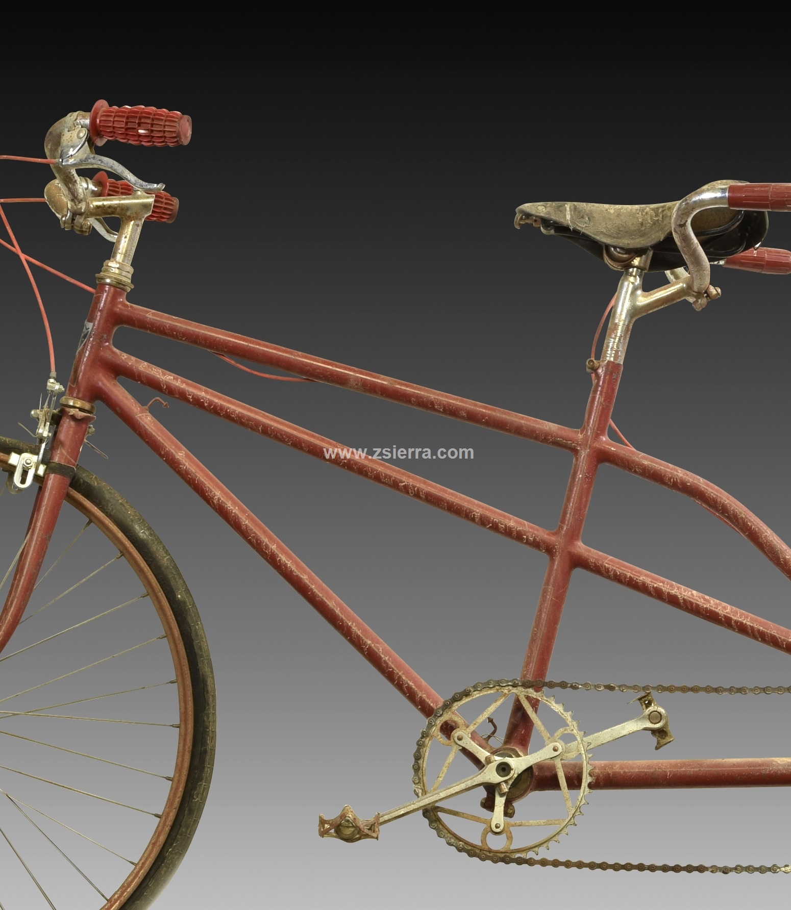 Myquel tandem bicycle. Madrid, Spain, mid-20th century. It requires restoration. A tandem bicycle painted red with the shop's sign on the front (Ciclos Myquel; Palma, 13; Madrid), featuring a rear seat designed specifically for women (its shape allows for wearing a long skirt). In some details, it's reminiscent of Schwinn bicycles from 1970, and the quality of the bicycle is noteworthy (the shop advertised itself in the press at the time as "bicycles fit for kings"). It's also worth mentioning that a similar bicycle is preserved in the collection of the well-known Otero shop.