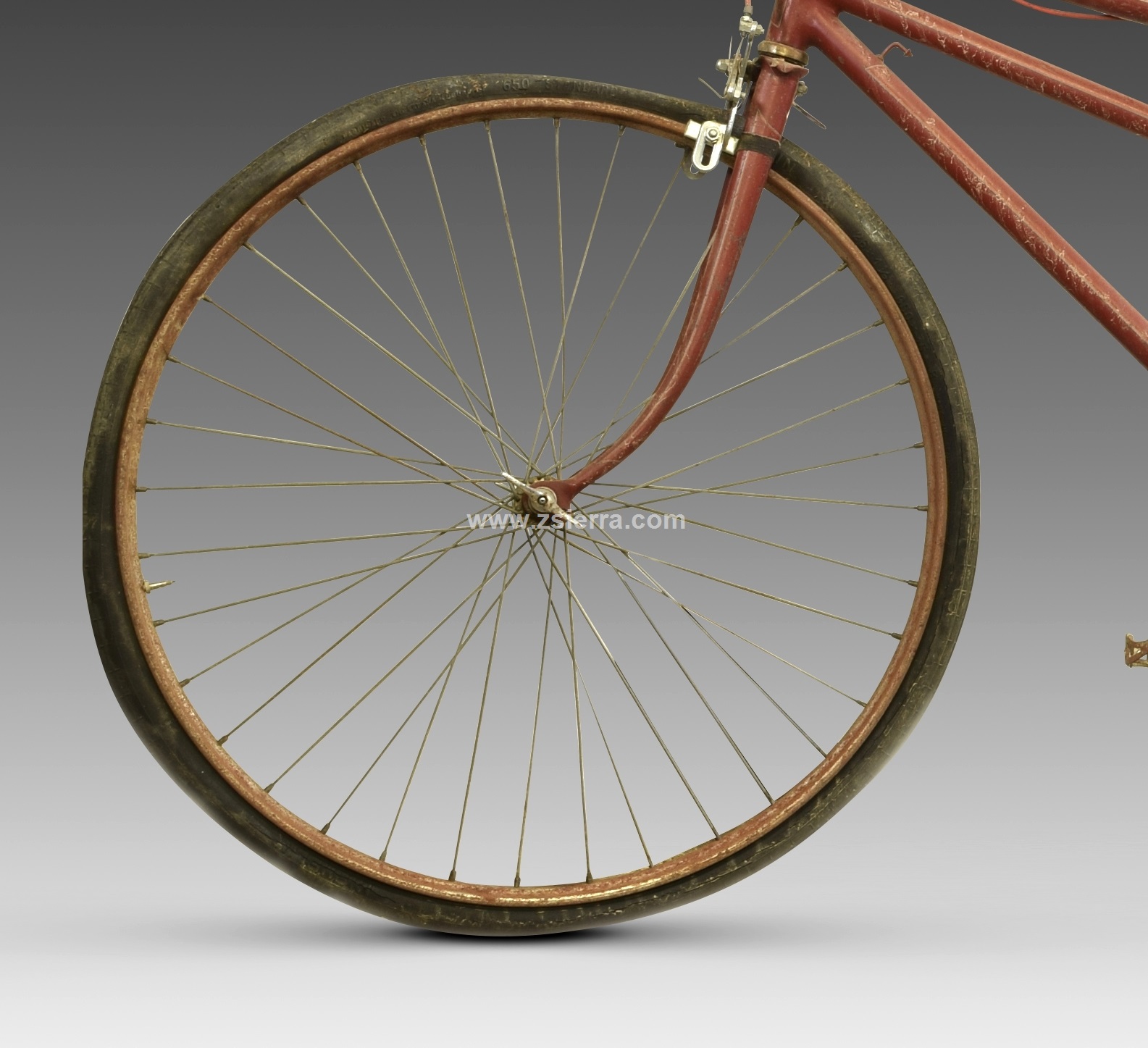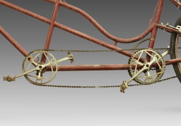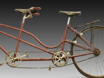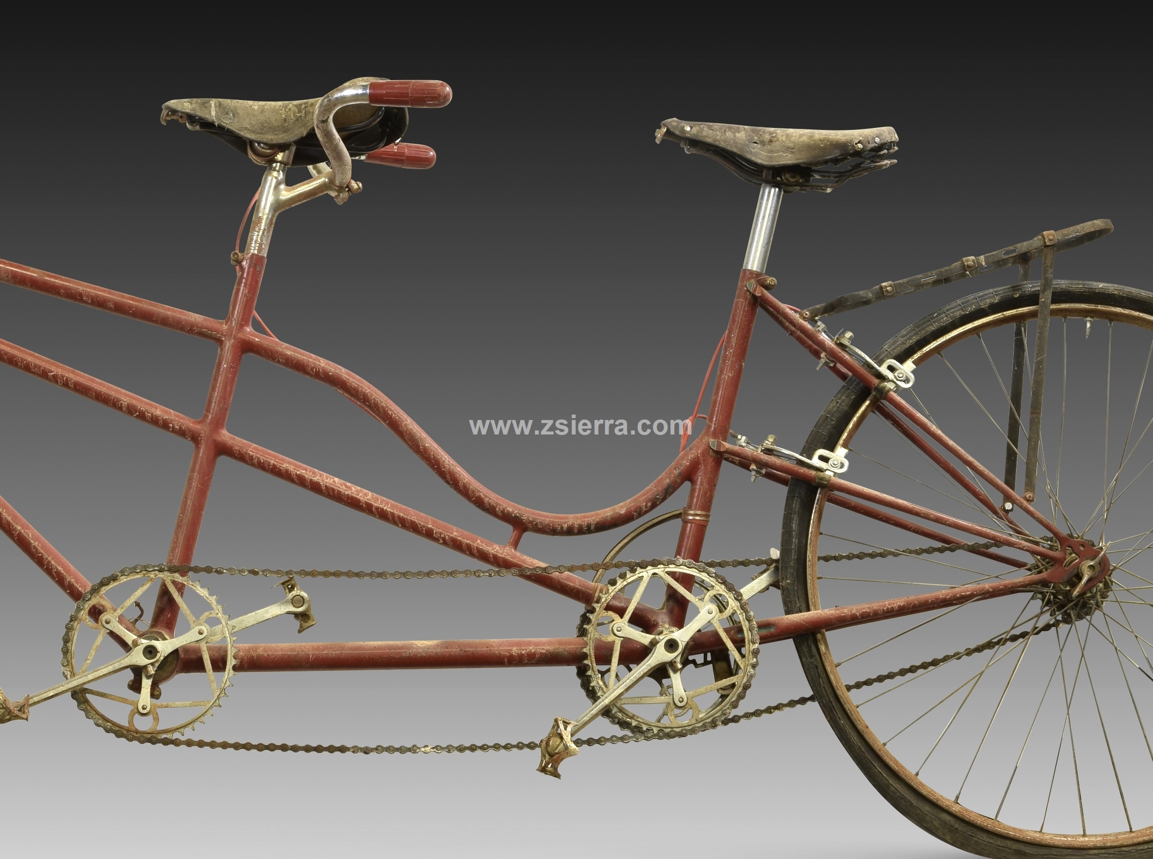 Myquel tandem bicycle. Madrid, Spain, mid-20th century. It requires restoration. A tandem bicycle painted red with the shop's sign on the front (Ciclos Myquel; Palma, 13; Madrid), featuring a rear seat designed specifically for women (its shape allows for wearing a long skirt). In some details, it's reminiscent of Schwinn bicycles from 1970, and the quality of the bicycle is noteworthy (the shop advertised itself in the press at the time as "bicycles fit for kings"). It's also worth mentioning that a similar bicycle is preserved in the collection of the well-known Otero shop.
