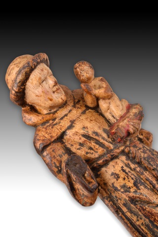 Saint Anthony with the Infant Jesus. Wood. School of Malines, 16th century. A carved wooden sculpture, worked, as was usual in this centre, on the front part because it was intended to be placed on an altar, representing Saint Anthony of Padua with the Child Jesus sitting on a book, in one of the most common iconographies for this Franciscan saint. The relationship with the school of Malines is evident in the physiognomy of the figures, the remains of the polychromy, etc. The "poupées malinoises" or "Malines dolls" are small sculptures of saints made in the late 15th century and early 16th century in the workshops of Malines (Flanders) and were known by these names because of the similarity of their faces to those of dolls or peponas ("poupins"); they were sometimes also called "cutlet sculptures" because they were finished only at the front, being flat at the back, depending on the depth of the bottom of the niche where they were to be placed. They were made for small domestic altarpieces - normally containing three statuettes or "dolls" - rectangular in the shape of a box and with painted wings or doors. The best-known example is perhaps the altarpiece preserved in the Mayer van den Bergh Museum in Antwerp.