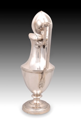 Jug. Silver. Madrid, Spain, 1803. With hallmarks. Published in the Encyclopedia of Spanish and Viceroyal American Silver. Bibliography: Fernández, Alejandro; Munoa, Rafael; Rabasco, Jorge. “Encyclopedia of Spanish and Viceregal American Silver”. Second edition, corrected and expanded. Torreangulo Graphic Art, Madrid, 1985. Page 361, image 671. Jug with a moulded circular base and a semi-ovate belly on which a concave neck is raised by a band. The mouth, with a sinuous line, is highlighted with another fine smooth moulding and is warped at the front; it is covered with a lid that follows the same lines and is finished with a frog. The handle has a broken line, ends in plant motifs and is highlighted with a wide, smooth band or moulding towards the centre of the jug. This jug can be included in a group inspired by a traditional European model brought to Spain and initially spread by Platerías Martínez (compare, noting similarities and differences, with the silver jug in its colour marked in 1806 from the Royal Silver Factory of Madrid in the National Archaeological Museum, also topped with a frog on the lid; or with a jug from Barcelona dated around 1810, preserved in the National Museum of Decorative Arts in Madrid). In 18th century Spain, it was the capital that set the standard in silverwork: baroque, rococo and neoclassical styles coexisted, but the first trend was soon abandoned, replaced by the second, which was introduced around 1740, with Neoclassicism appearing around 1770 and gradually imposing itself from 1780. The hallmarks it presents are those of the Villa y Corte de Madrid, which also allow the piece to be dated. Weight: 1,100 grams.