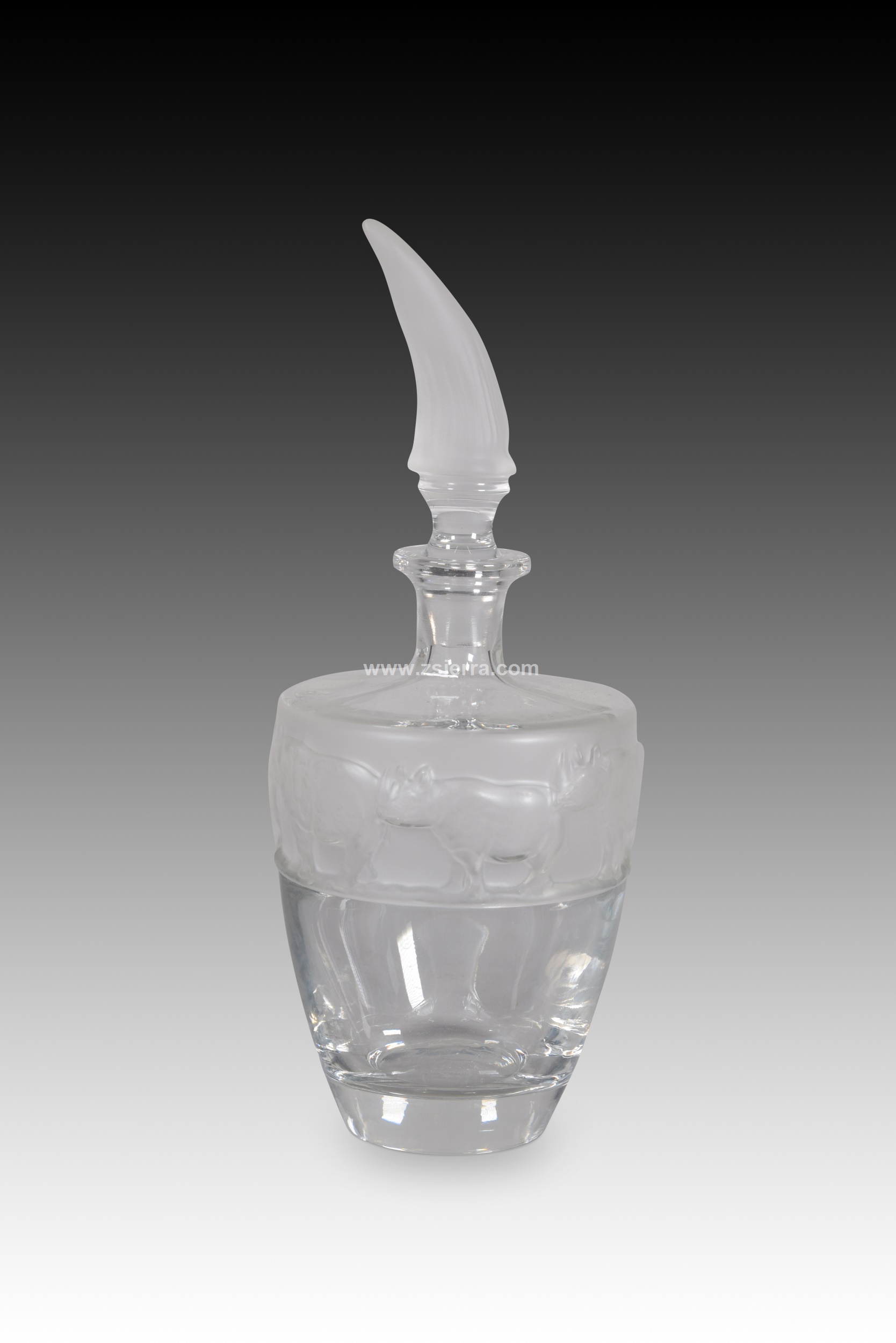 Liquor bottle, Rhinoceros. Glass. Nachtmann, Germany, 20th century. Glass decanter or bottle with a stopper topped with a rhinoceros horn and a decoration of black rhinos on the top of the piece. It belongs to the Safari series. Natchmann (FX Nachtmann Bleikristallwerke GmbH) is a fine glassware factory that is still active and was founded in 1834 by Michael Nachtmann in Unterhütte, Oberpfalz (Bavaria, Germany). In 2004 it was taken over by Riedel, who has continued with the firm and its name.