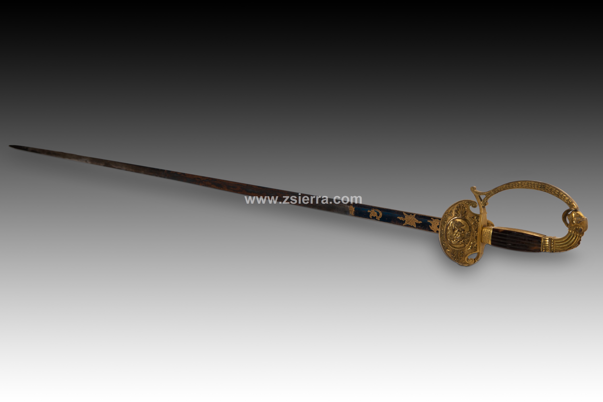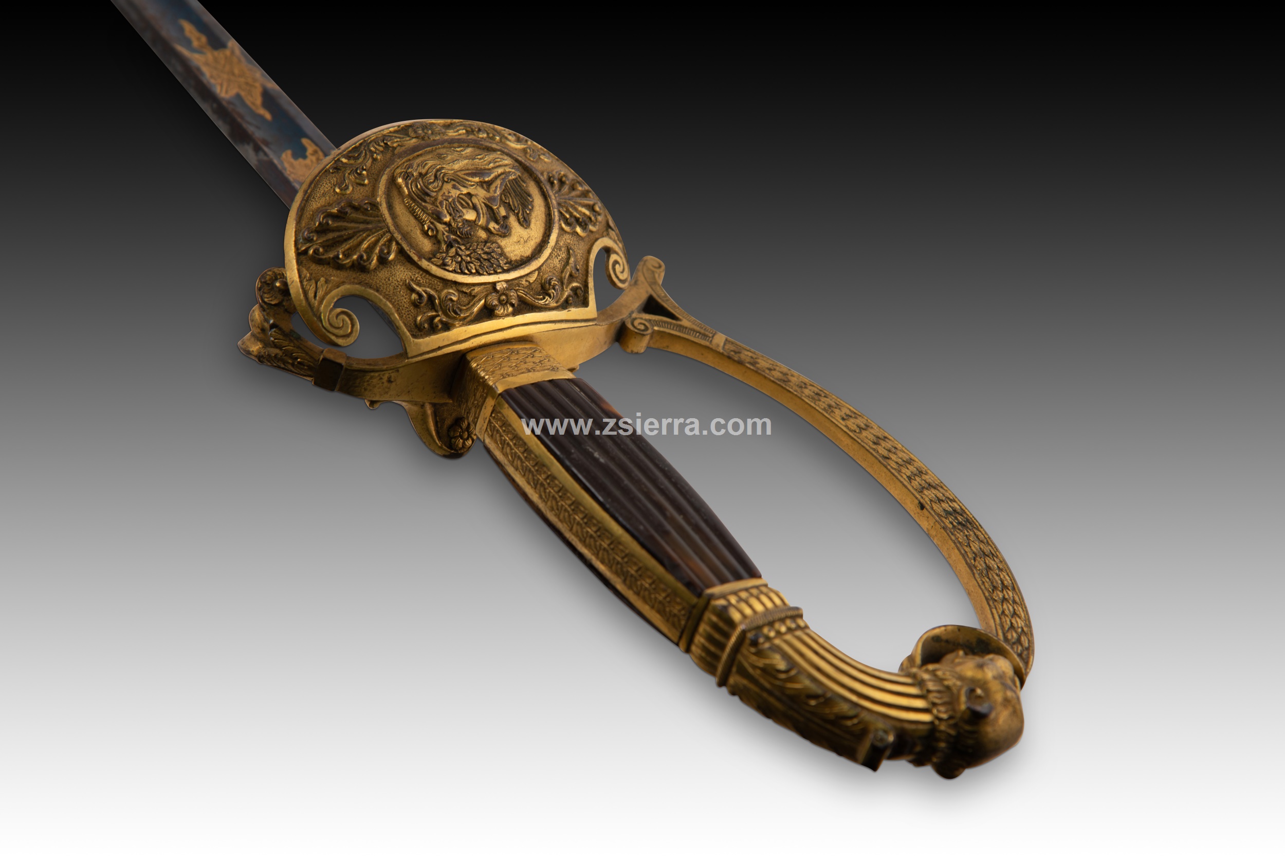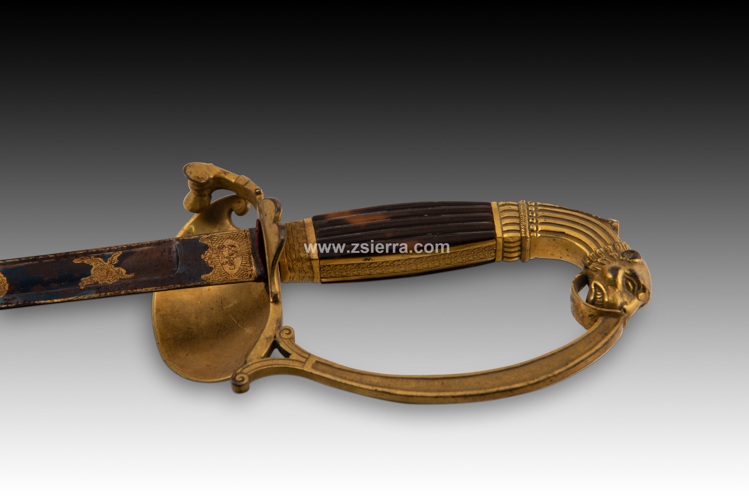 Officer's girdle sword, dress sabre or officer's sabre. Solingen, Germany, first quarter of the 19th century. Signed sheet. It has a garnish with decorative elements of a strong classical influence in relief and a pommel with a lion's head on a curve. Note the handles, with two bands with plant decorations. The front of the handle has scrolls, palms and plant elements framed by a figurative theme also classical (possibly a river allegory). The straight blade has the first third decorated with a blued finish and gold engravings (on the moustache you can clearly read "Solingen"), the second follows the recessed edge ending in a point, and the final part already shows the two edges that are common in these pieces.