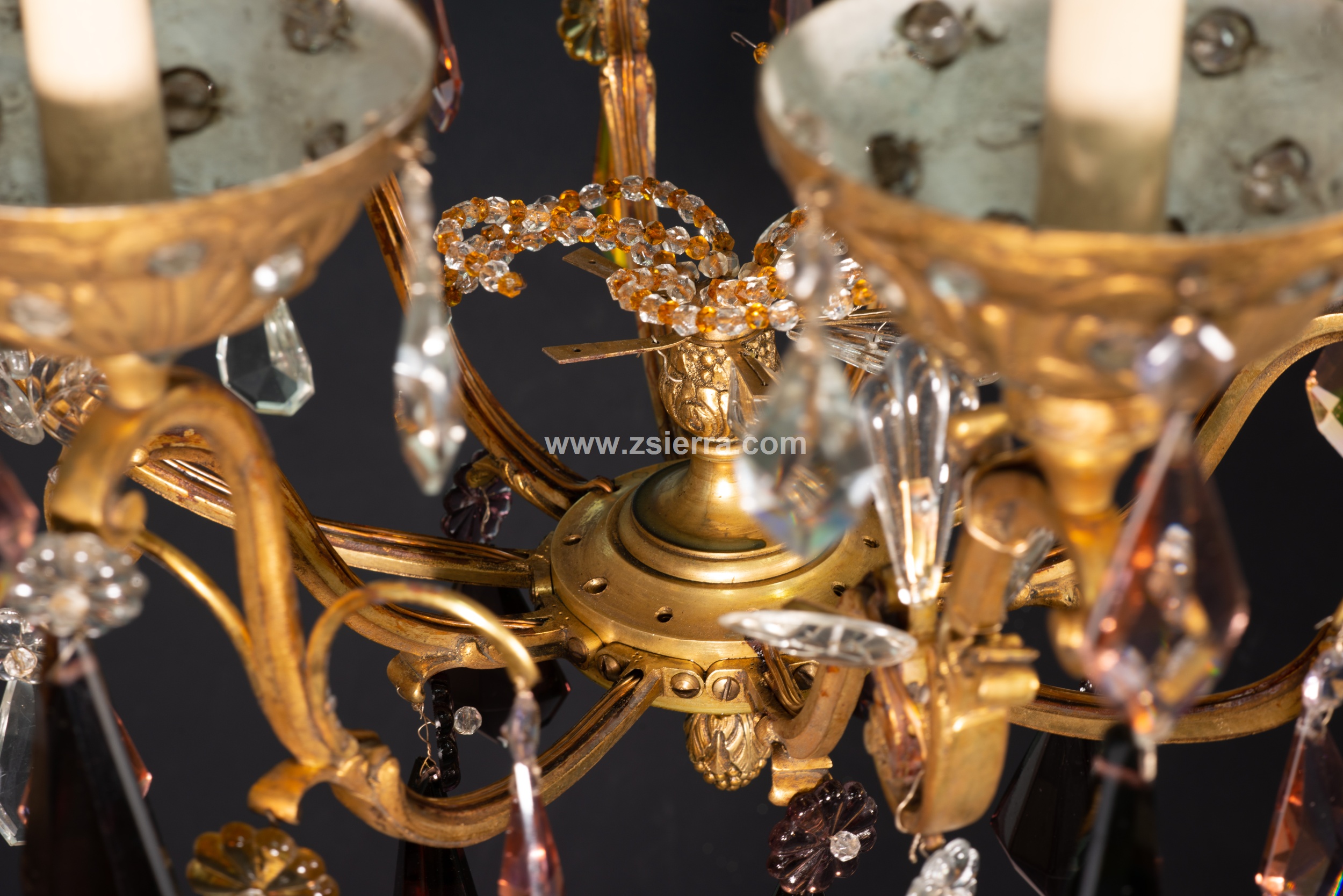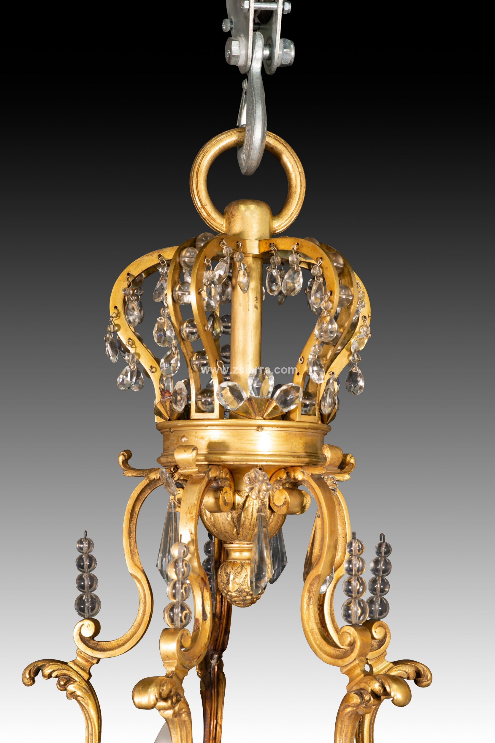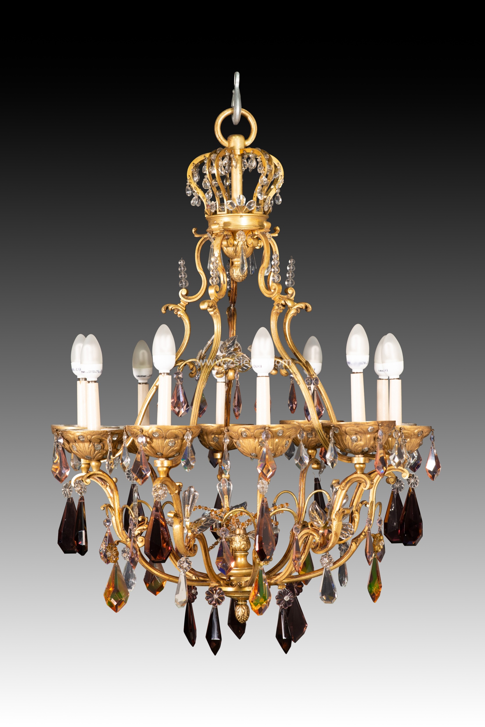 Ceiling lamp or chandelier. Bronze, glass. 20th century. Ceiling chandelier made of gilded bronze and metal that features plant elements of classicist influence, following 19th century models common especially in the French school (influence also present in the shape of the lamp), and transparent glass beads of various shapes and sizes (leaves, tears, flowers, etc.) and colors, a chromatic combination that was not the most common in these old examples.