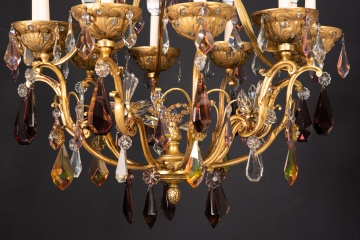 CHANDELIER. BRONZE, GLASS. 20TH CENTURY.
