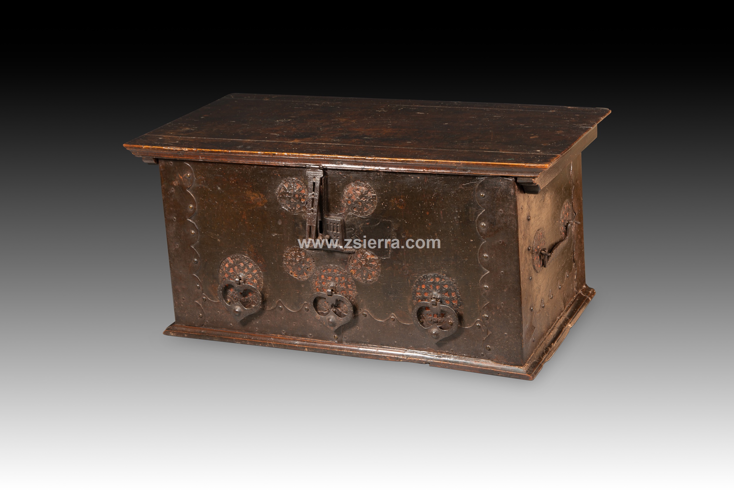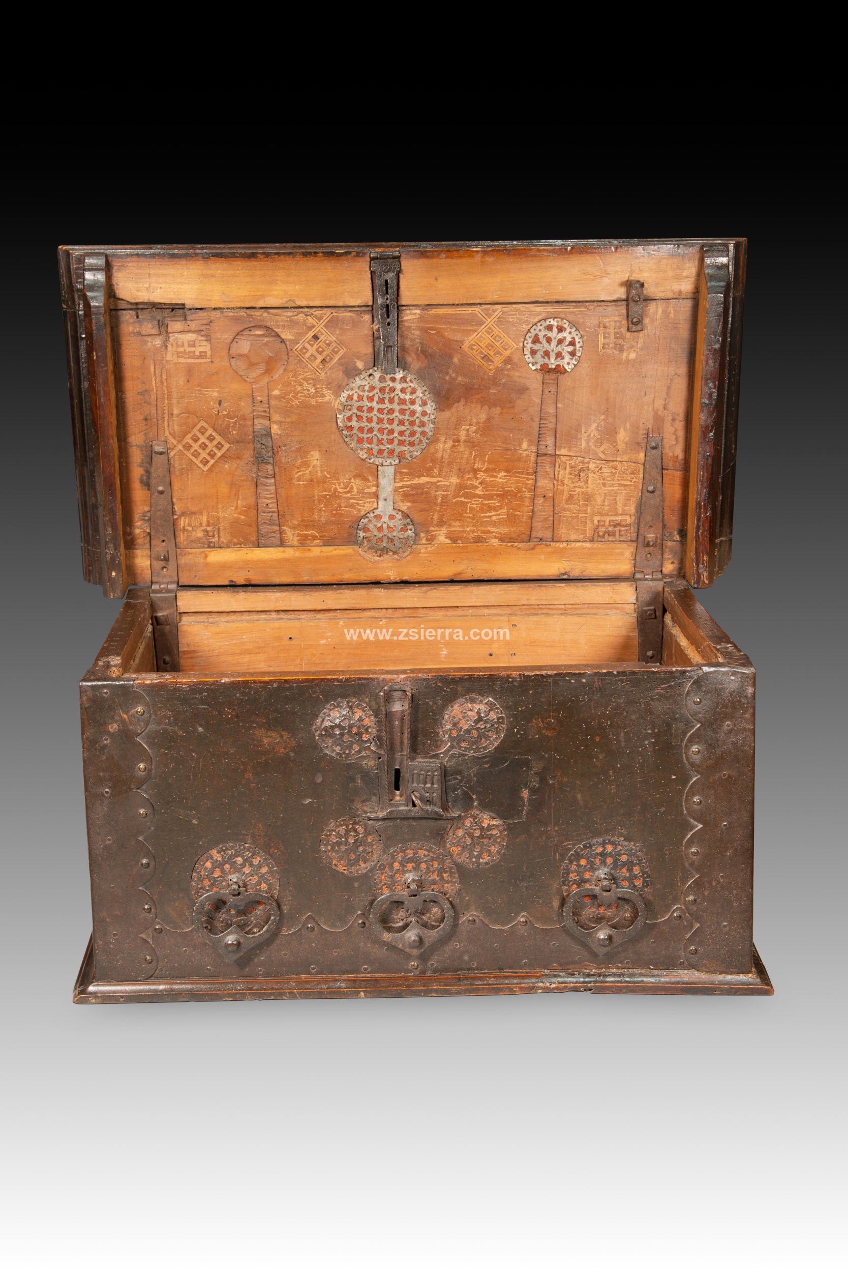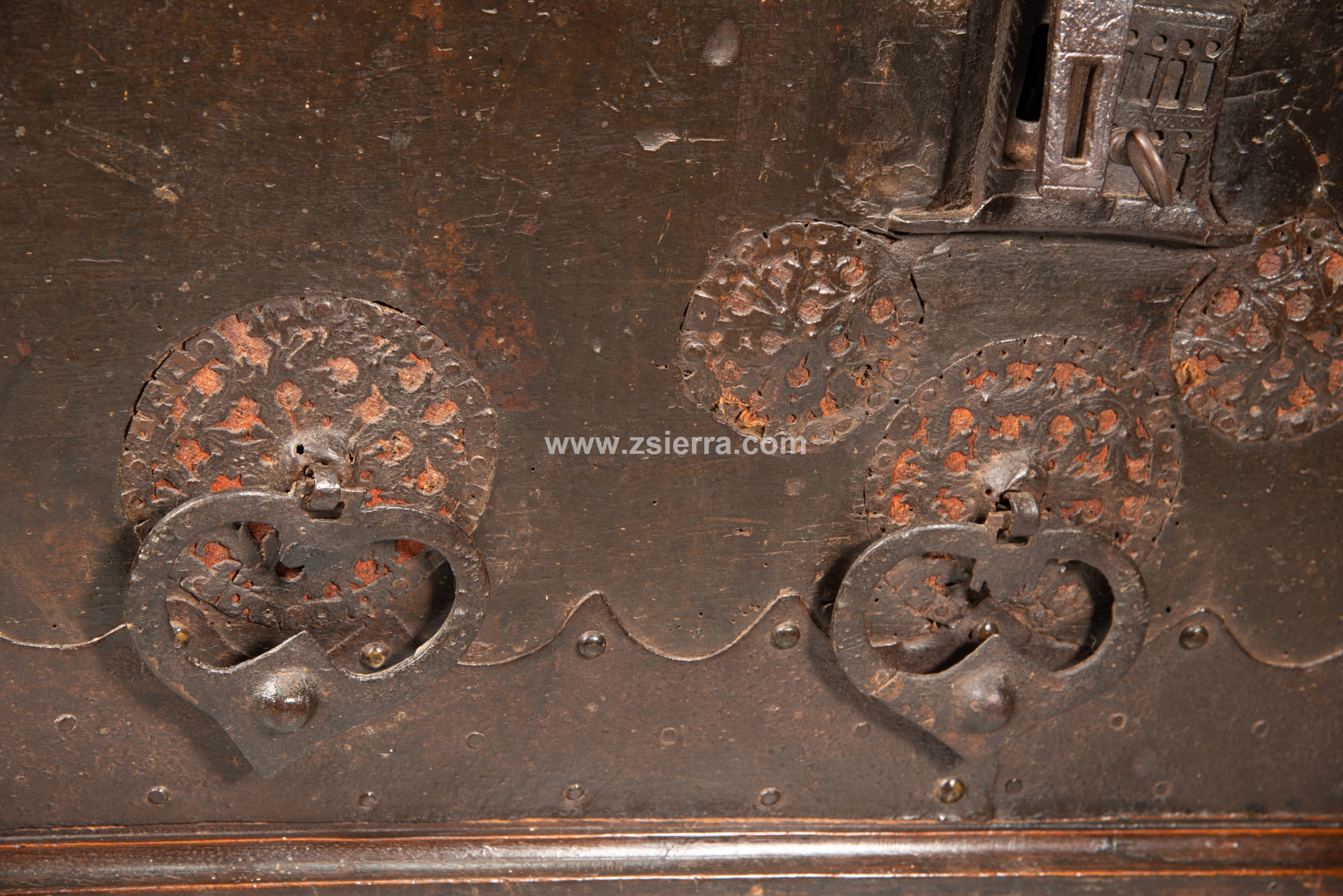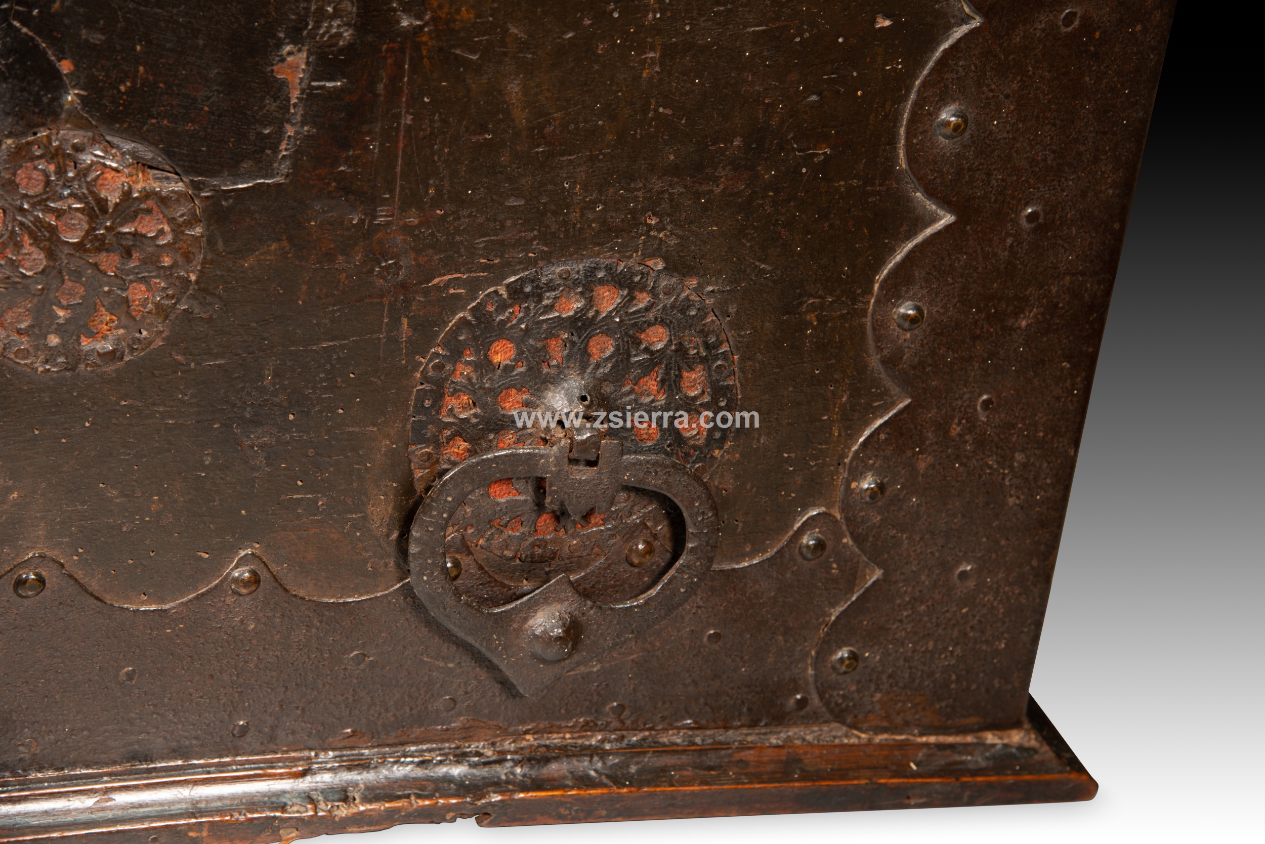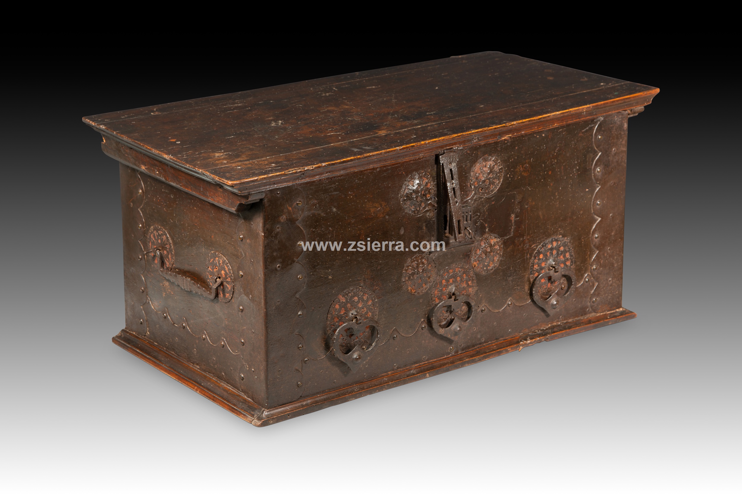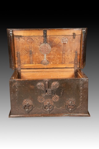 Chest. Wood, iron, marquetry. Italian school, 16th century. It has faults. A rectangular chest with a flat lid, carved from wood and decorated on the exterior with wrought iron elements. The front features wavy patterns along the lower and side edges, with three openwork circles of vegetal motifs from which hang heart-shaped metal forms. Four smaller, similar circles surround the lock, whose shield is shaped like a building with a tower. The sides also feature more wavy patterns (of the aforementioned motifs) and openwork circles, as well as handles. The metal handles on the sides extend to the back of the chest. Inside, the lid displays more of these openwork metal circles with a red background and traces of simple marquetry with geometric motifs. Small stars are carved along the edges of the chest. Stylistically, it is reminiscent of examples from the 16th and 17th centuries common in areas of Lombardy, although it is a type that some experts consider relatively common throughout the Italian school until the popularization of the more characteristic models of the Renaissance. Examples with details in common with this chest are held by institutions such as the Victoria & Albert Museum in London, or the Vittoriano e Palazzo Venezia (VIVE, Rome; inventory 1135, Lombard “cassone” from the late 15th-early 16th century in walnut, metal and wood, located in the Palazzo Venezia).