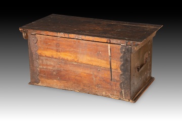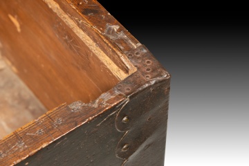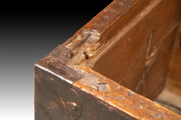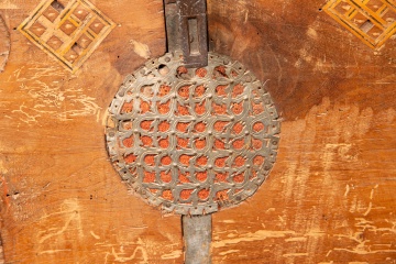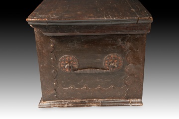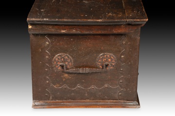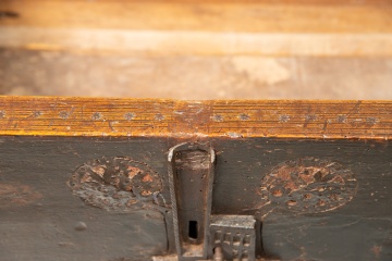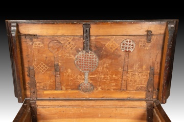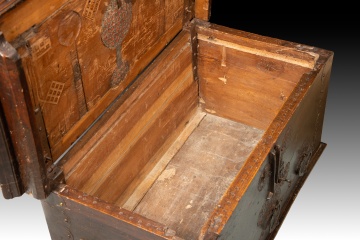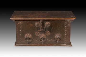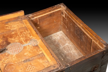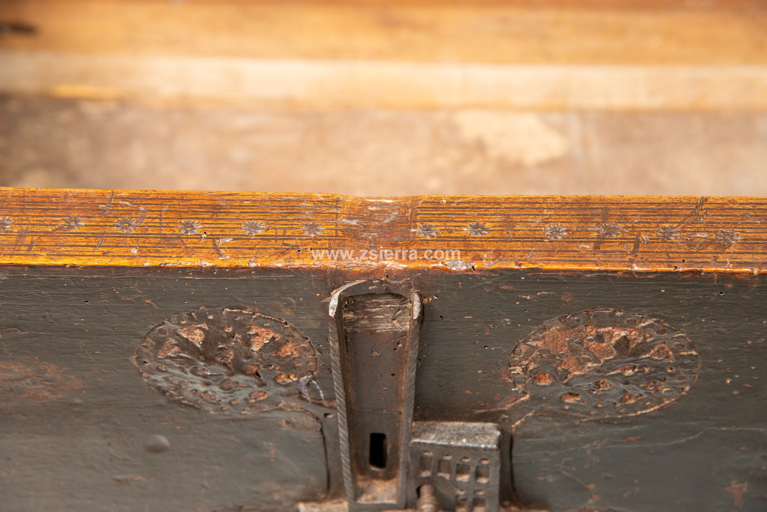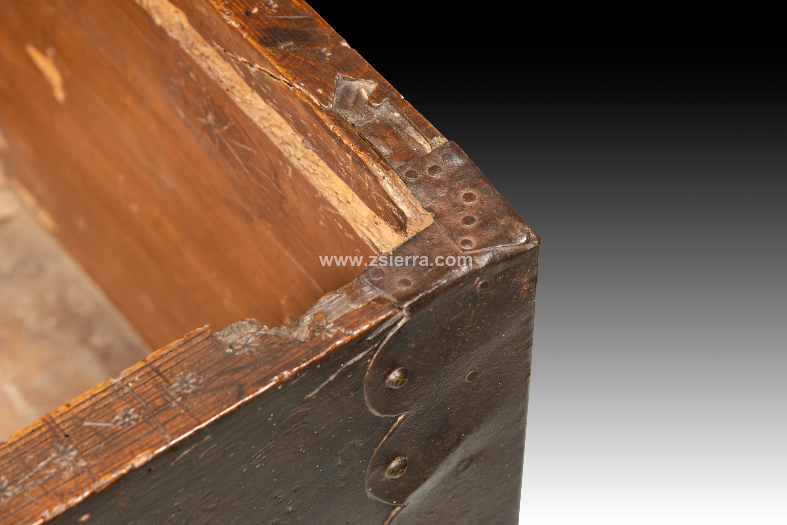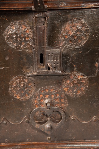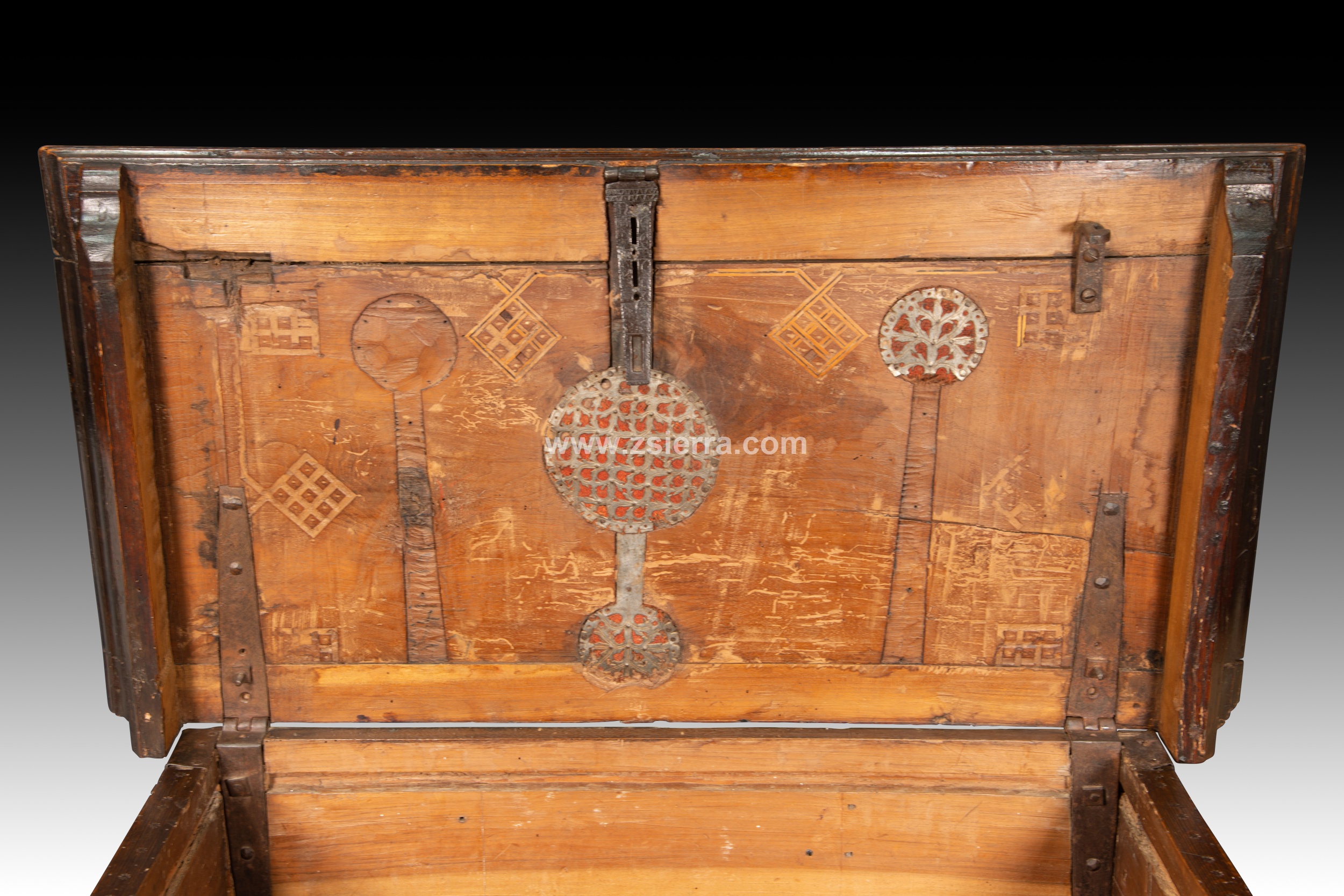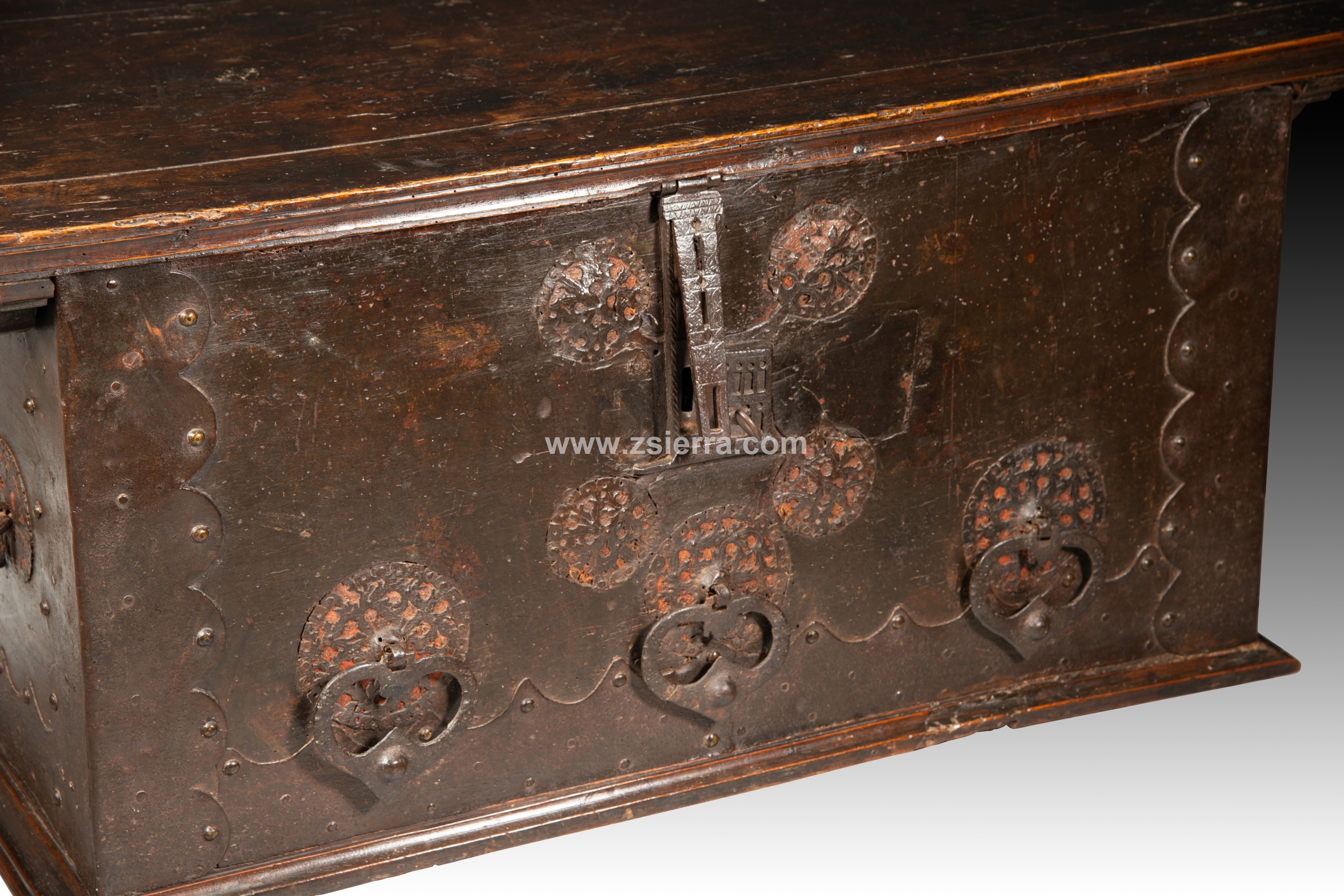 Chest. Wood, iron, marquetry. Italian school, 16th century. It has faults. A rectangular chest with a flat lid, carved from wood and decorated on the exterior with wrought iron elements. The front features wavy patterns along the lower and side edges, with three openwork circles of vegetal motifs from which hang heart-shaped metal forms. Four smaller, similar circles surround the lock, whose shield is shaped like a building with a tower. The sides also feature more wavy patterns (of the aforementioned motifs) and openwork circles, as well as handles. The metal handles on the sides extend to the back of the chest. Inside, the lid displays more of these openwork metal circles with a red background and traces of simple marquetry with geometric motifs. Small stars are carved along the edges of the chest. Stylistically, it is reminiscent of examples from the 16th and 17th centuries common in areas of Lombardy, although it is a type that some experts consider relatively common throughout the Italian school until the popularization of the more characteristic models of the Renaissance. Examples with details in common with this chest are held by institutions such as the Victoria & Albert Museum in London, or the Vittoriano e Palazzo Venezia (VIVE, Rome; inventory 1135, Lombard “cassone” from the late 15th-early 16th century in walnut, metal and wood, located in the Palazzo Venezia).