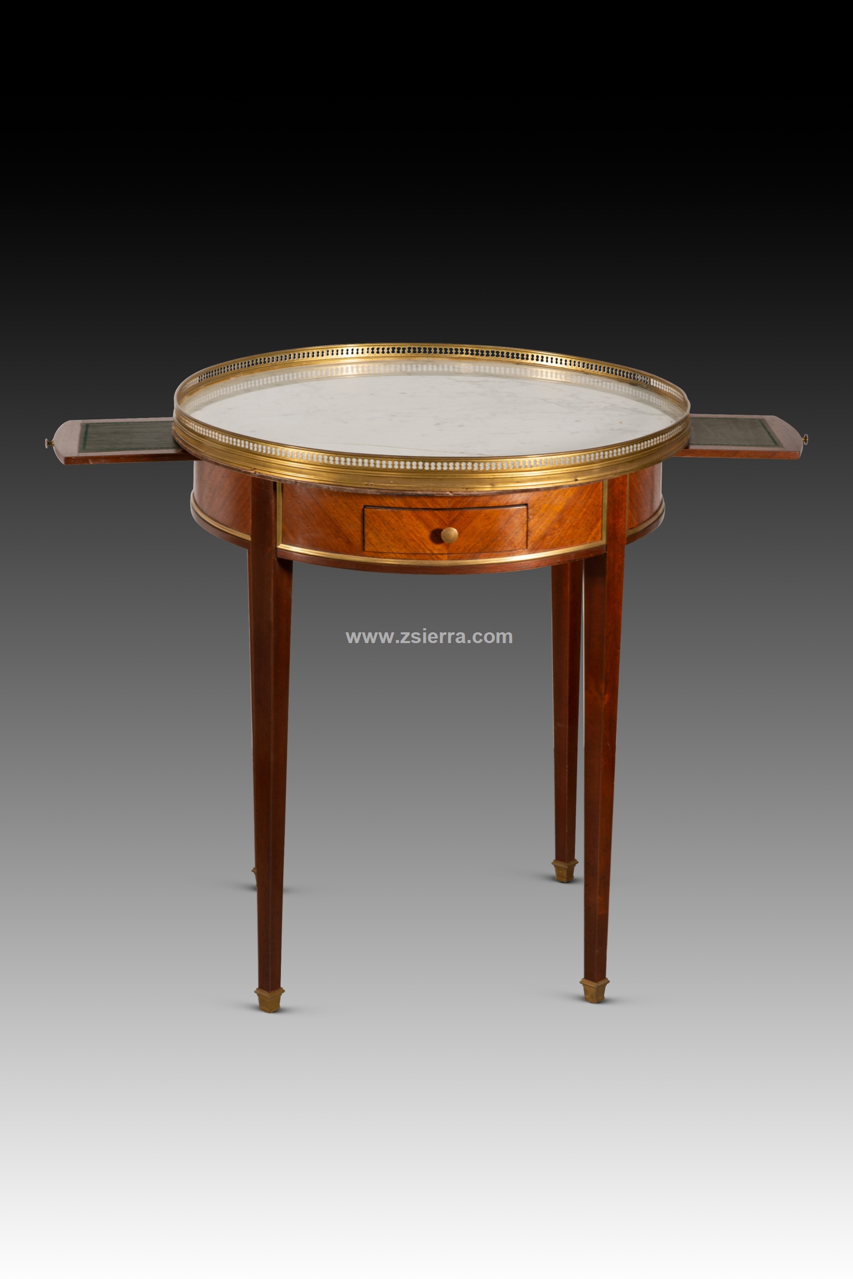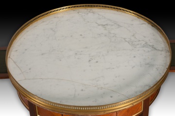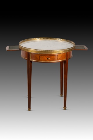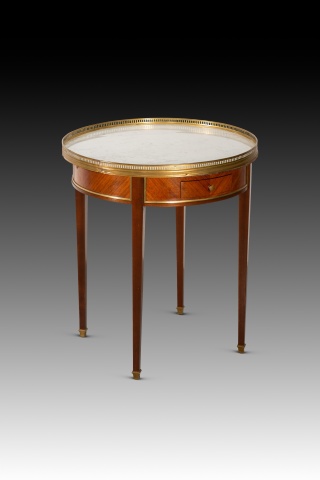 Nightstand. Wood (mahogany and rosewood veneer), marble, bronze. 19th century. It has faults. Side table with four legs finished in metal fittings, a waist decorated with strips of lighter wood than the rest, highlighted with strips of gilded metal, and a circular top of light-colored stone with a cresting around the edge. It has two drawers with handles and two removable upholstered shelves. Stylistically, it is reminiscent of 19th-century French school designs.