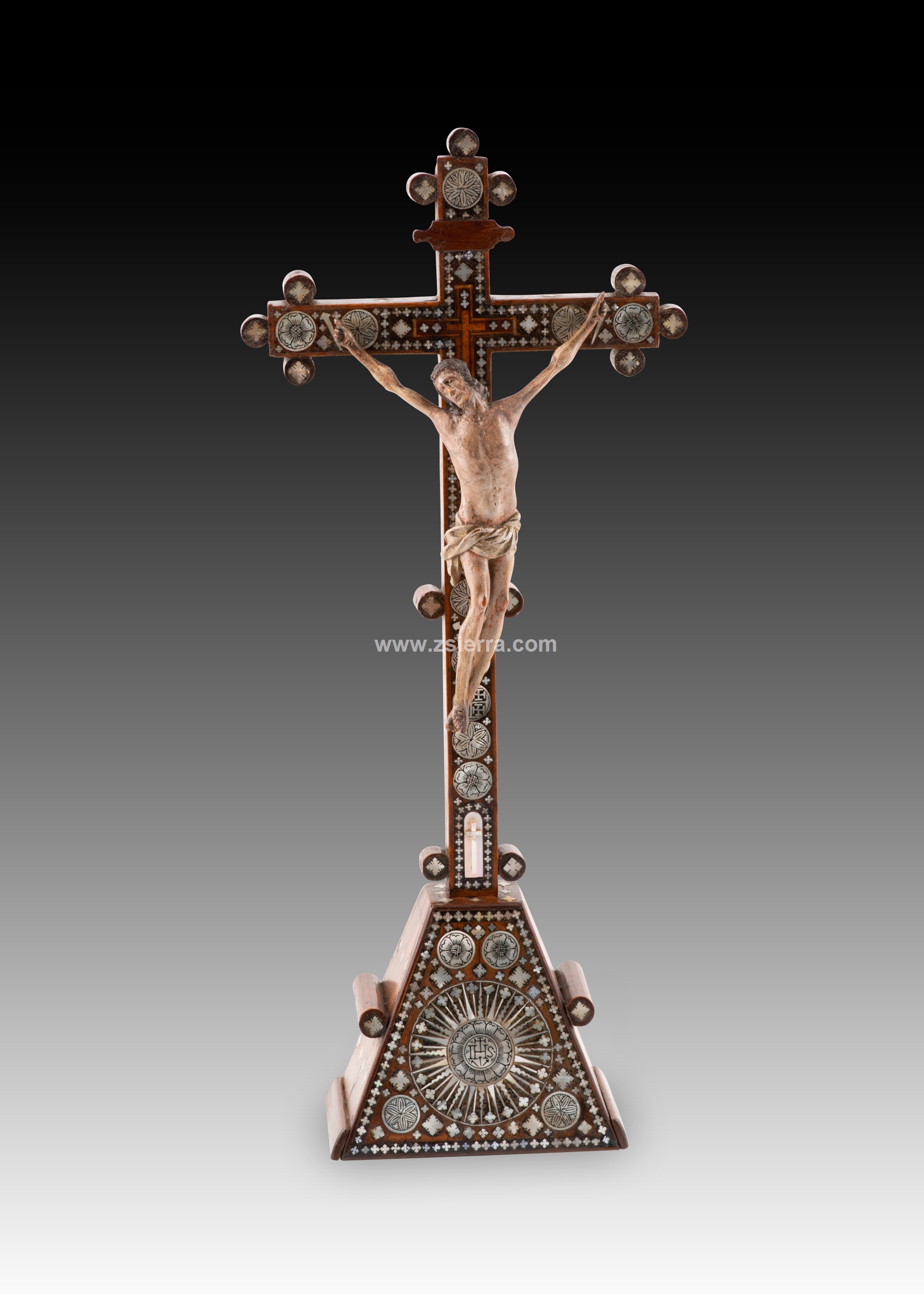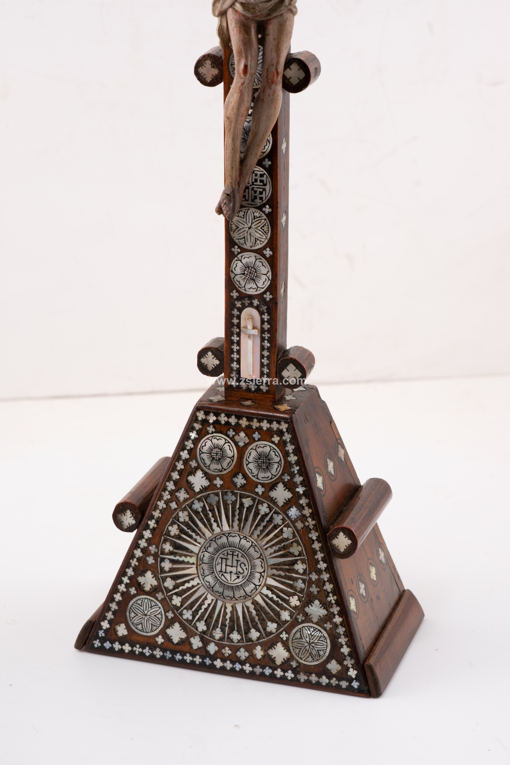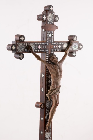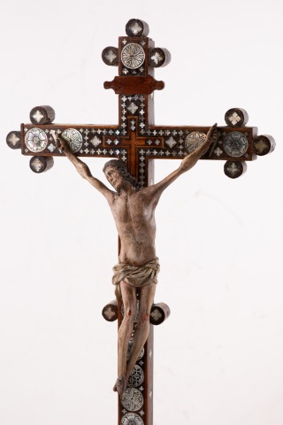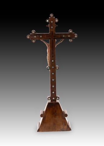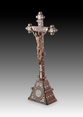 Crucified Christ with base. Wood, mother-of-pearl. Jerusalem. 18th century A crucified Christ is depicted on a cross with a triangular base decorated with mother-of-pearl elements featuring engraved and tinted details, and darker wood combined to create floral, vegetal, and simple geometric motifs. The front is adorned with the IHS symbol surmounted by a cross above the three nails of Christ. The shape of this Latin cross and its decoration are reminiscent of examples created in the Holy Land during the 18th and 19th centuries as souvenirs for pilgrims, gifts for dignitaries, and so on.
