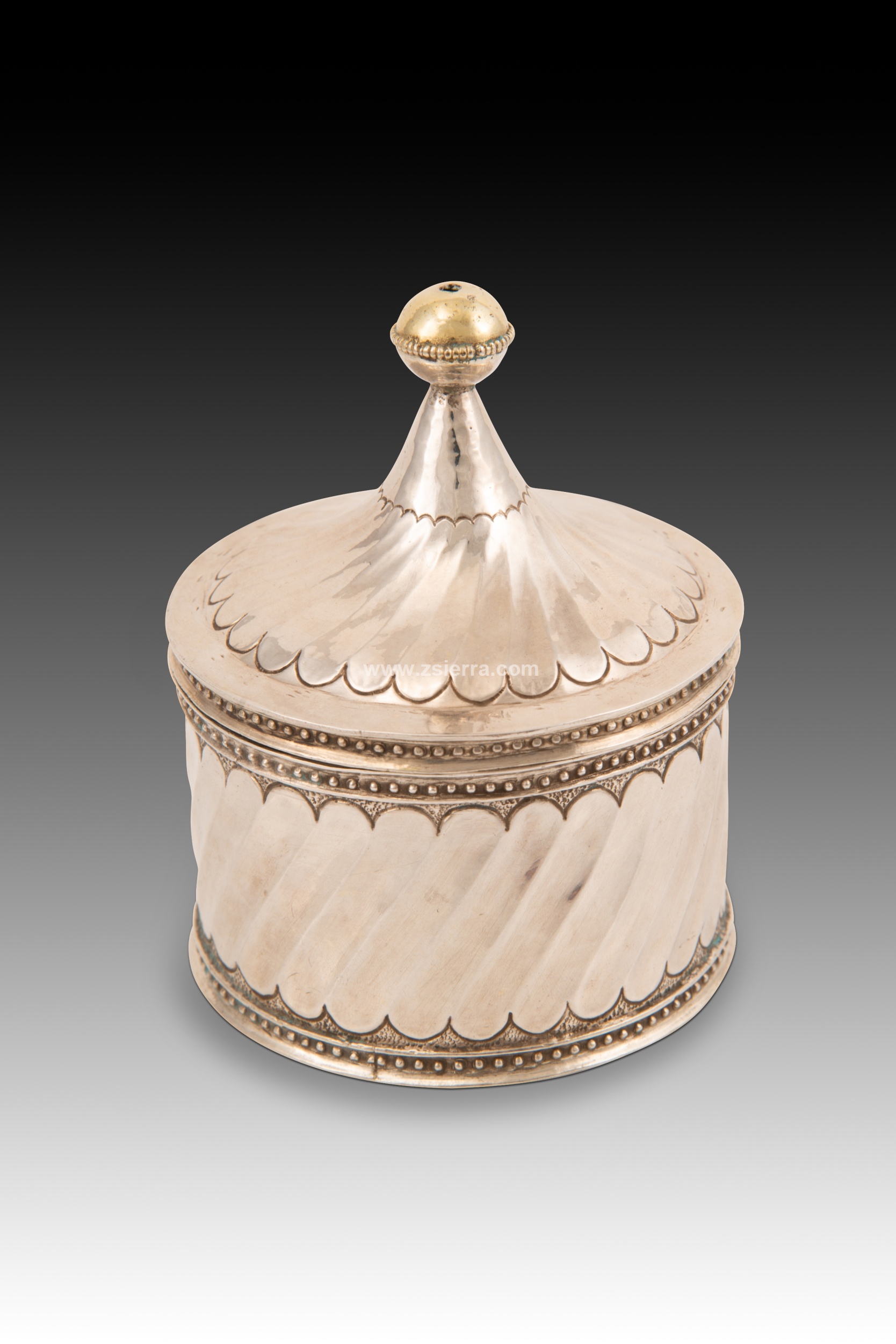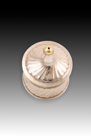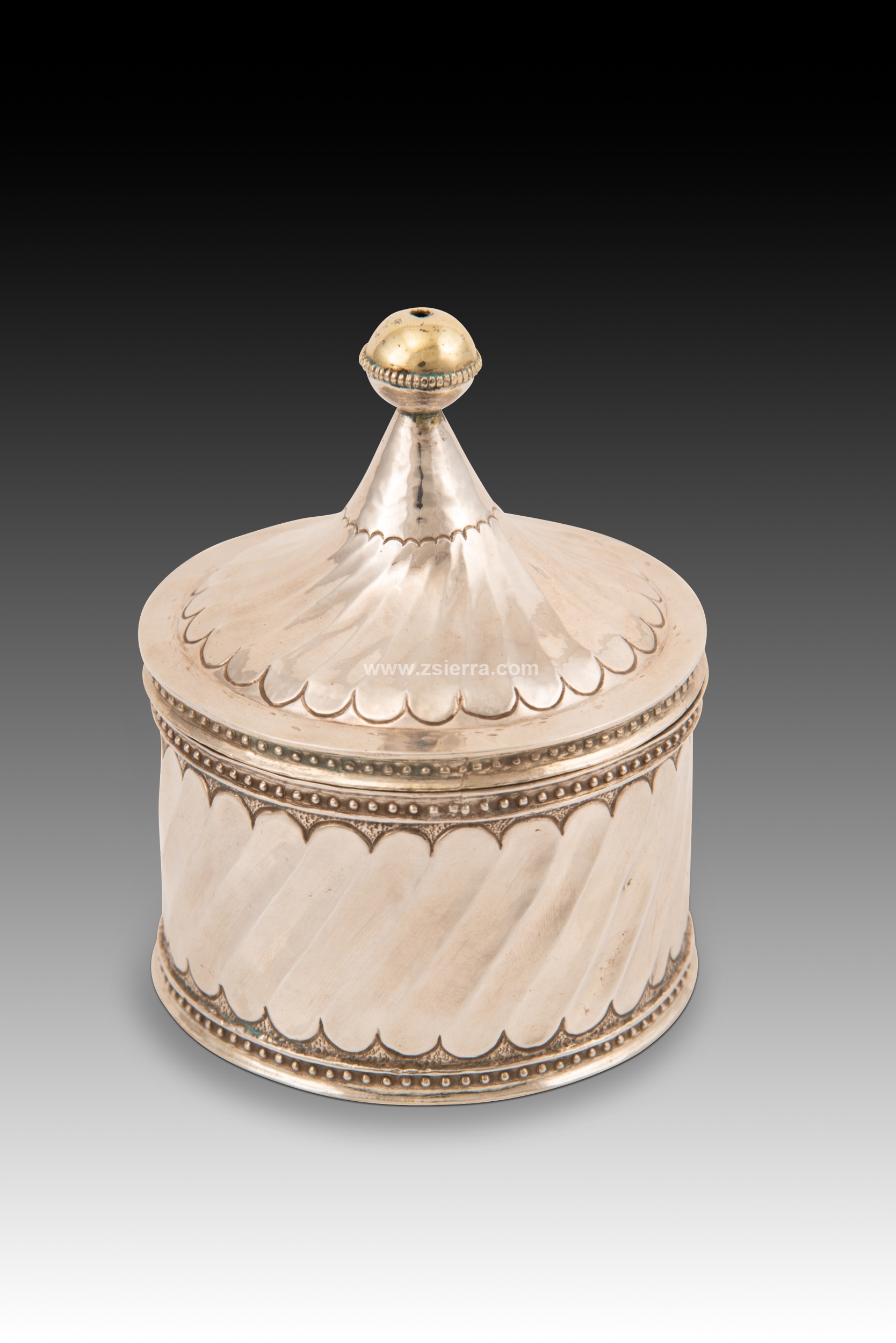Pyx. Silver. Palencia, Spain. Pedro de Palacios, hallmark Juan de Peso, circa 1530. With contrast and engraving marks. A circular box with a pointed lid, made of silver in its natural color and gilded, decorated on the exterior with a series of slanted segments or waves on the body and lid, and moldings with concatenations of pearls. The piece is topped by a sphere divided in two by a band of small lines. The interior is gilded. Typologically, it follows a very common model for pyxes in 16th-century Spanish silversmithing. Compare, for example, with the one dated to the third third of the 16th century (inventory 2165) in the Lázaro Galdiano Museum in Madrid (Spain), which also has spirals on the lid and a cruciform finial that the present example does not have; or several examples in the Diocesan Museum of Pamplona Cathedral; or an example with vertical drawers in the lid in the Museum of Sacred Art of Bilbao (Eleiz Museoa; inventory 0578) by Izangabea, dated between 1525 and 1530. At the base are the engraving mark and the hallmarks of the town and silversmith. One is the town mark, referring to Palencia (Spain). Another, with letters beneath a scale, is that of the assayer Juan de Peso, who worked from 1526 to 1532 (experts suggest that the triple hallmarking began in 1528). The third is that of the silversmith Pedro de Palacios (elected city assayer in 1532). Similar marks appear on the reliquary arm of Saint Lawrence in Santoyo, a work by Pedro de Palacios dated between 1528 and 1532, or, according to other experts, around 1526. Weight: 217 grams.