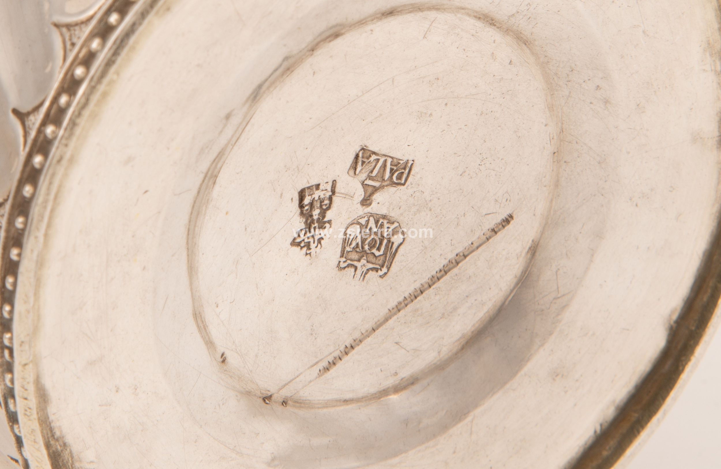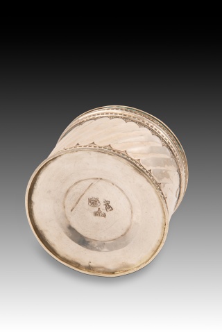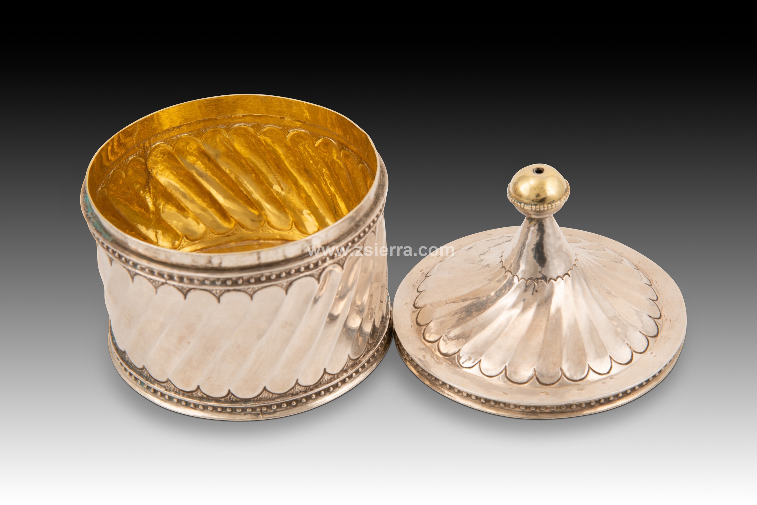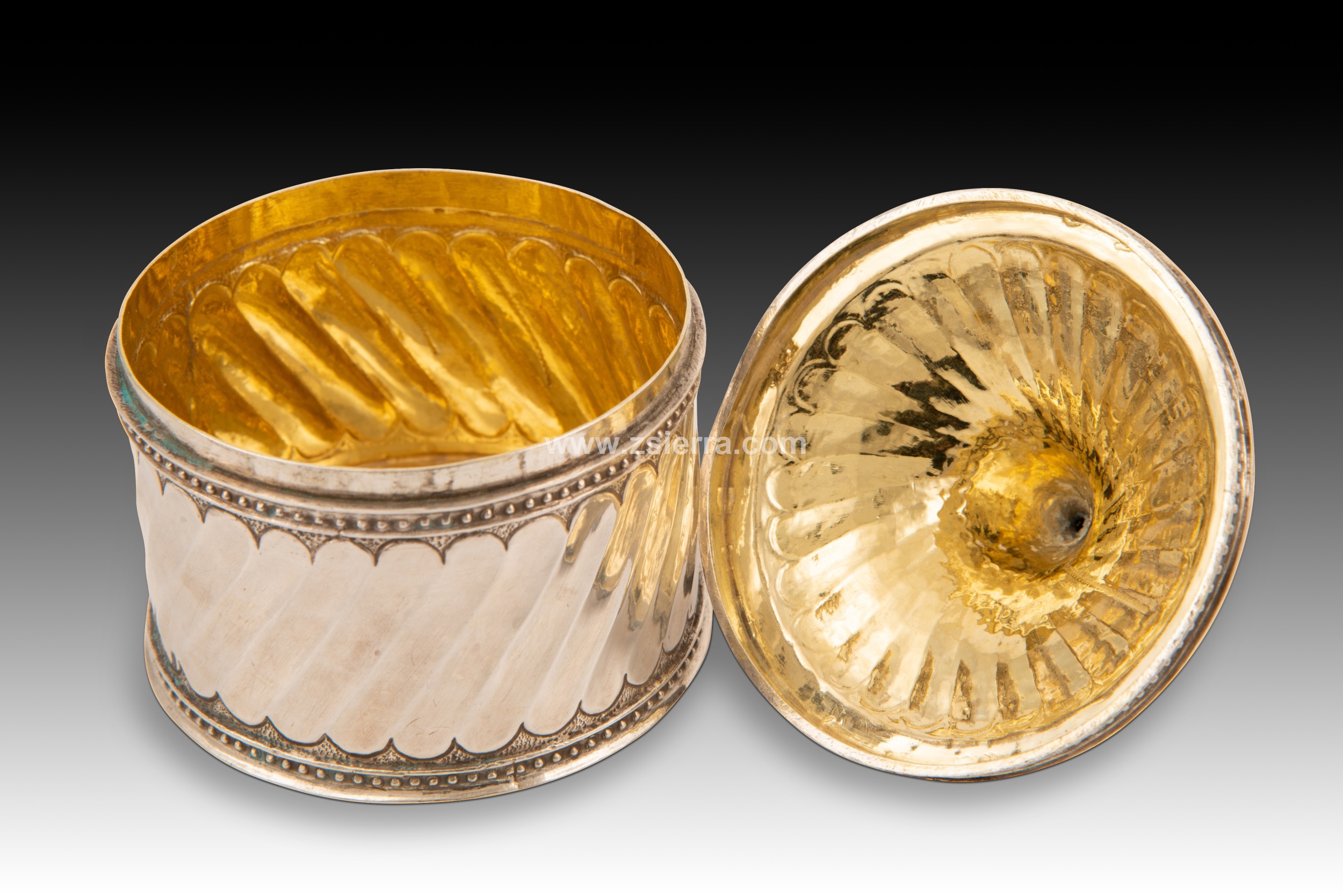 Pyx. Silver. Palencia, Spain. Pedro de Palacios, hallmark Juan de Peso, circa 1530. With contrast and engraving marks. A circular box with a pointed lid, made of silver in its natural color and gilded, decorated on the exterior with a series of slanted segments or waves on the body and lid, and moldings with concatenations of pearls. The piece is topped by a sphere divided in two by a band of small lines. The interior is gilded. Typologically, it follows a very common model for pyxes in 16th-century Spanish silversmithing. Compare, for example, with the one dated to the third third of the 16th century (inventory 2165) in the Lázaro Galdiano Museum in Madrid (Spain), which also has spirals on the lid and a cruciform finial that the present example does not have; or several examples in the Diocesan Museum of Pamplona Cathedral; or an example with vertical drawers in the lid in the Museum of Sacred Art of Bilbao (Eleiz Museoa; inventory 0578) by Izangabea, dated between 1525 and 1530. At the base are the engraving mark and the hallmarks of the town and silversmith. One is the town mark, referring to Palencia (Spain). Another, with letters beneath a scale, is that of the assayer Juan de Peso, who worked from 1526 to 1532 (experts suggest that the triple hallmarking began in 1528). The third is that of the silversmith Pedro de Palacios (elected city assayer in 1532). Similar marks appear on the reliquary arm of Saint Lawrence in Santoyo, a work by Pedro de Palacios dated between 1528 and 1532, or, according to other experts, around 1526. Weight: 217 grams.