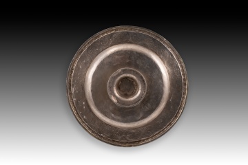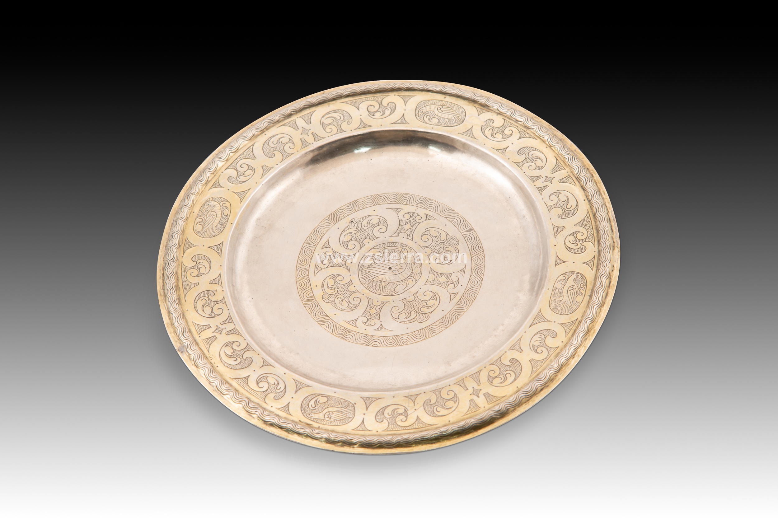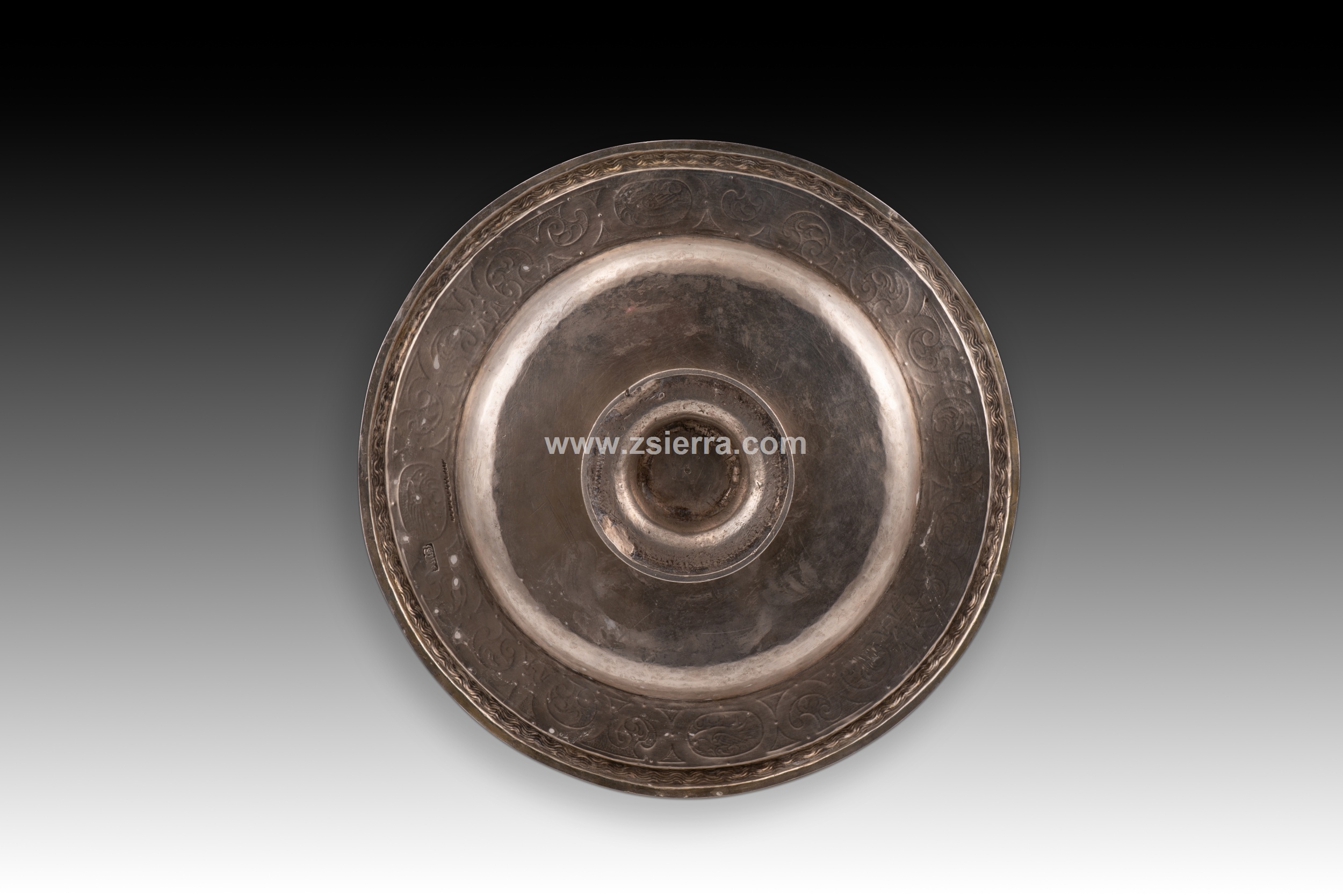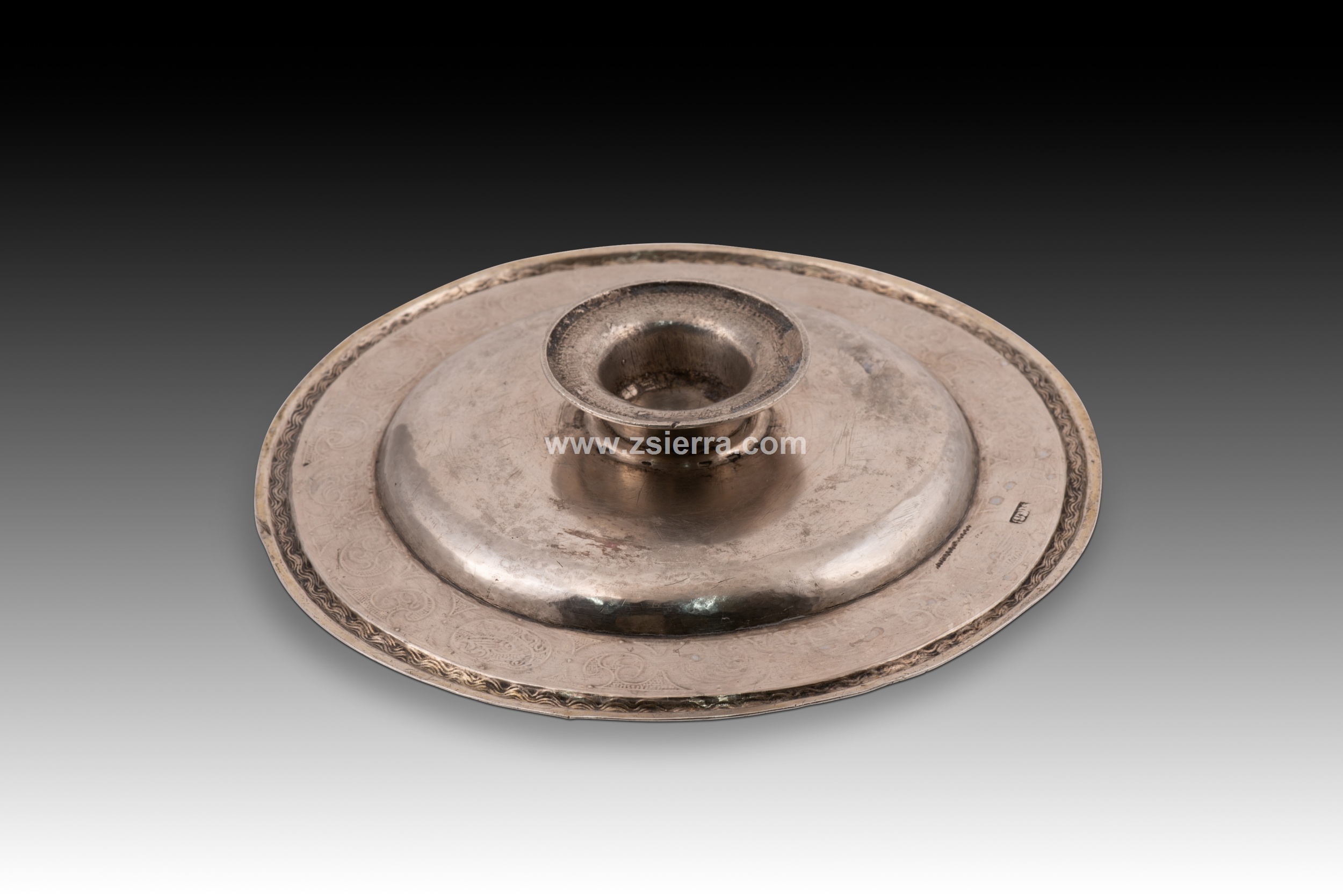 Salve or salve with a base. Silver. Zaragoza, 17th century. With contrast and engraving marks. Circular plate with a raised rim decorated with four ovals containing birds, alternating with reclining C-shapes (with vegetal motifs inside) in alternating positions, and thin ovals with rhombuses inside every other pair. The base is plain, and features a bird in a circle surrounded by reclining C-shapes open towards the center, with vegetal motifs inside, and rhombuses beneath the smaller ones, which alternate with the larger ones. Outside this central composition and along the rim, there is a band of waves. It retains some gilding. It is slightly elevated by a simple circular base. It features hallmarks on the lower part (base and plate). The hallmark that also appears on the lower part of the upper plate is considered to be from Zaragoza, Spain. Stylistically, it is reminiscent of, for example, two pieces in the Lázaro Galdiano Museum in Madrid, Spain: a platter by Agustín de Cuesta (Granada, Spain, first third of the 17th century; inventory 2496) and another from Tudela made by Noval in the second quarter of the 17th century (inventory 2467). Interestingly, neither of these two features figurative elements. A similar decoration can be seen on a Castilian pyx dated between 1575 and 1600 (National Archaeological Museum of Madrid, inventory 19659). Weight: 478 grams.