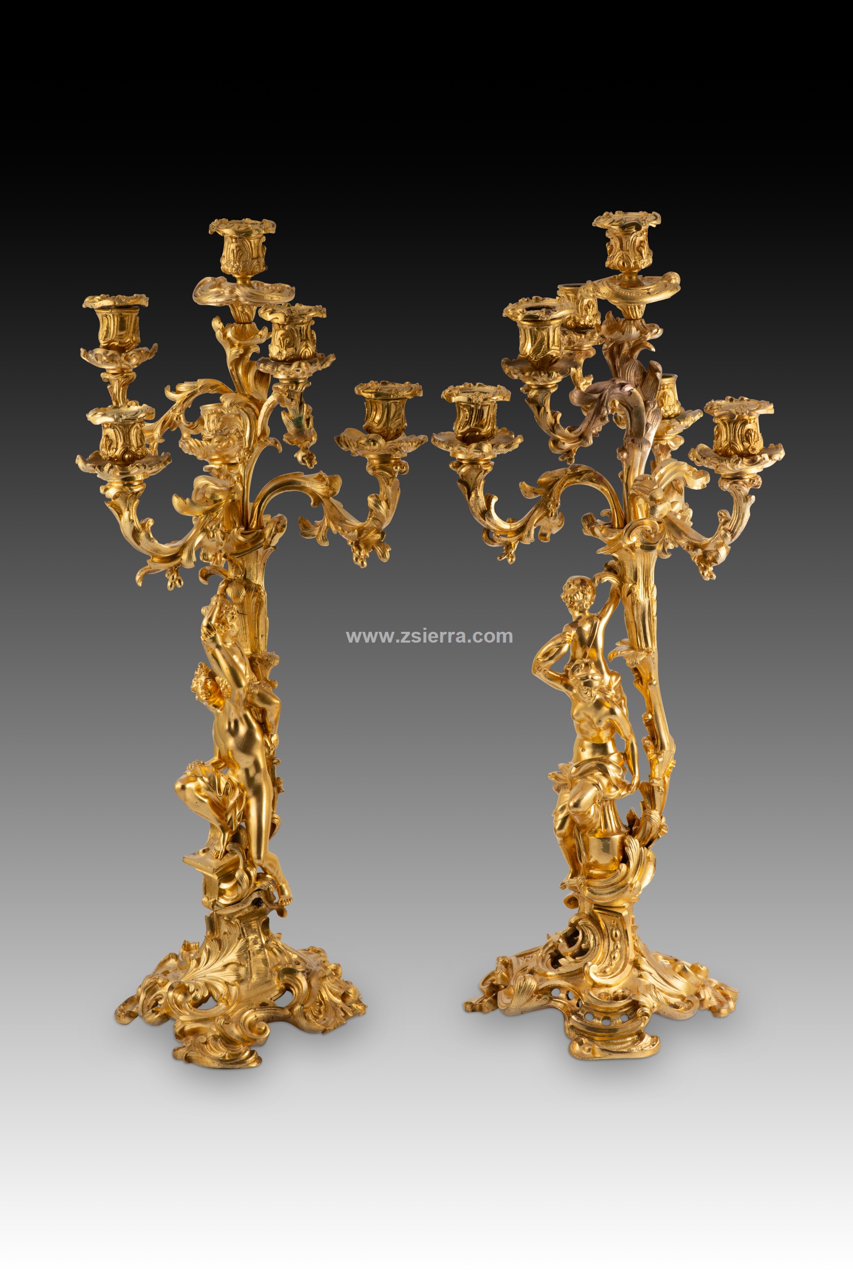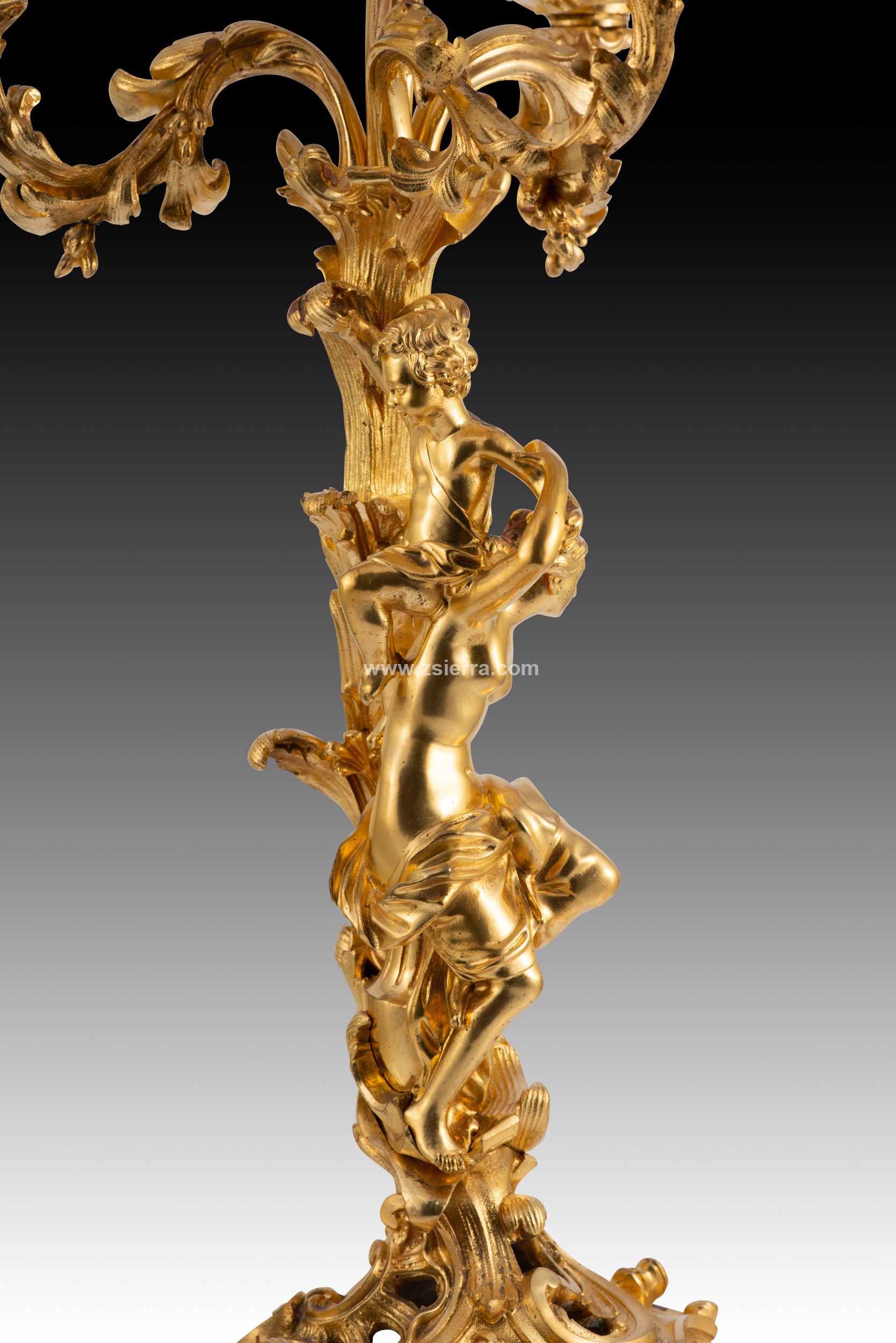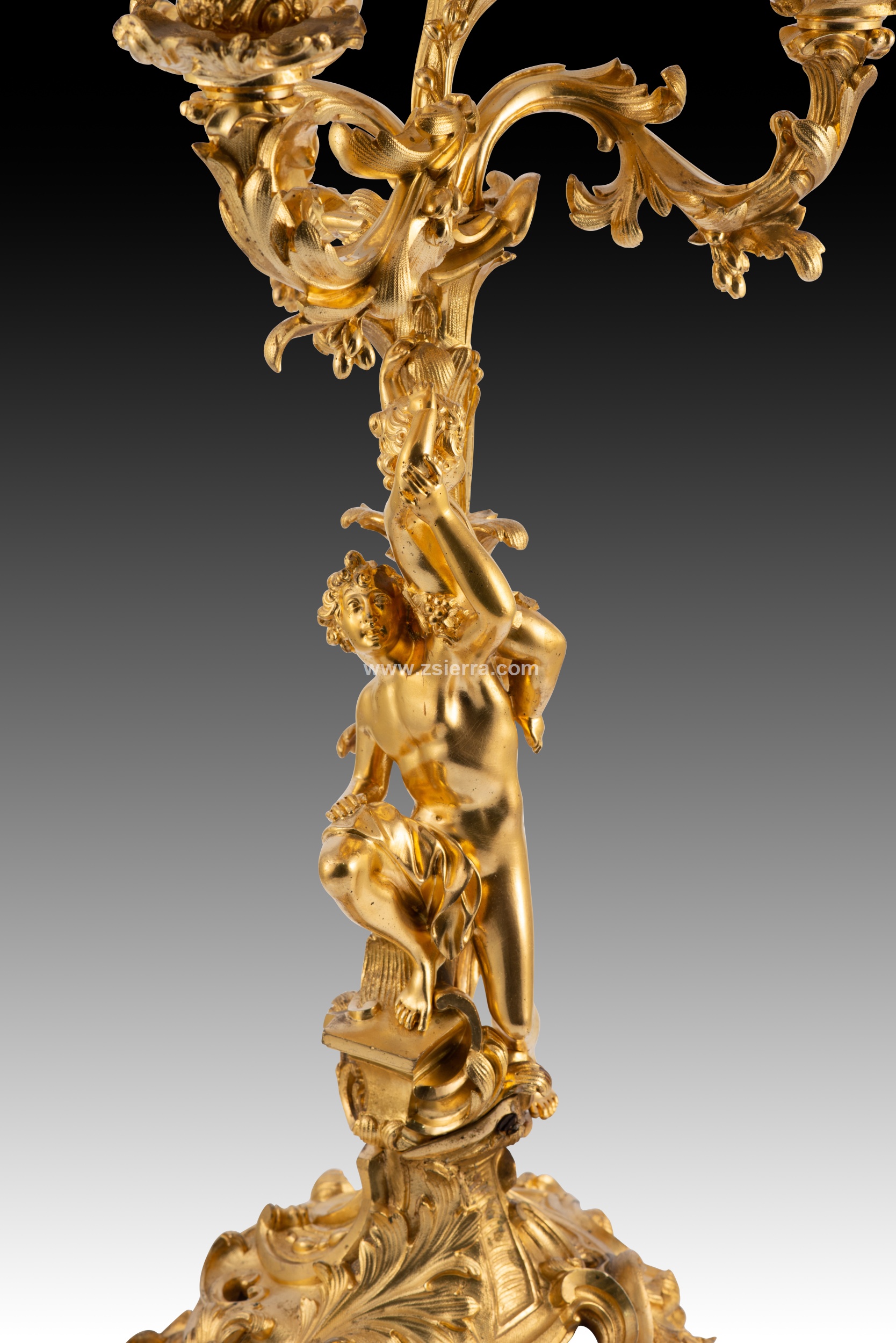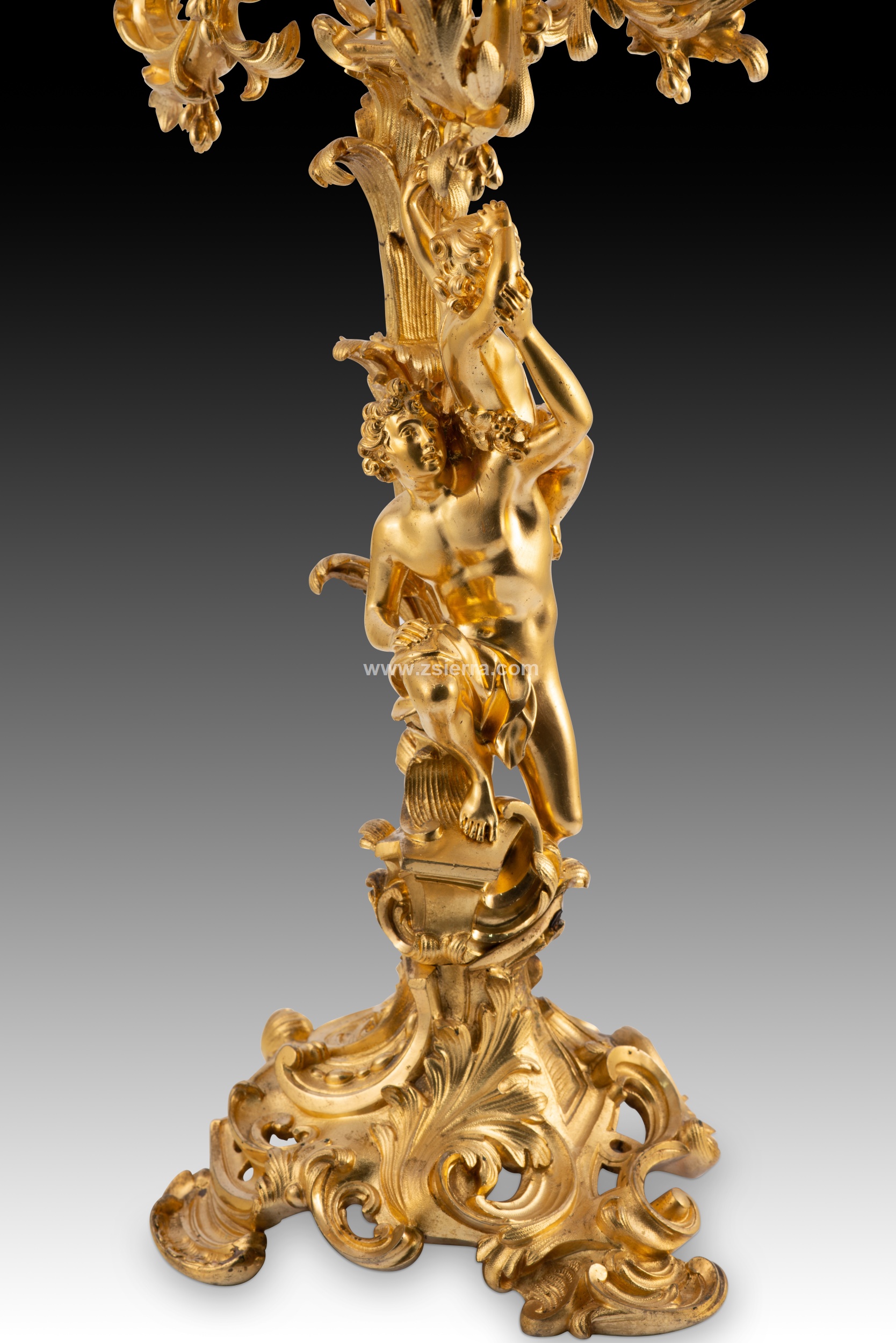 Pair of candlesticks. Gilt bronze. 19th century, following French models. It is missing. Pair of gilt bronze candelabra with bases featuring architectural and vegetal elements clearly influenced by the Rococo style. The stems are decorated with human figures derived from classical mythological models, arranged in a spiral reminiscent of Italian Baroque works (Bacchanalia). The arms feature vegetal motifs typical of 19th-century French school pieces. Each arm terminates in a more or less flat surface decorated with vegetal elements, from which a candle holder emerges (some candle ornaments are missing), providing a total of six lights per candelabra. Weight: 14.4 kg.