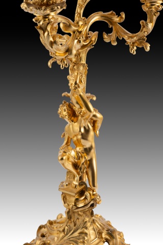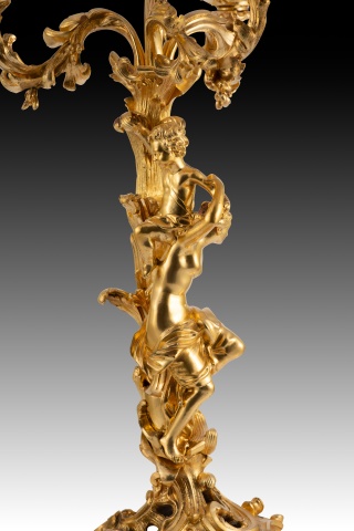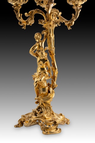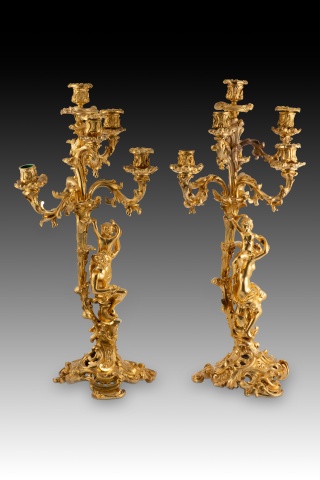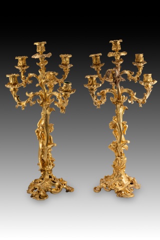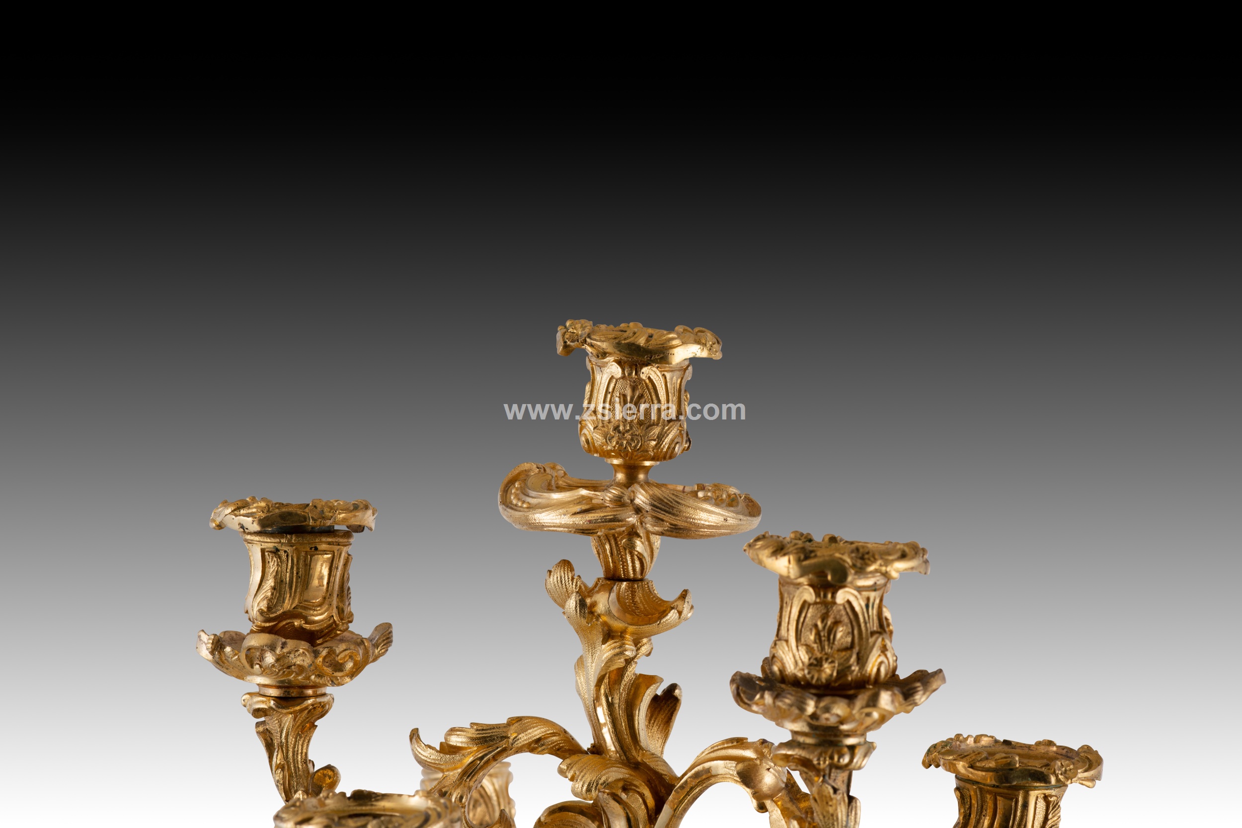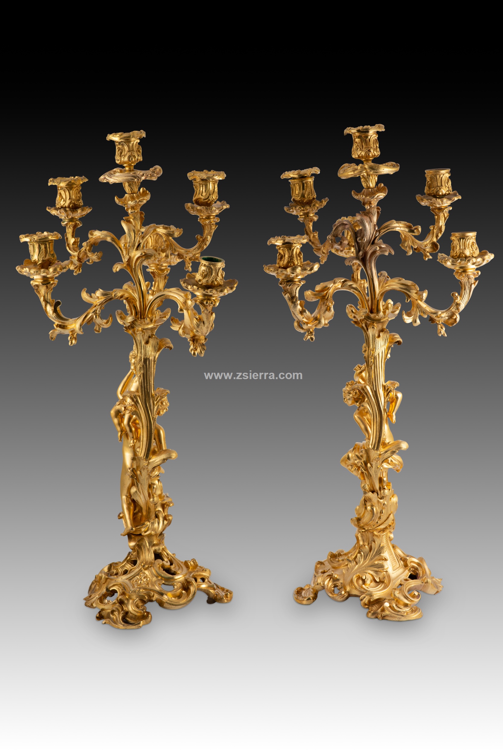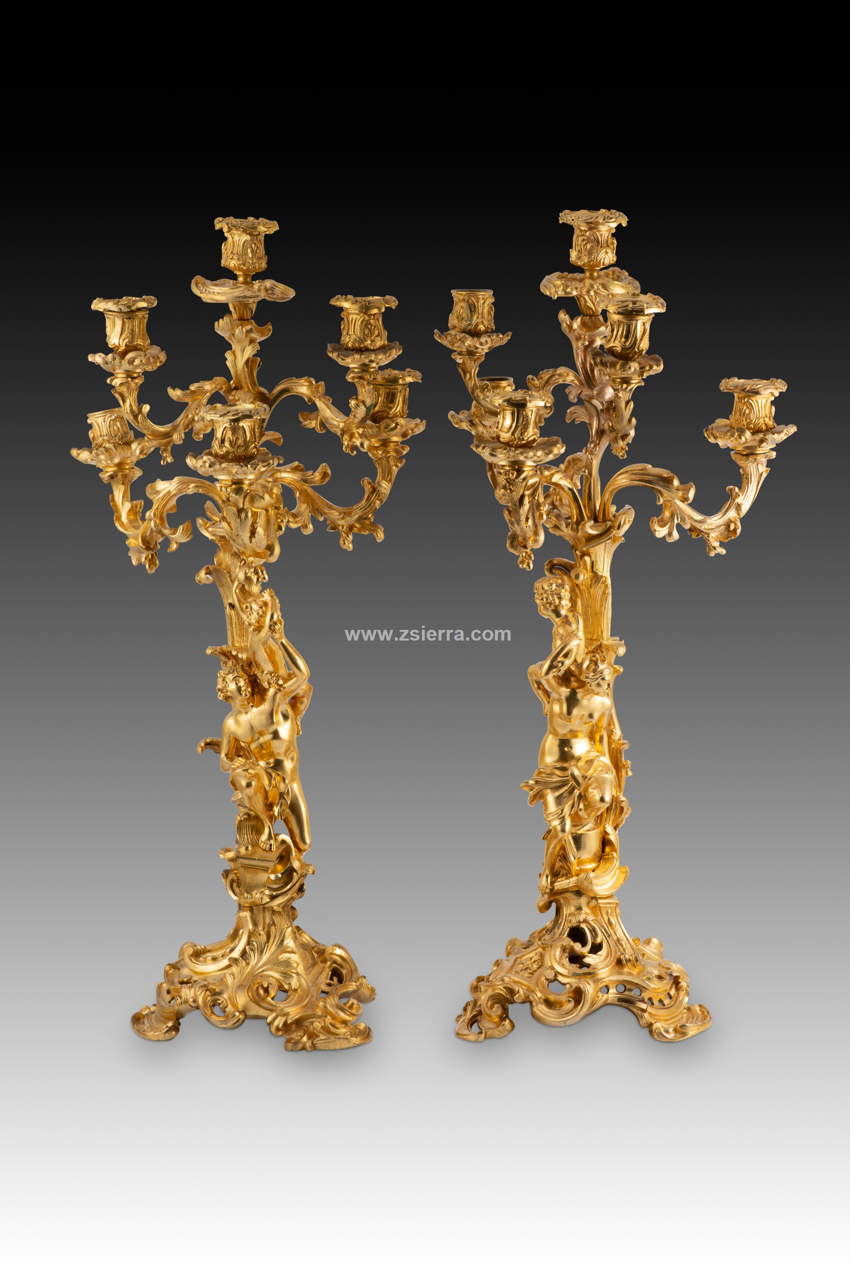 Pair of candlesticks. Gilt bronze. 19th century, following French models. It is missing. Pair of gilt bronze candelabra with bases featuring architectural and vegetal elements clearly influenced by the Rococo style. The stems are decorated with human figures derived from classical mythological models, arranged in a spiral reminiscent of Italian Baroque works (Bacchanalia). The arms feature vegetal motifs typical of 19th-century French school pieces. Each arm terminates in a more or less flat surface decorated with vegetal elements, from which a candle holder emerges (some candle ornaments are missing), providing a total of six lights per candelabra. Weight: 14.4 kg.