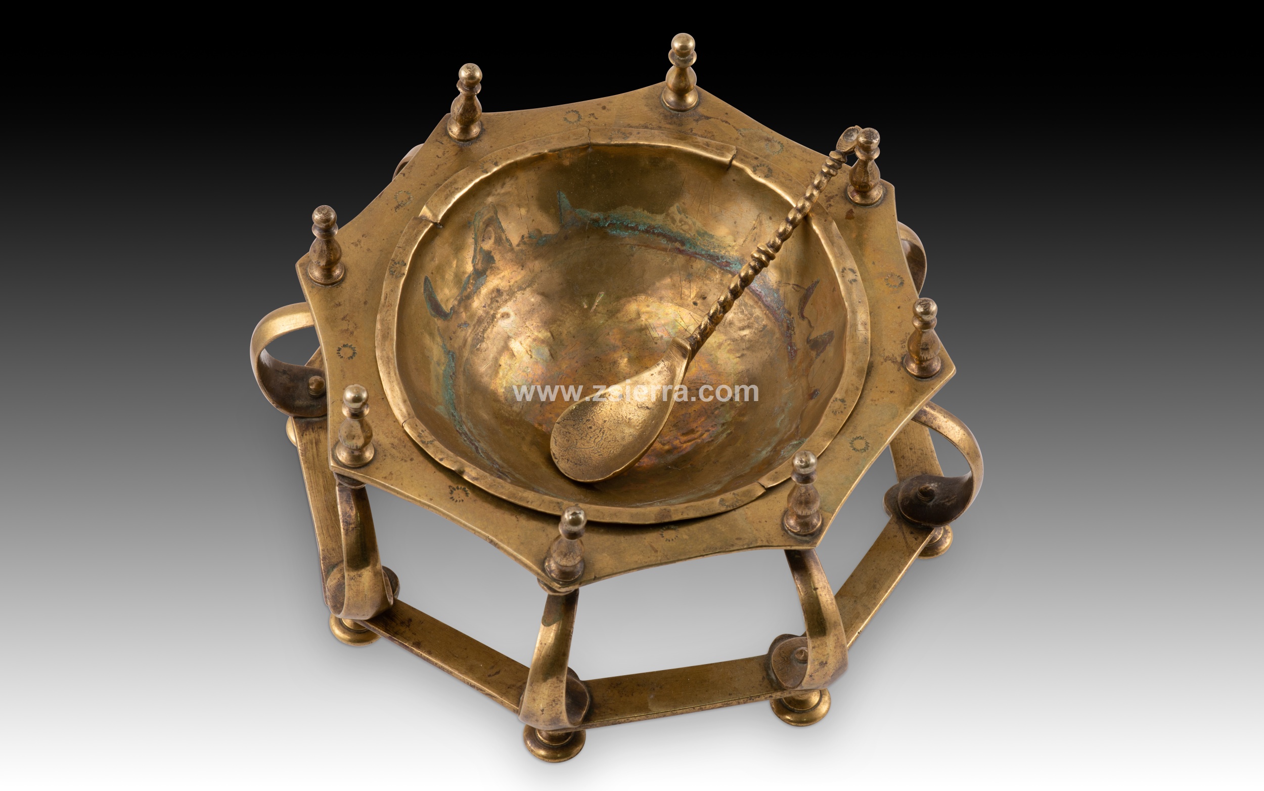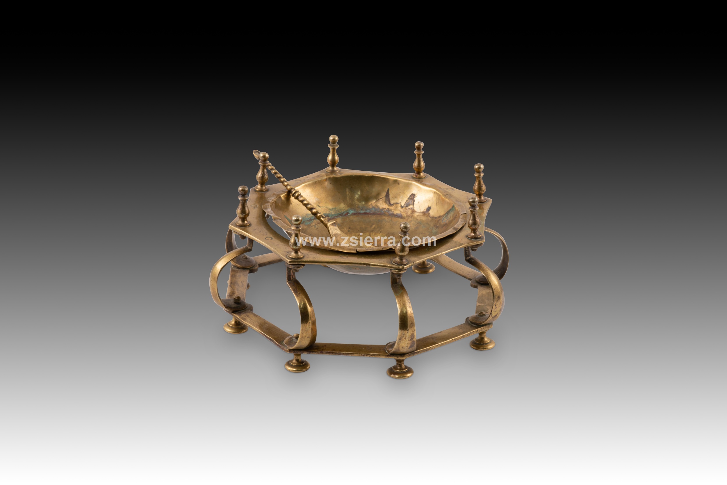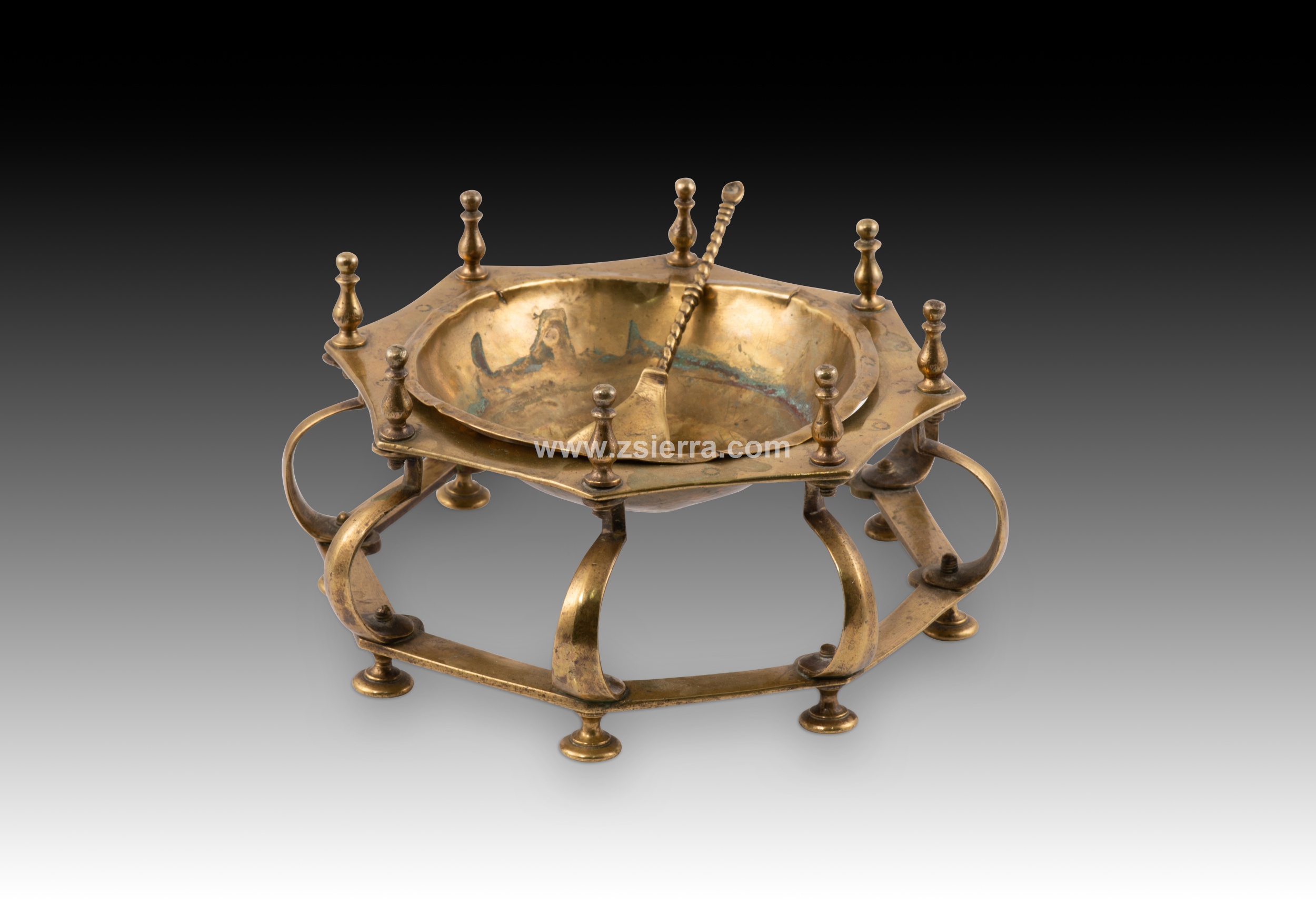 Hand or table brazier. Bronze. Spanish school, 17th century. A small brazier for use on a desk or dais, with circular legs, a polygonal shape, curved lines, and vase-like finials, reminiscent of Renaissance-era designs in some details. It includes a flat, twisted-handle spoon (called a "badila" in the case of braziers). These were often called hand braziers, referring to their use for warming scribes' hands in cold weather, but they were also used to heat wax for sealing wax, for example. This type is common in the Spanish school of the 17th century (and later), characterized by its composition of horizontal polygonal pieces separated by balustraded or column-like elements. Weight: 1200 grams.