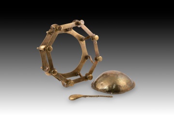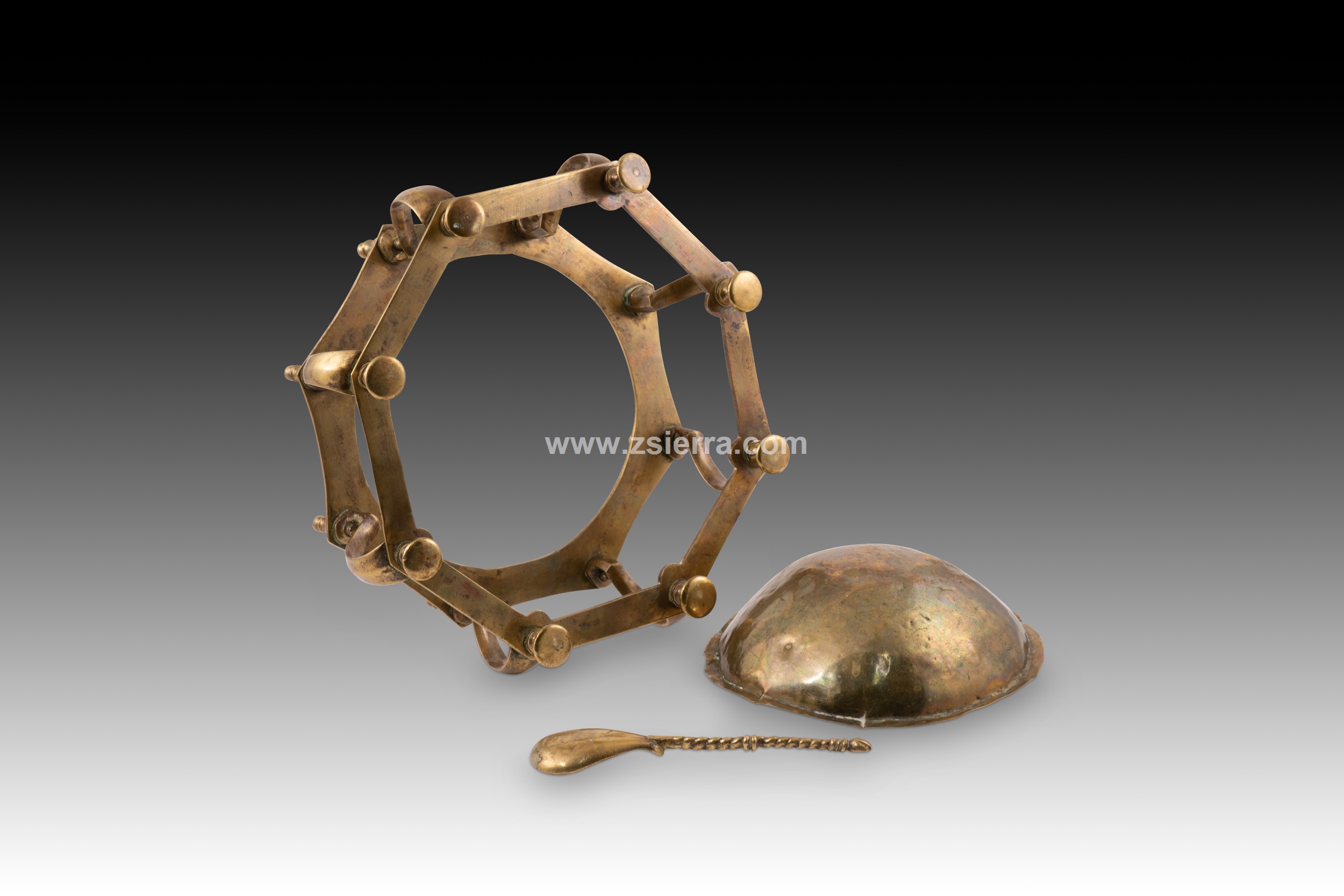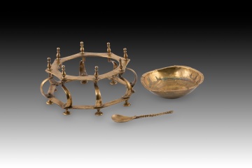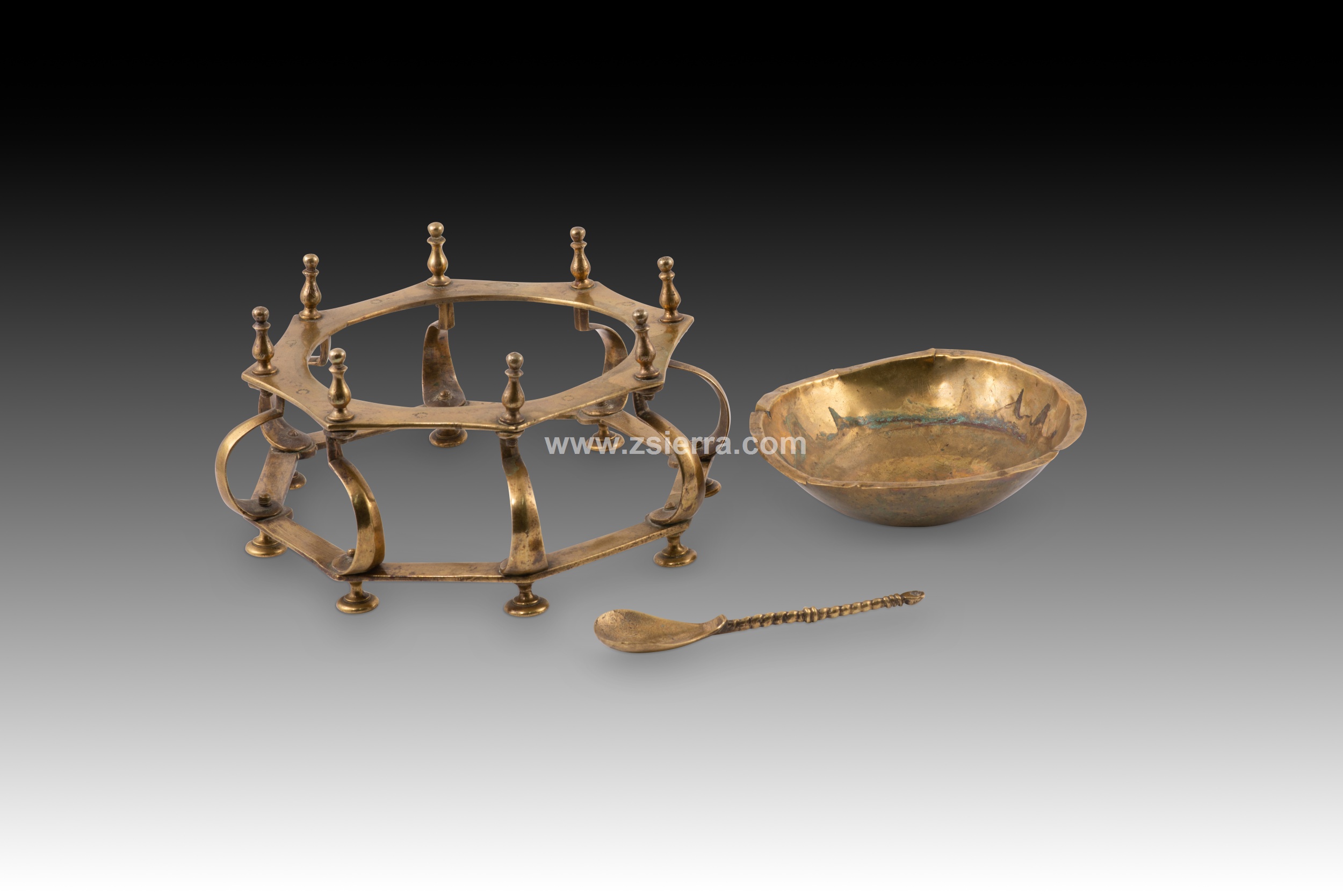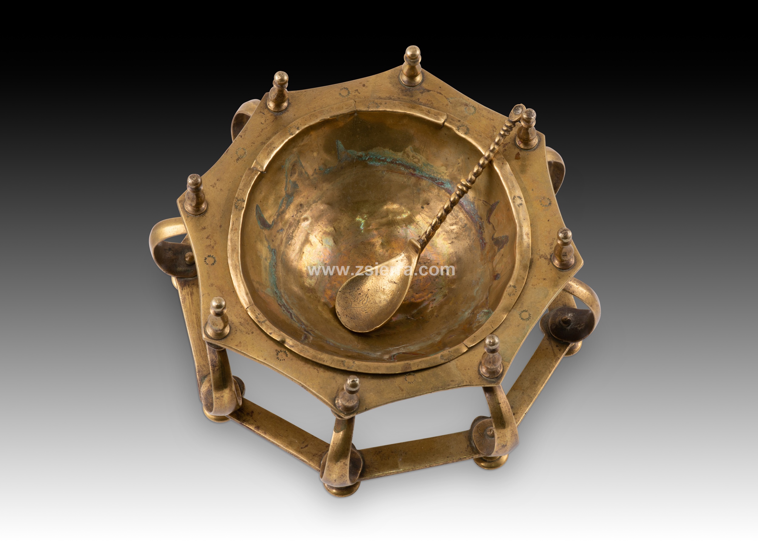 Hand or table brazier. Bronze. Spanish school, 17th century. A small brazier for use on a desk or dais, with circular legs, a polygonal shape, curved lines, and vase-like finials, reminiscent of Renaissance-era designs in some details. It includes a flat, twisted-handle spoon (called a "badila" in the case of braziers). These were often called hand braziers, referring to their use for warming scribes' hands in cold weather, but they were also used to heat wax for sealing wax, for example. This type is common in the Spanish school of the 17th century (and later), characterized by its composition of horizontal polygonal pieces separated by balustraded or column-like elements. Weight: 1200 grams.