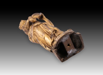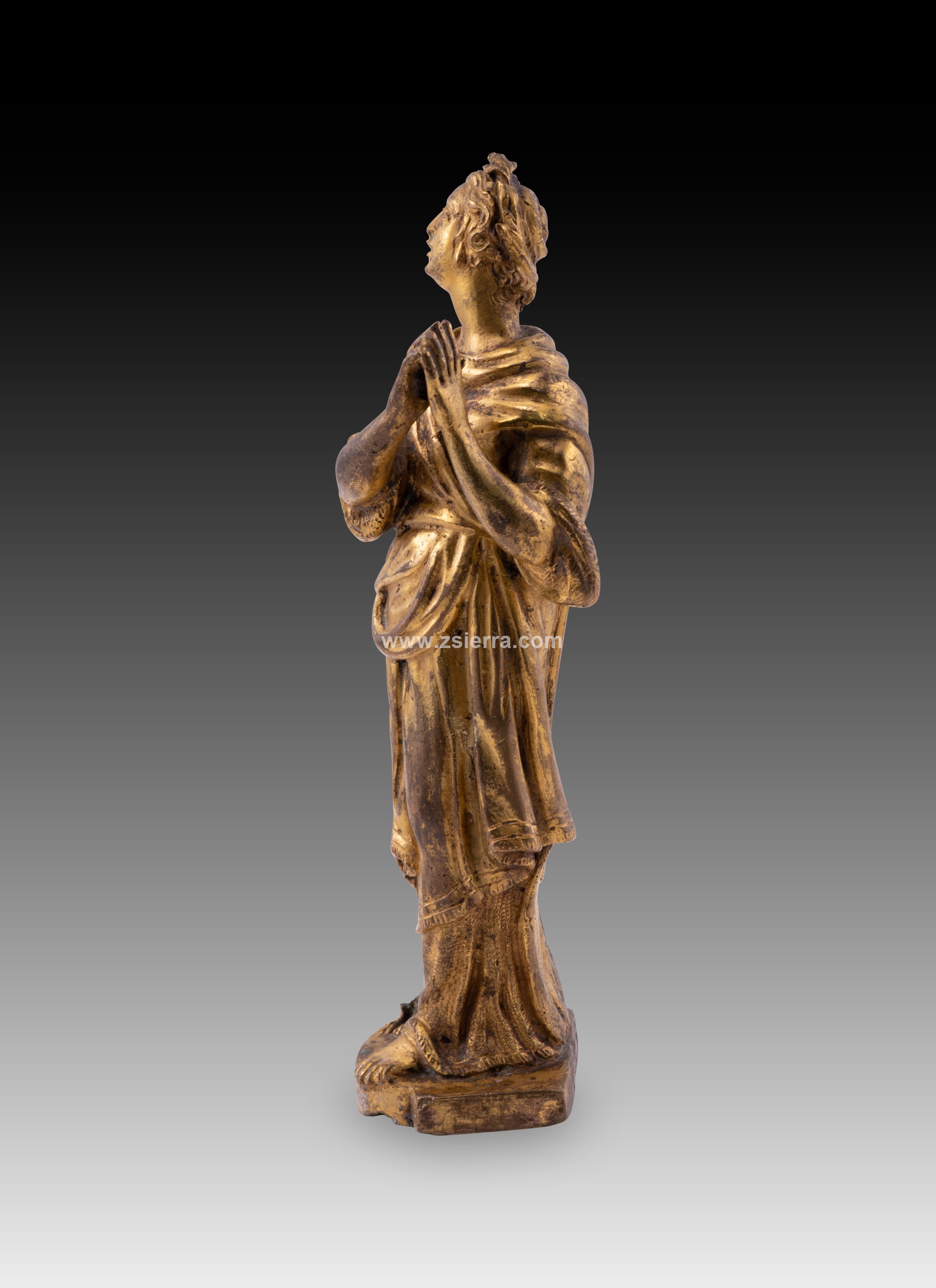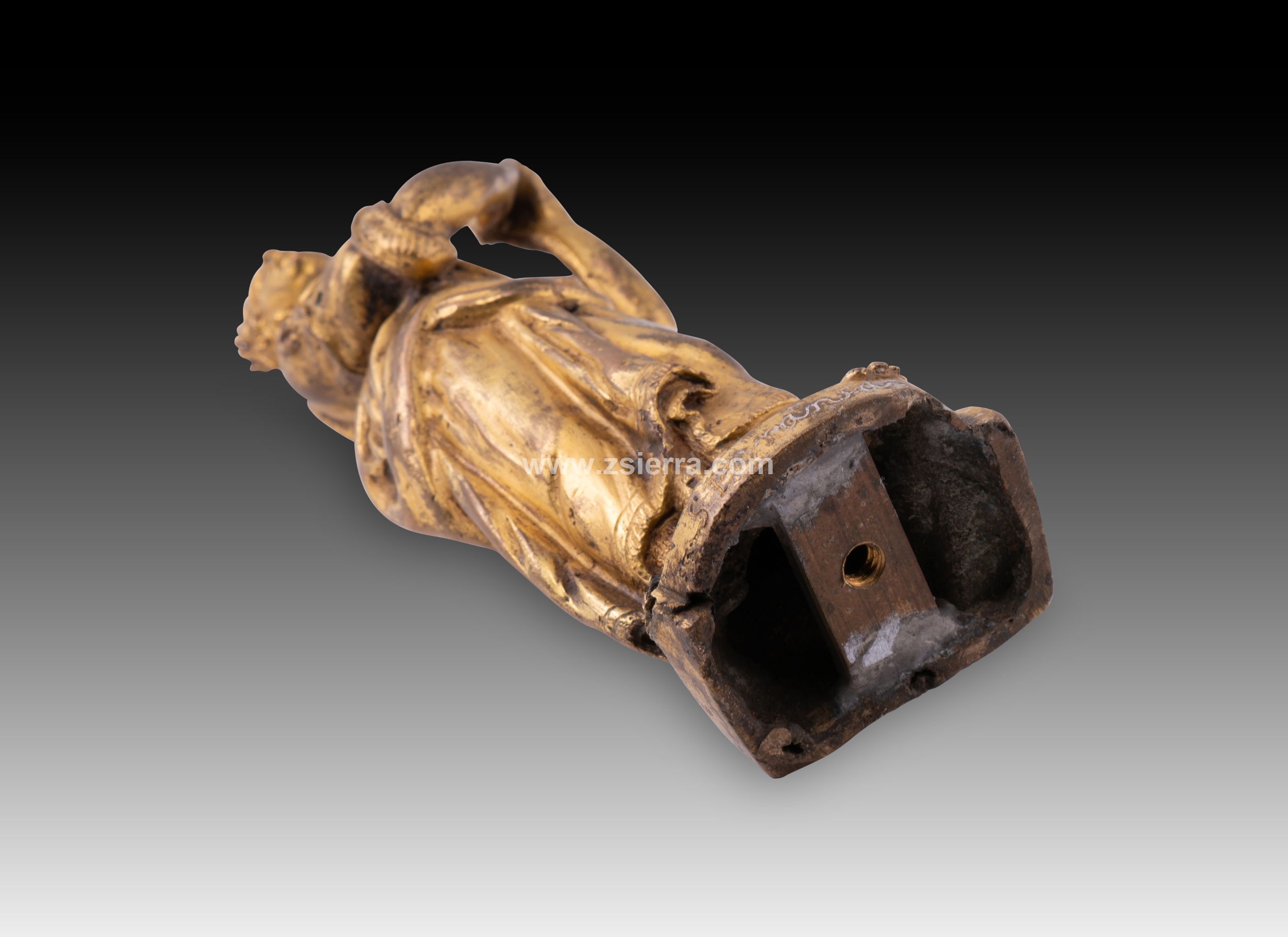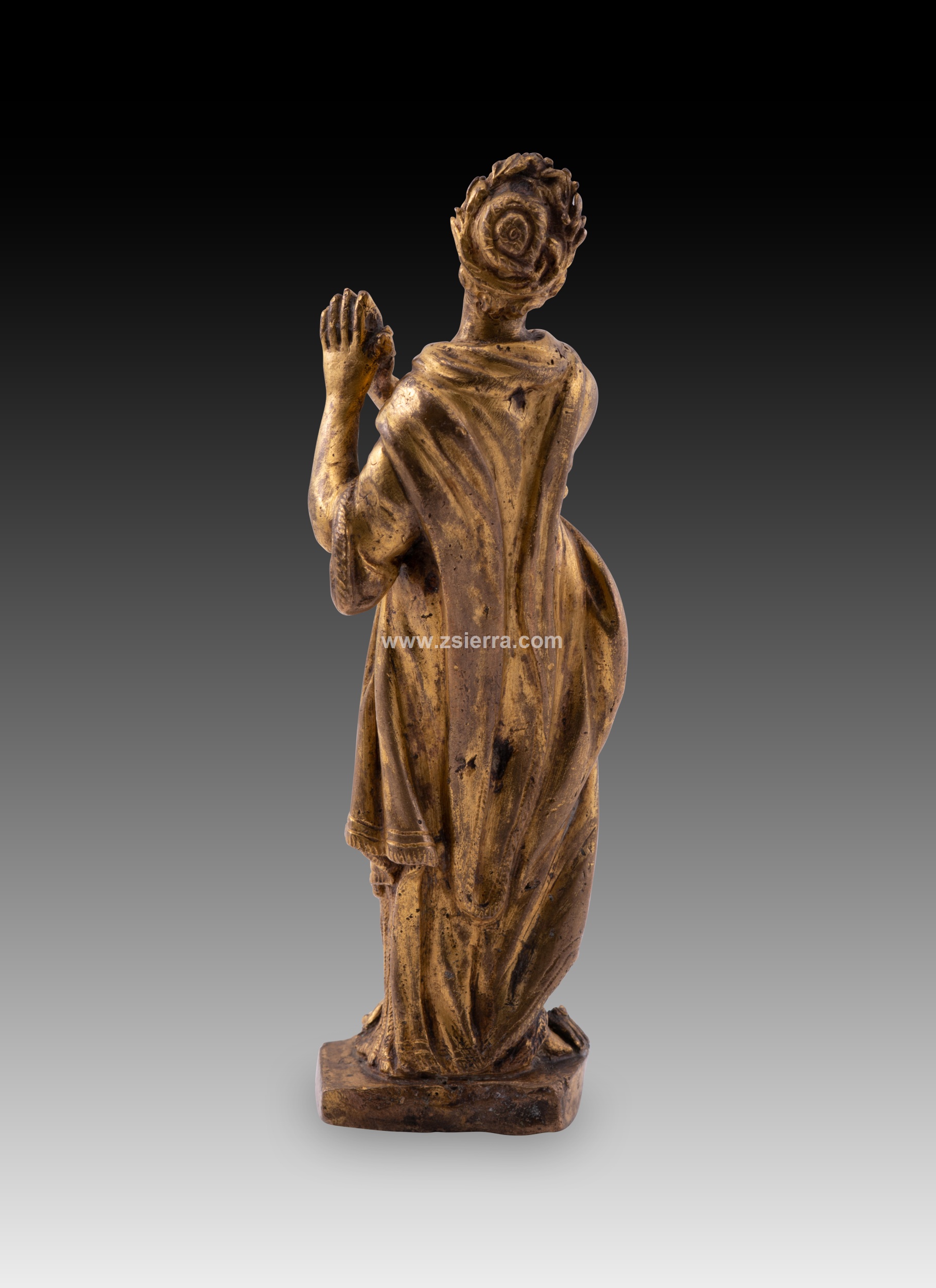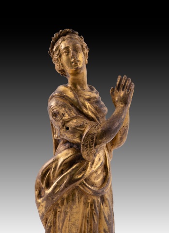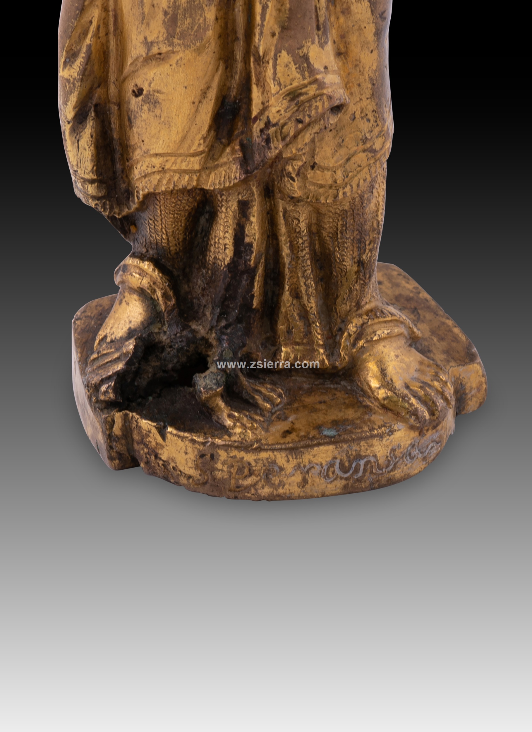 Hope. Gilded bronze. Possibly early 17th century, following the model of Juan de Bolonia (1529-1608). With inscription on base (“Speransa”). Minor flaws and restoration. A gilded bronze figure with a simple base engraved with the name of the allegory, depicting a young lady, joining her hands in a gesture of prayer, dressed in a tunic and cloak, barefoot and with a crown of leaves on her head. Iconographically, the allegory has been identified thanks to the inscription on the base (“Speransa,” meaning Hope), as it lacks any iconographic attributes beyond the aforementioned gesture of prayer. However, the inspiration and closeness of this figure to the allegory of Hope created between 1582 and 1584 by Giambologna (Douai, 1529 – Florence, 1608) for the Grimaldi Chapel in the church of San Francesco di Castelletto in Genoa is clear. This earlier work, now housed at the University of Genoa, was part of a set of six life-size bronze allegorical figures of Virtues. It is also worth mentioning the existence of several small gilded bronze sculptures made in Europe following models by Giambologna, such as the one in the Victoria & Albert Museum in London (inventory A.60-1956), which is 13.5 cm high and considered a German or Dutch creation from the first half of the 17th century. Weight: 606 grams.