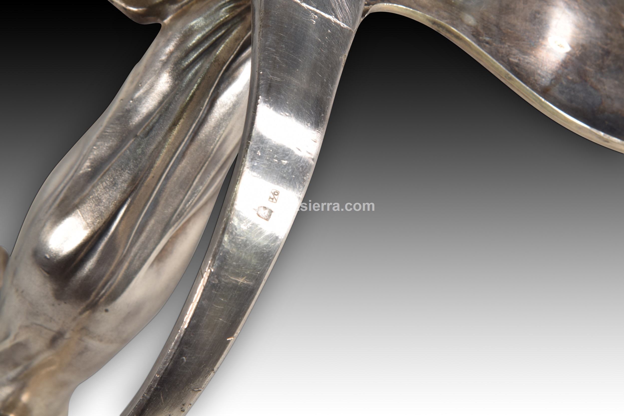 Bandeja formada por una base con tres huecos trabajada semejando una hoja. Su peciolo curvado hacia arriba sirve de apoyo a una figura femenina vestida con una túnica ondeando al viento. La delicadeza de los detalles, la inspiración en la naturaleza, las curvas, el protagonismo femenino, etc. responden al Modernismo.