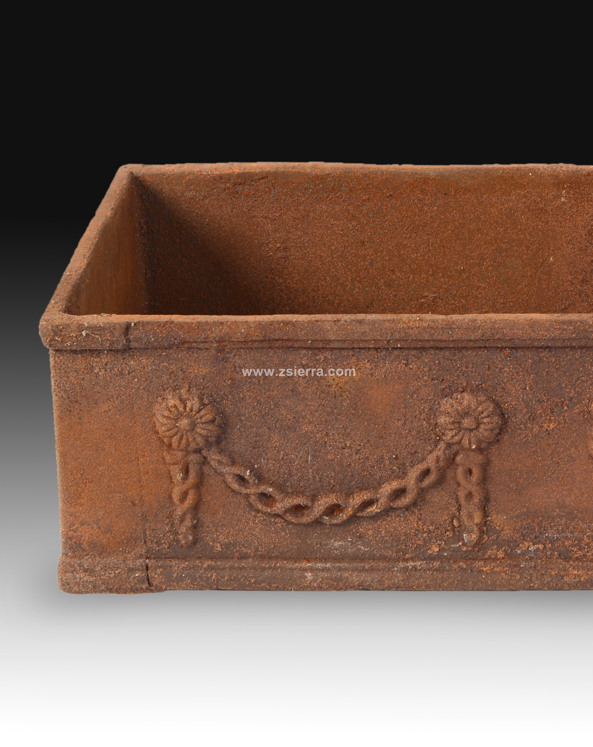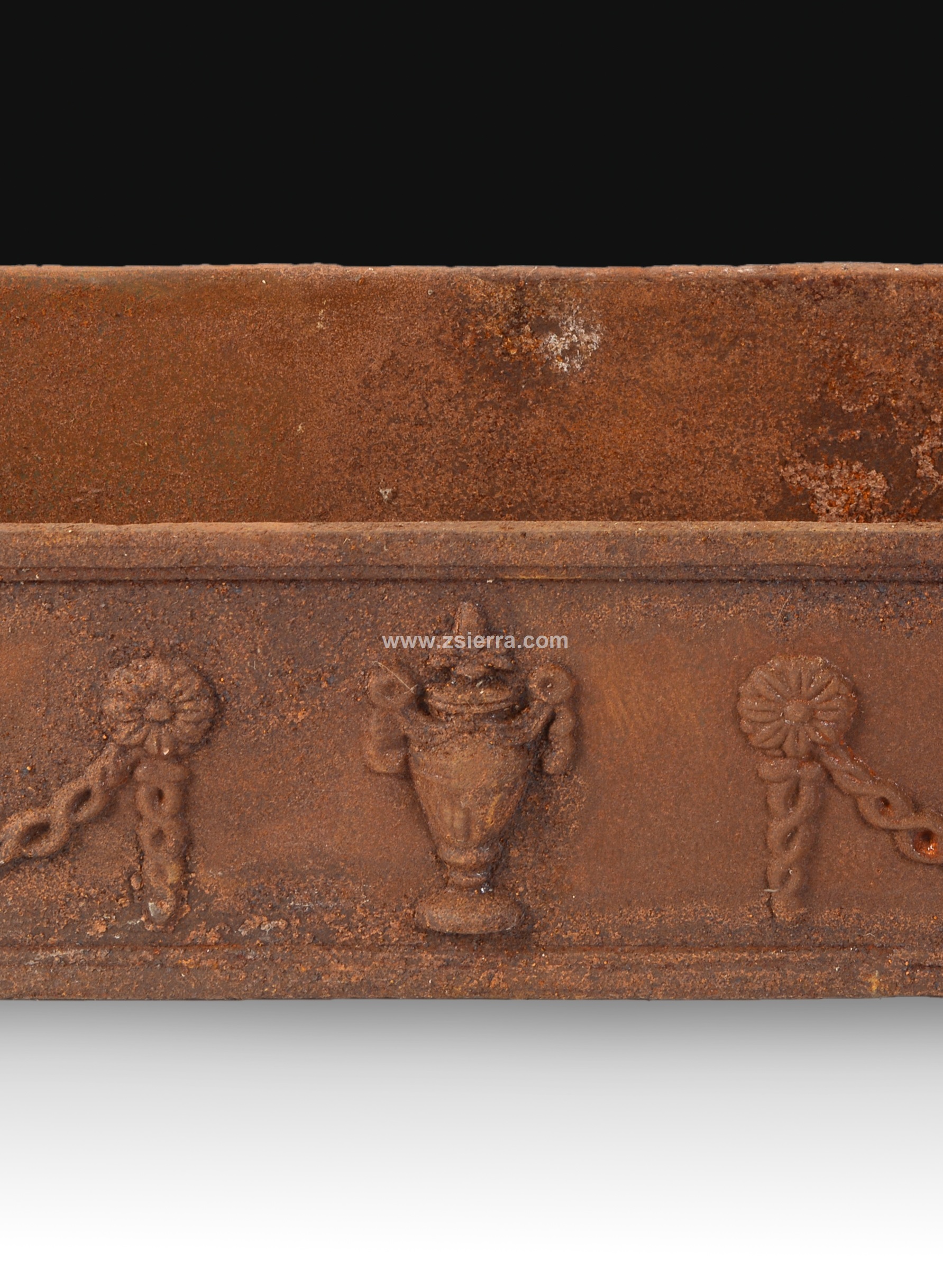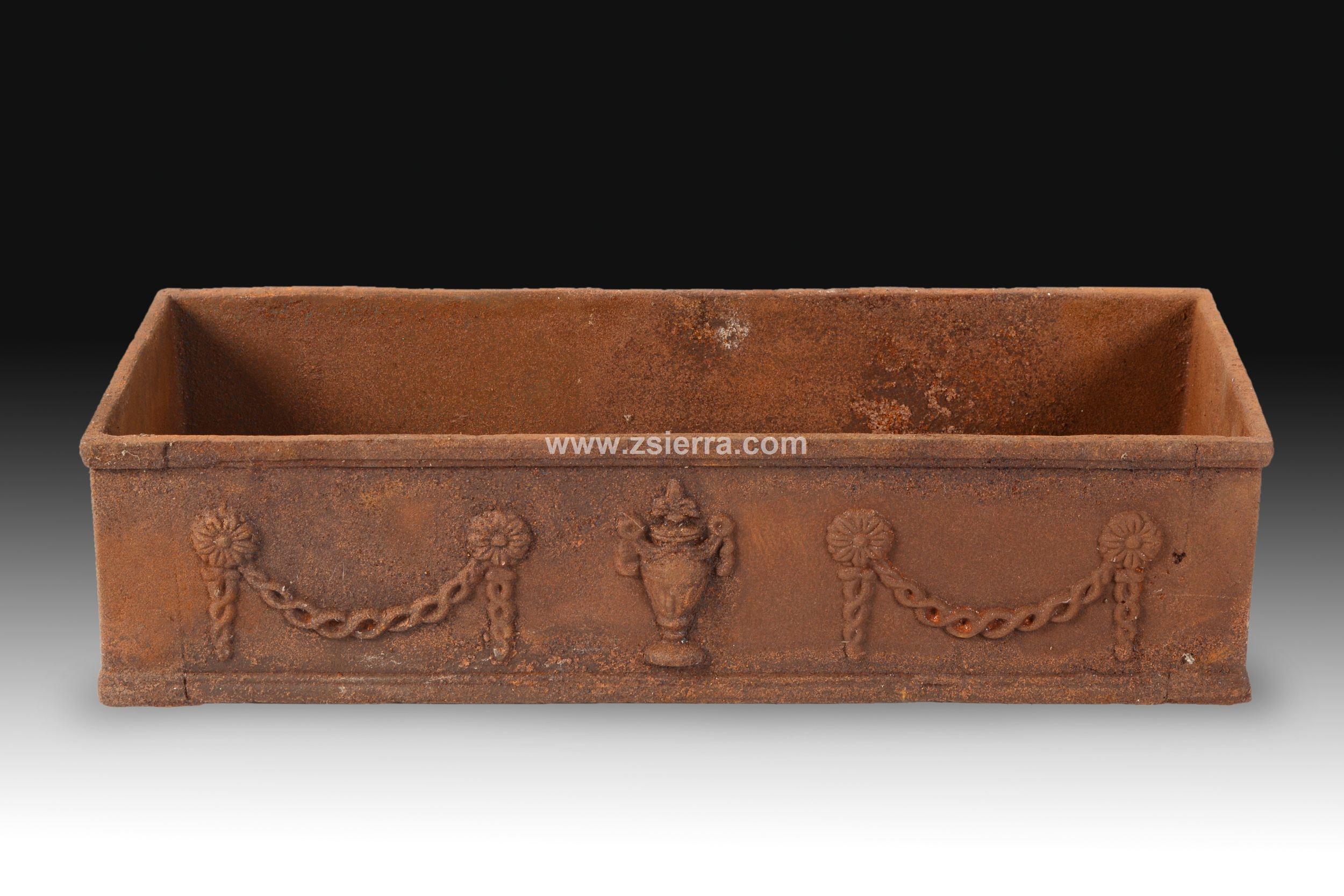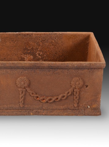 Jardinera rectangular realizada en hierro fundido decorada con guirnaldas de lazos, flores y un jarrón en el centro, dispuestos en una composición simétrica que recuerda ligeramente a piezas del siglo XIX.