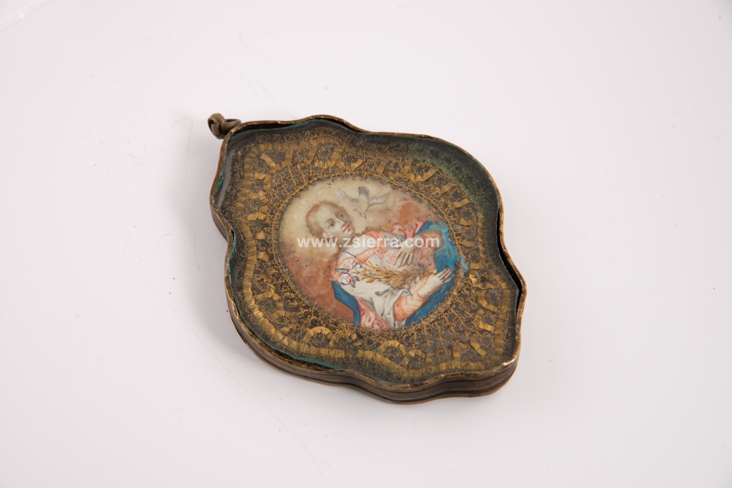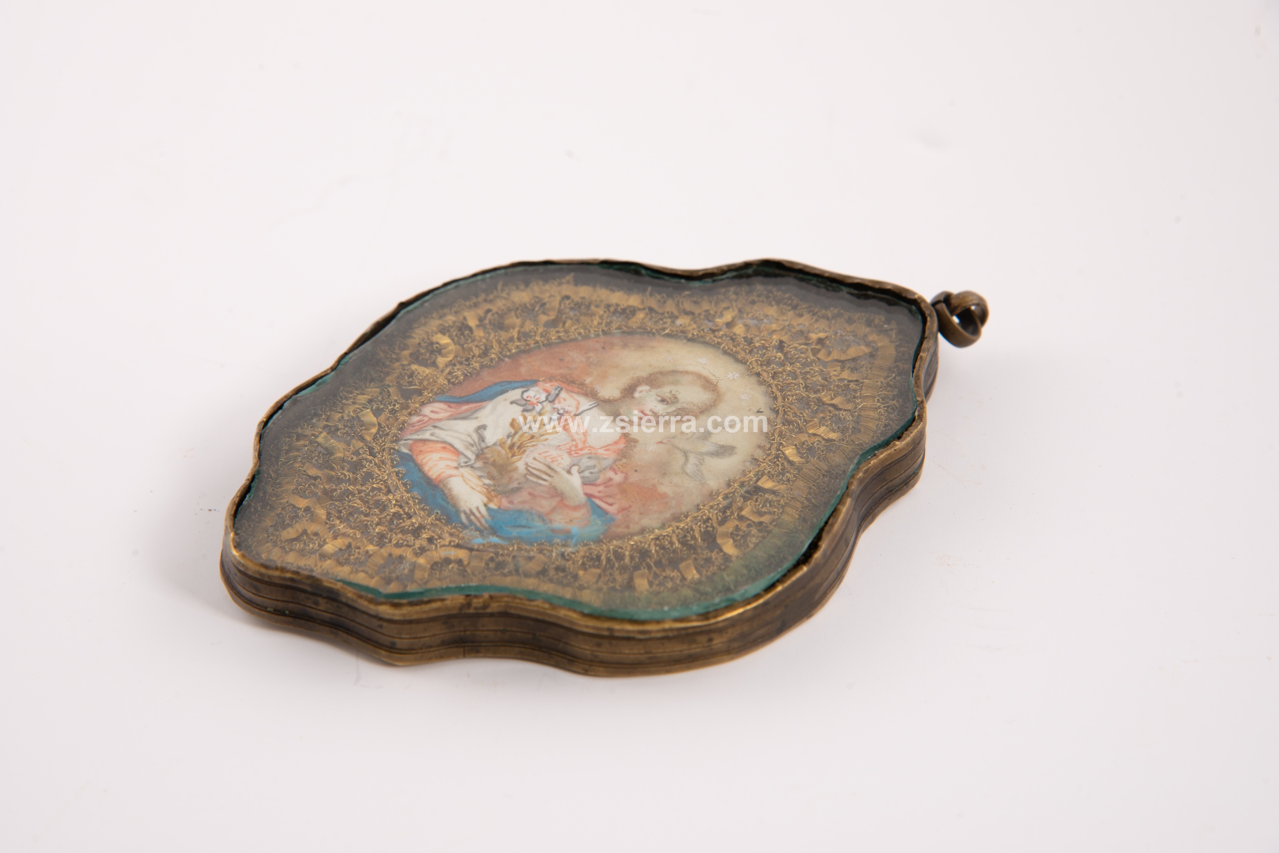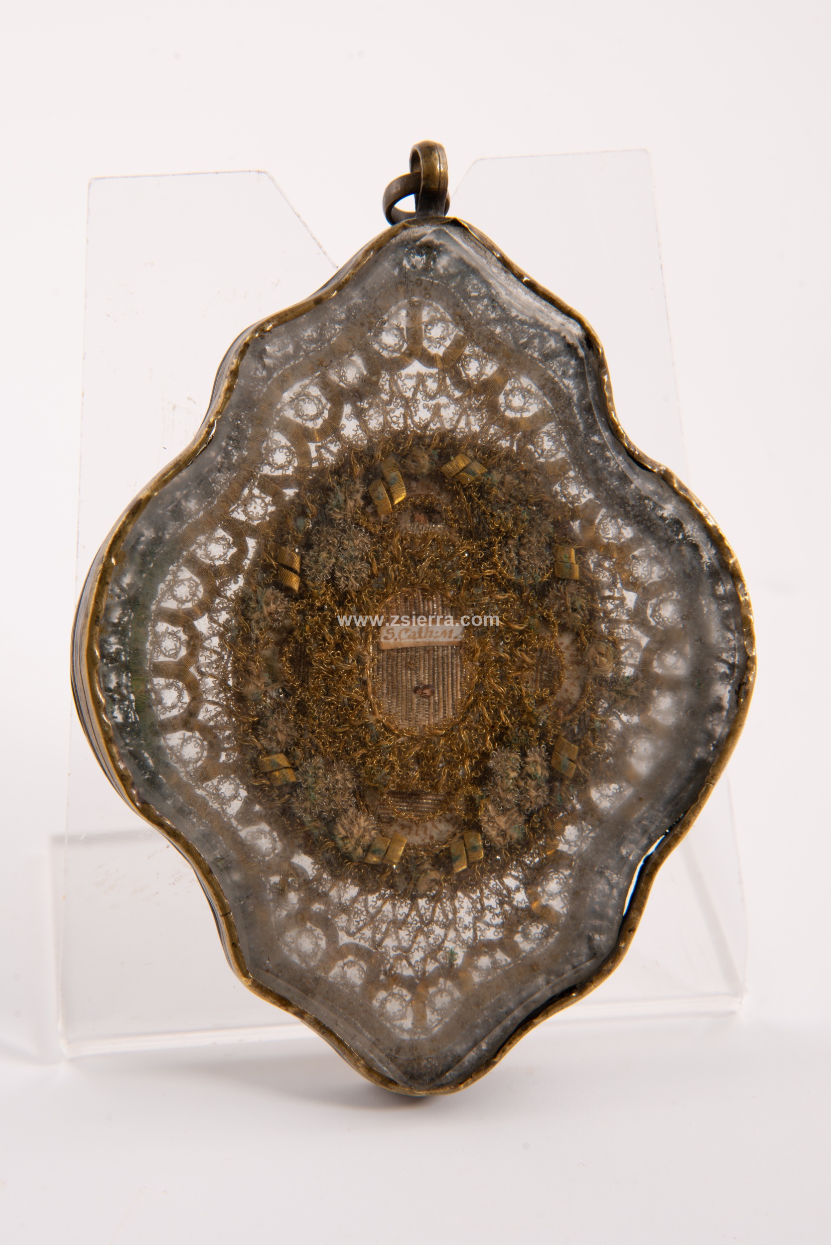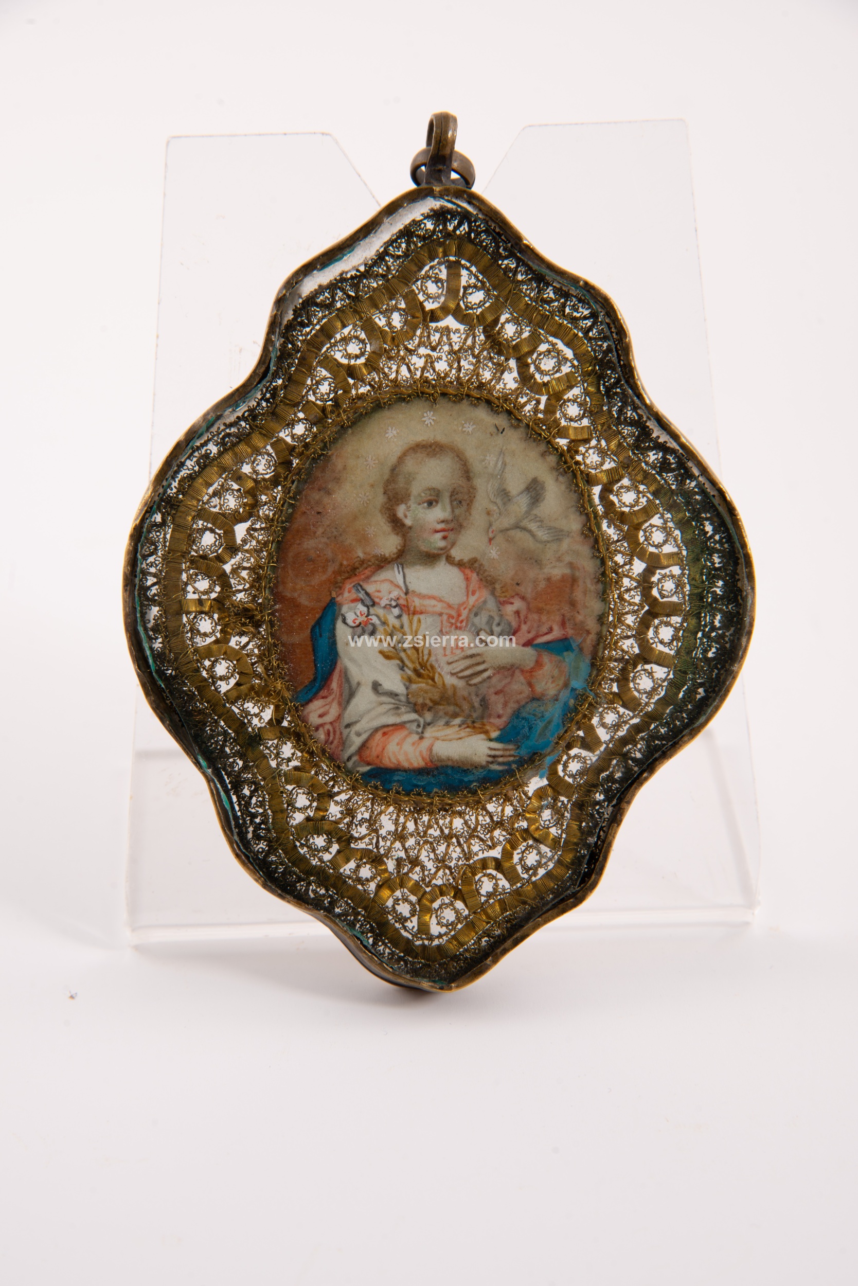 Posible trabajo conventual que presenta una miniatura con un delicado trabaje de encaje y metal alrededor, guardado en un medallón de metal con frente y trasera de vidrio recortado creando ondas en el contorno. En la miniatura se puede ver por un lado a una joven acompañada por la paloma del Espíritu Santo, con un ramo con flores blancas y el emblema IHS rematado por cruz en un tondo sobre su pecho; el otro lado presenta una reliquia identificada con una pequeña cartela escrita (S. Cath. M.). Sajta Catalina de Siena (1347-1380) fue una laica dominica venerada como santa en la Iglesia católica desde su canonización en 1461.