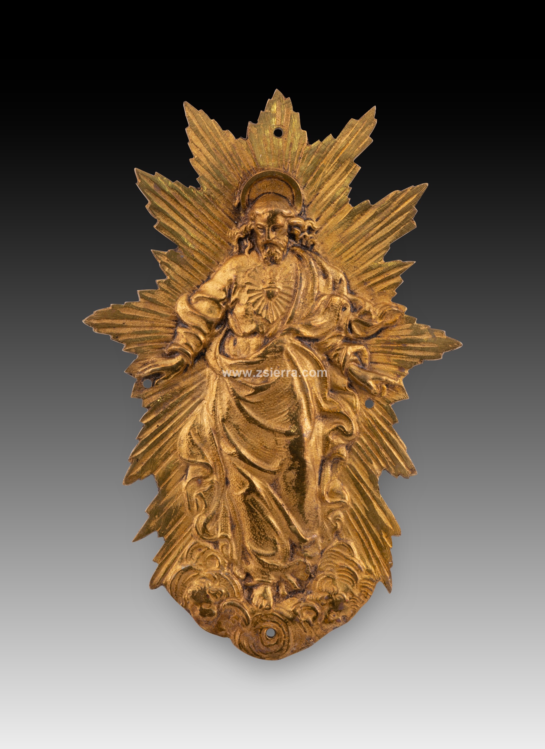 Placa de metal con agujeros para colocarla en una puerta o elemento similar que presenta al Sagrado Corazón de Jesús, una devoción católica referida al corazón de Jesucristo como símbolo de amor divino que ya tuvo divulgación en Europa en el siglo XIII, con nombres como San Alberto Magno o Santa Lutgarda de Tongres, y muy extendida después por cartujos y jesuitas principalmente. En esta devoción se insertan, por ejemplo, las apariciones de Fátima de 1917 y el Templo Expiatorio del Sagrado Corazón en Barcelona (Tibidabo). En España se convirtió en costumbre común desde finales del siglo XIX y, sobre todo, desde 1919 (consagración al Sagrado Corazón del monumento del Cerro de los Ángeles en Getafe, Madrid, España), el colocar en las puertas de las casas o en las entradas placas dedicadas al Sagrado Corazón. Peso: 169 gramos.