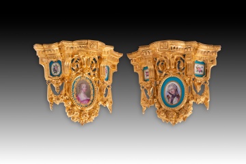 Pareja de jarrones de vidrio rojodecorados con áreas de esmaltado blanco y espacios en dorado, realzando los dos bustos femeninos (prácticamente retratos sobre fondo indefinido) que presentan ambas piezas en sus frentes. Las dos asas elevadas y rematadas en círculo presentan una decoración fina de elementos vegetales simplificados; el vidrio muestra decoración del mismo tipo, pero de influencia distinta (más clasicista); los bustos se han realzado mediante sendos marcos en dorado y líneas oscuras de claro recuerdo clasicista; las zonas blancas (con formas vegetales) presentan líneas doradas.