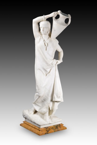 Base para escultura realizada en madera tallada y sobredorada de forma rectangular y plana, ligeramente elevada sobre patas circulares y decorada al frente y a los laterales con elementos vegetales y arquitectónicos tallados de clara influencia clasicista y líneas barrocas. La parte superior tiene la madera vista, y, al darle la vuelta, se ve que el dorso está sin dorar y que es hueca. Peso: 9,5 kg.