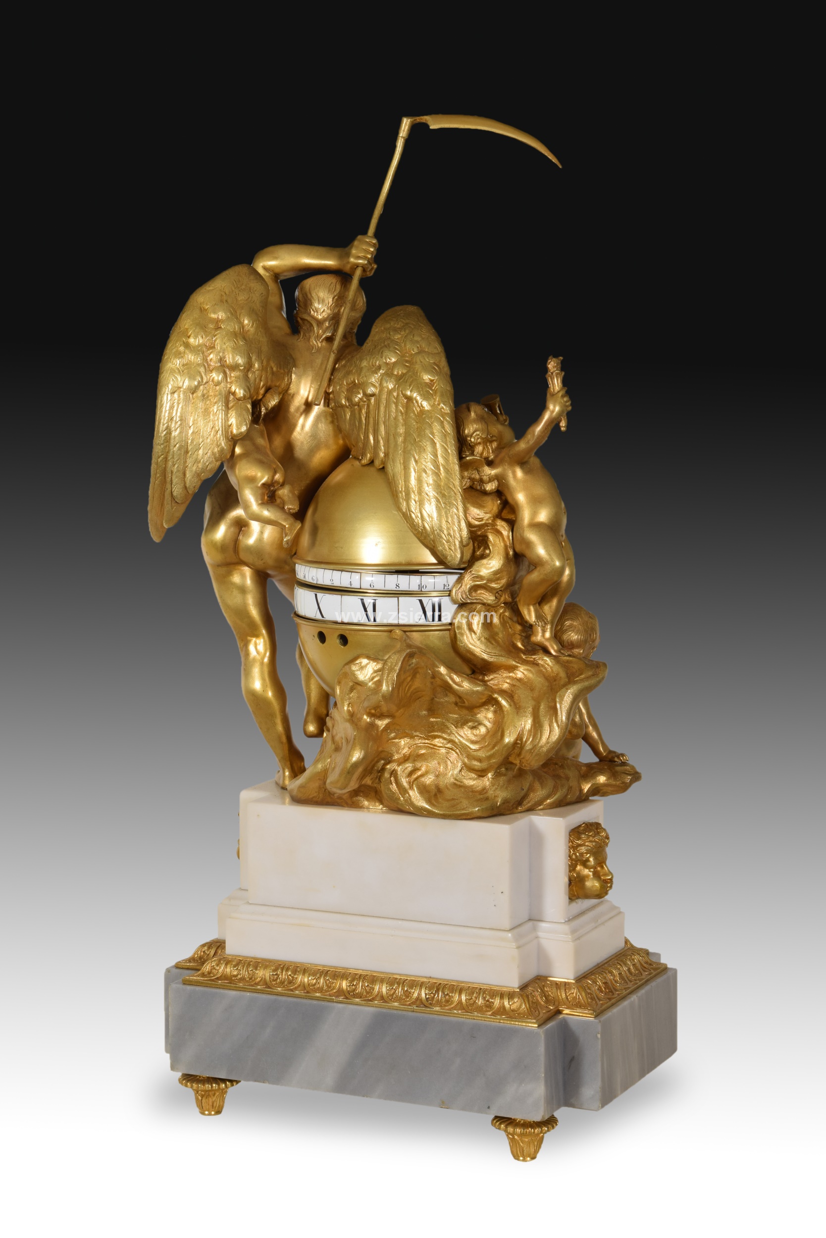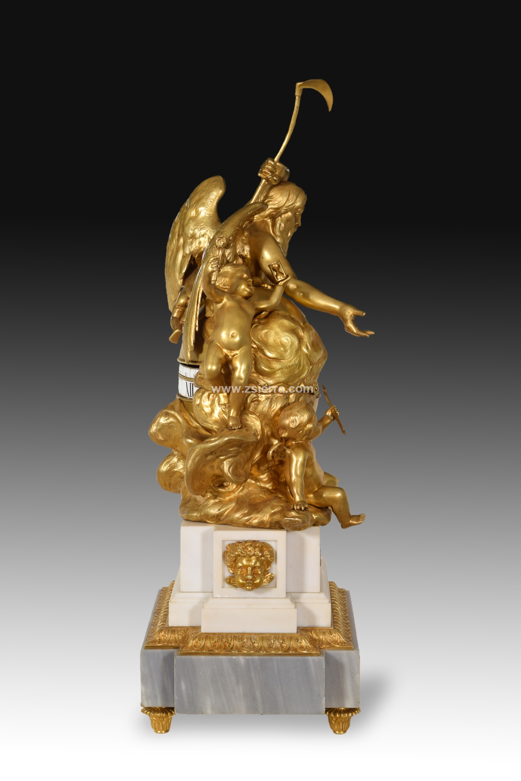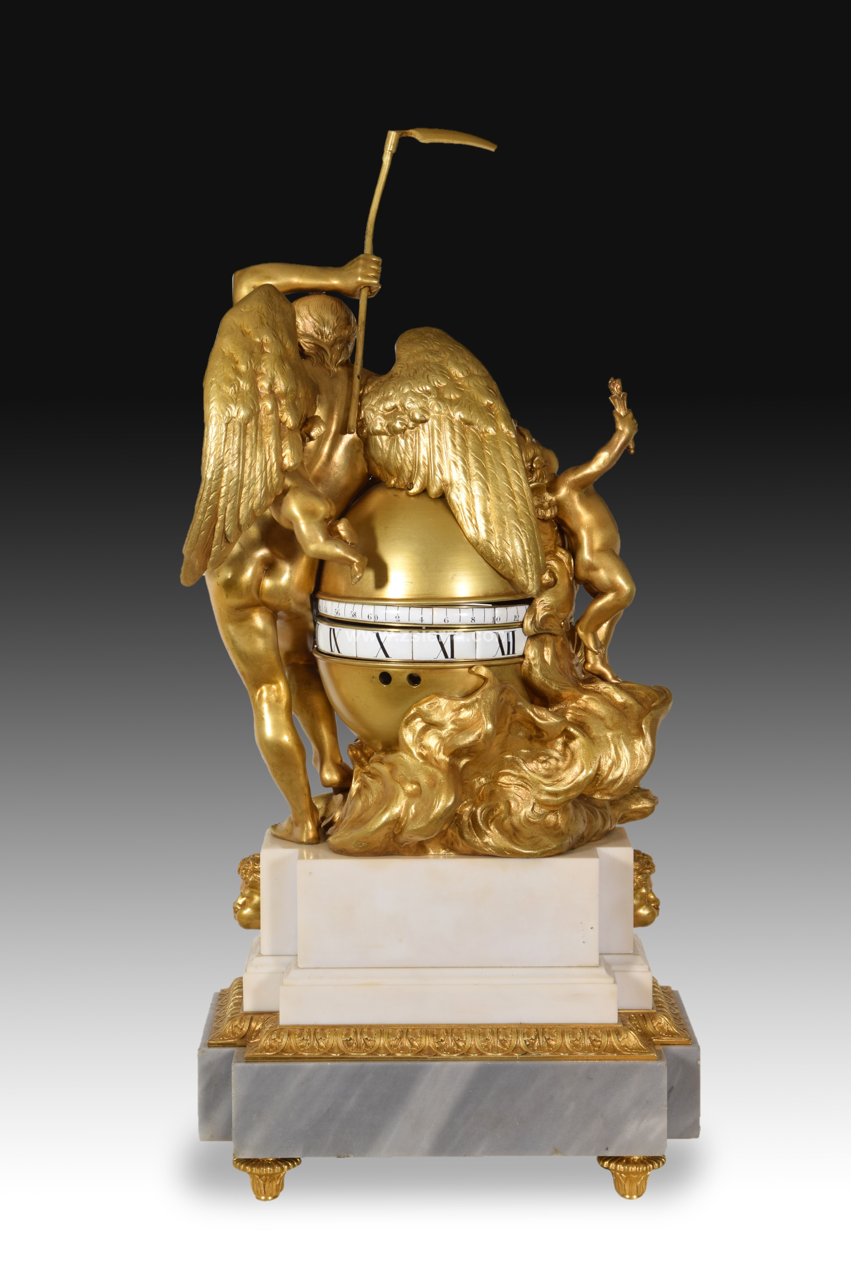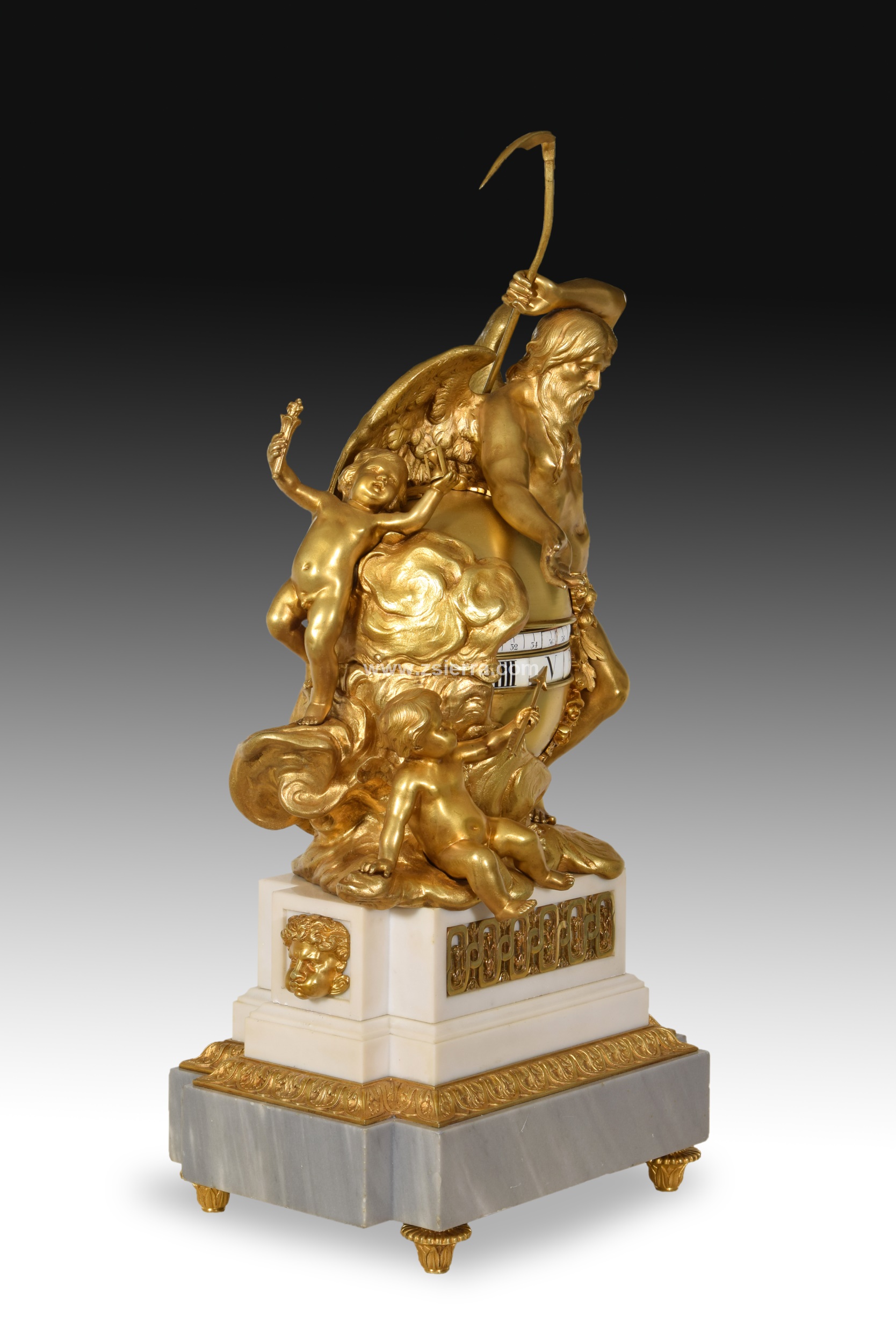 Reloj de mesa compuesto por una base escalonada de piedra tallada decorada con elementos en bronce dorado de inspiración clasicista y elevada sobre patas, y una composición de bronce sobredorado con varias figuras mitológicas. A un lado, un hombre de cierta edad, barbado, sostiene en alto una guadaña, y tiene un niño alado a su espalda; al otro lado de la esfera aparecen dos niños alados, uno con una flecha y el otro con un reloj de arena y una antorcha. Esa esfera mencionada contiene el movimiento del reloj, con las horas y minutos dispuestos en dos franjas blancas, con el sistema conocido como “cercles tournant” o “candran tournant”.
