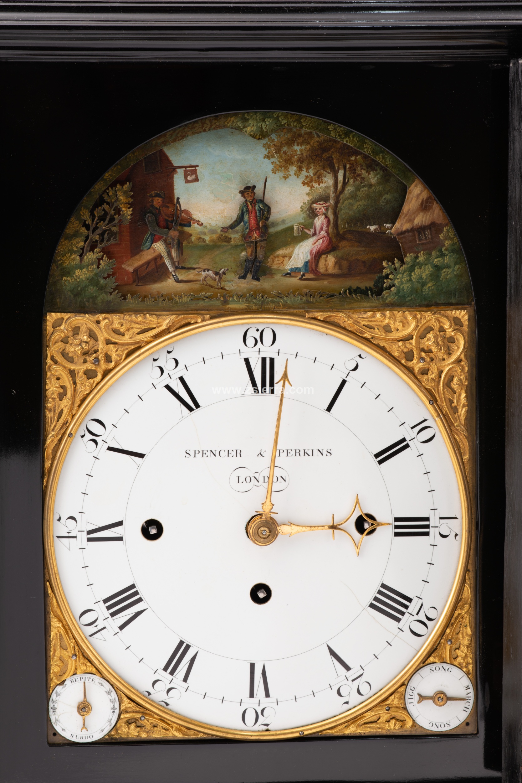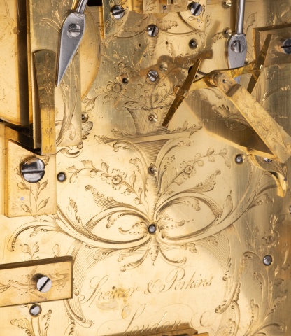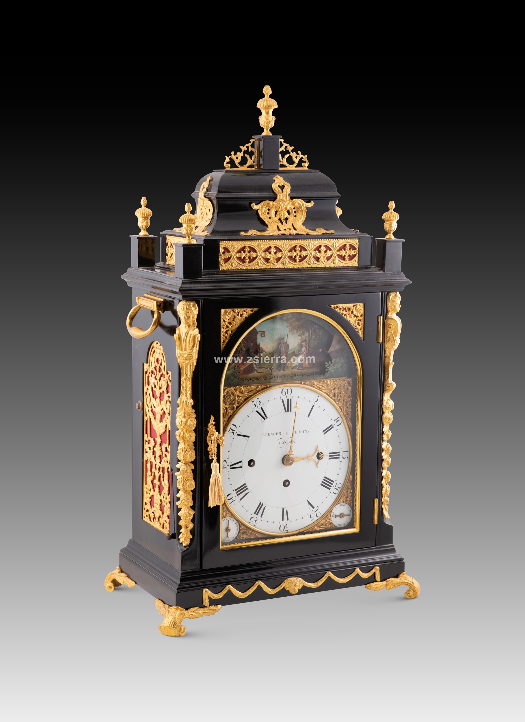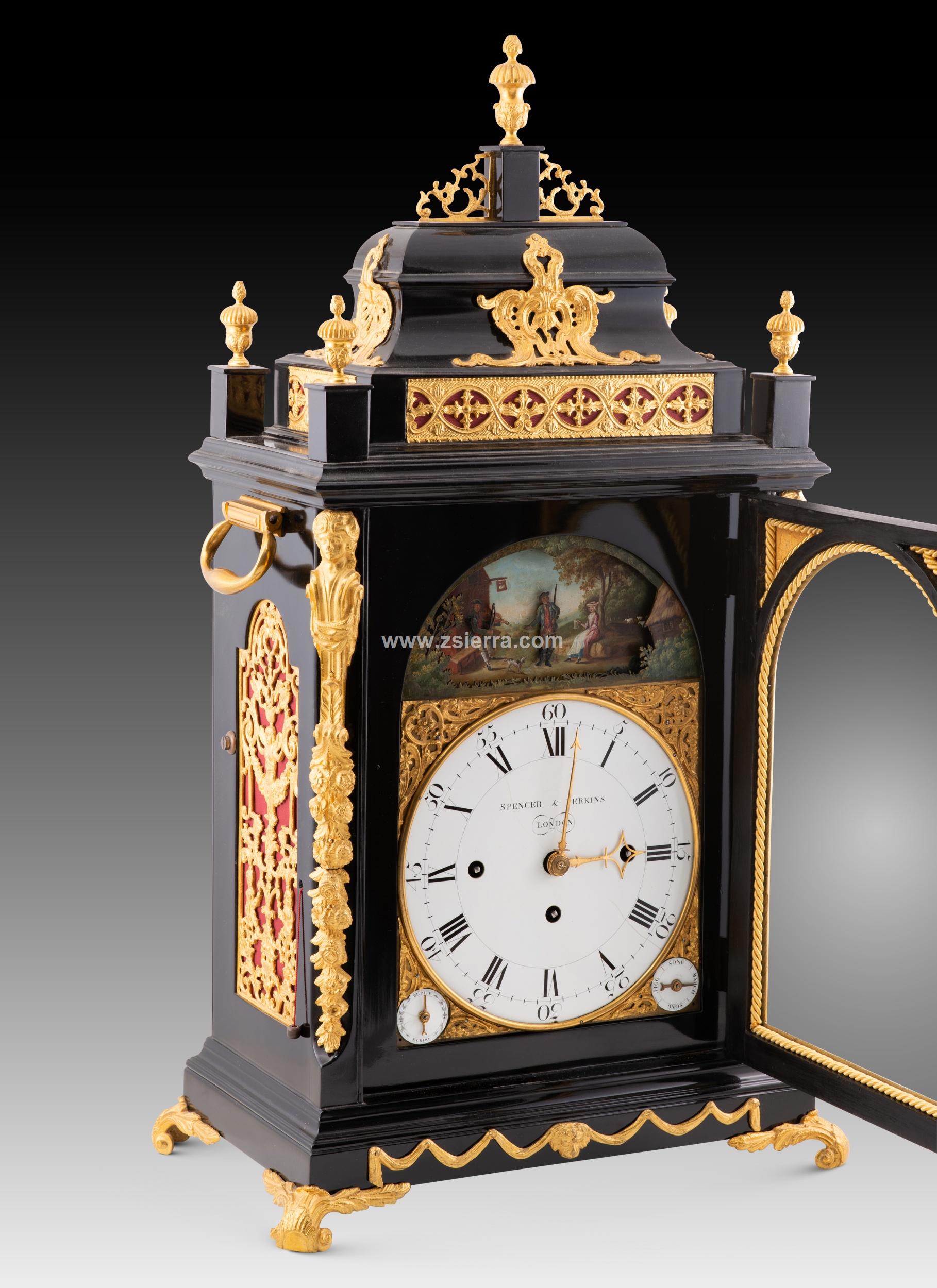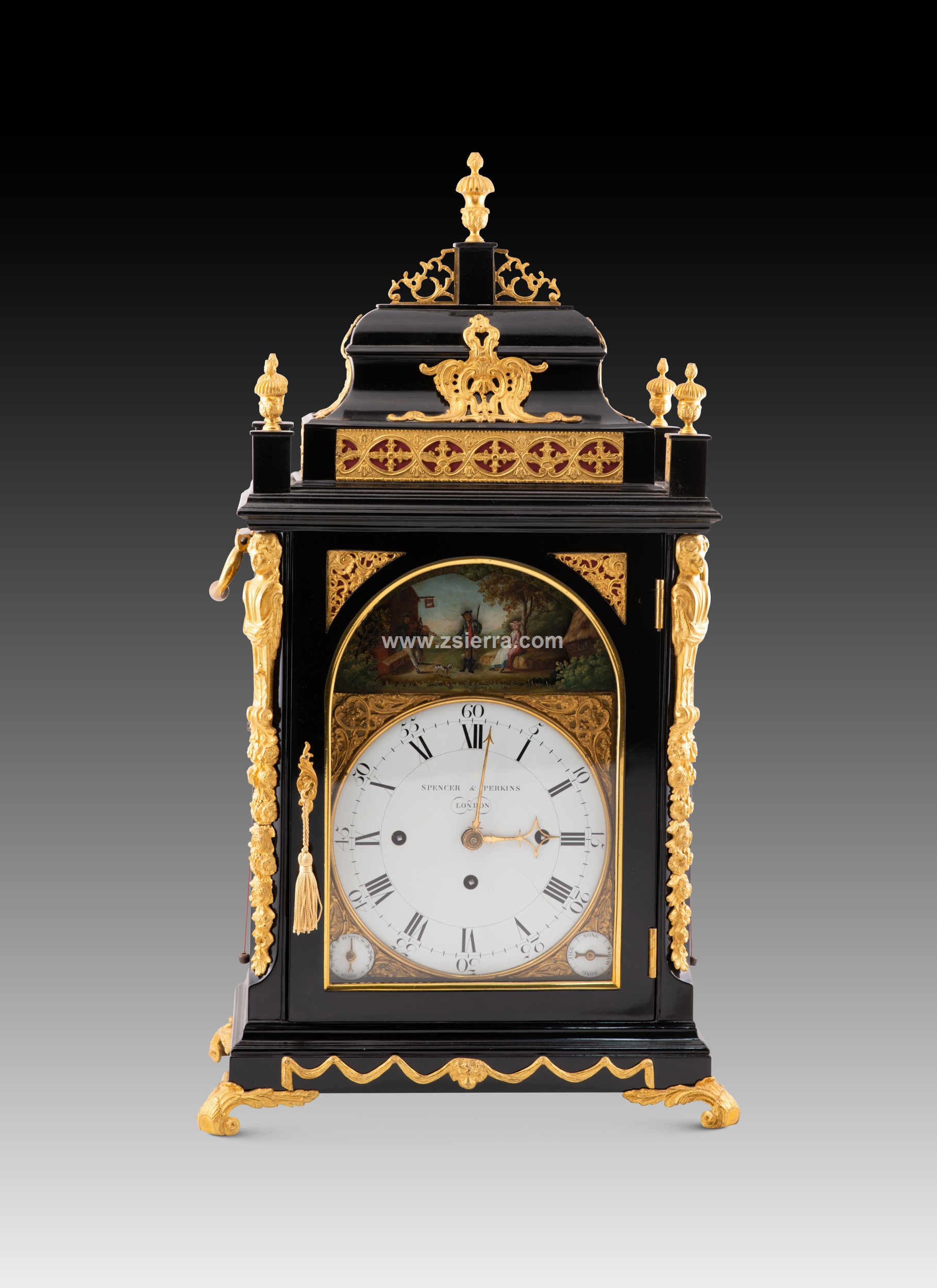Cuenta con opción de música a la vez que se mueven los autómatas y la sonería habitual de este tipo de piezas en las horas. Los relojeros Spencer & Perkins trabajaron entre 1765 y 1806 en Londres (en el 44 de Snow Hill). La relojería inglesa alcanzó una gran perfección técnica que se traduce en la precisión de la maquinaria y los modelos destacan por la sobriedad y la pureza de las líneas frente a la relojería francesa.
